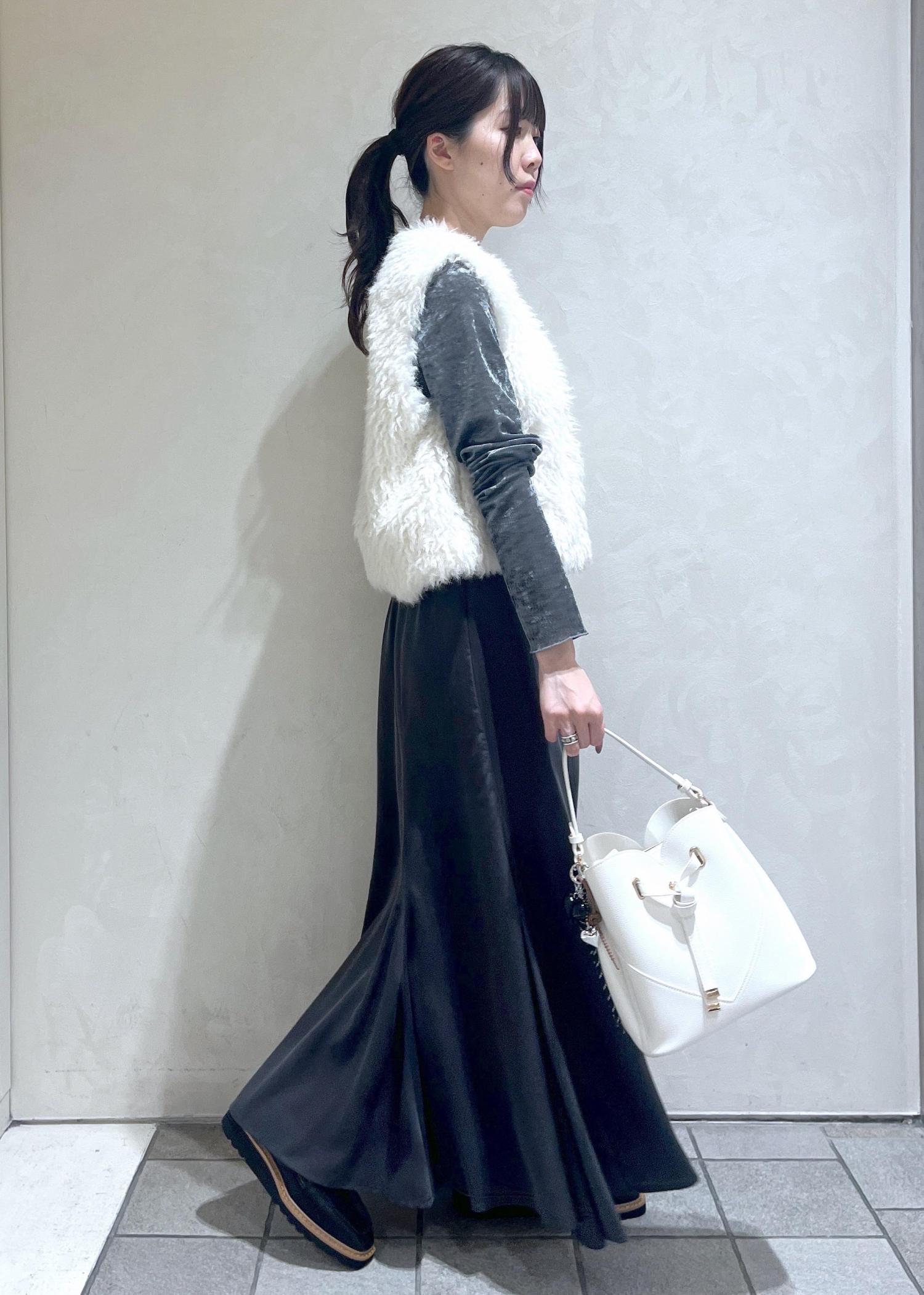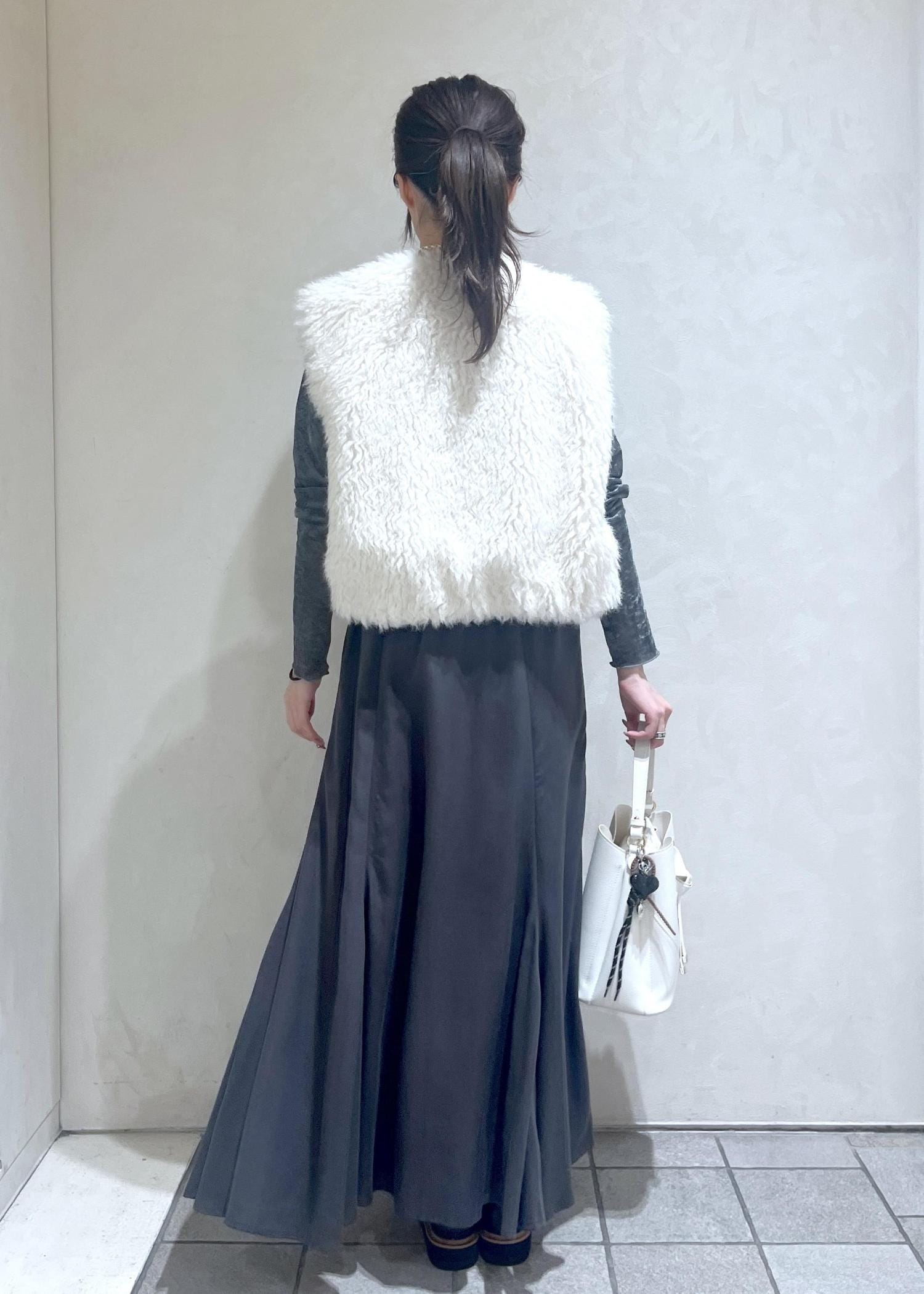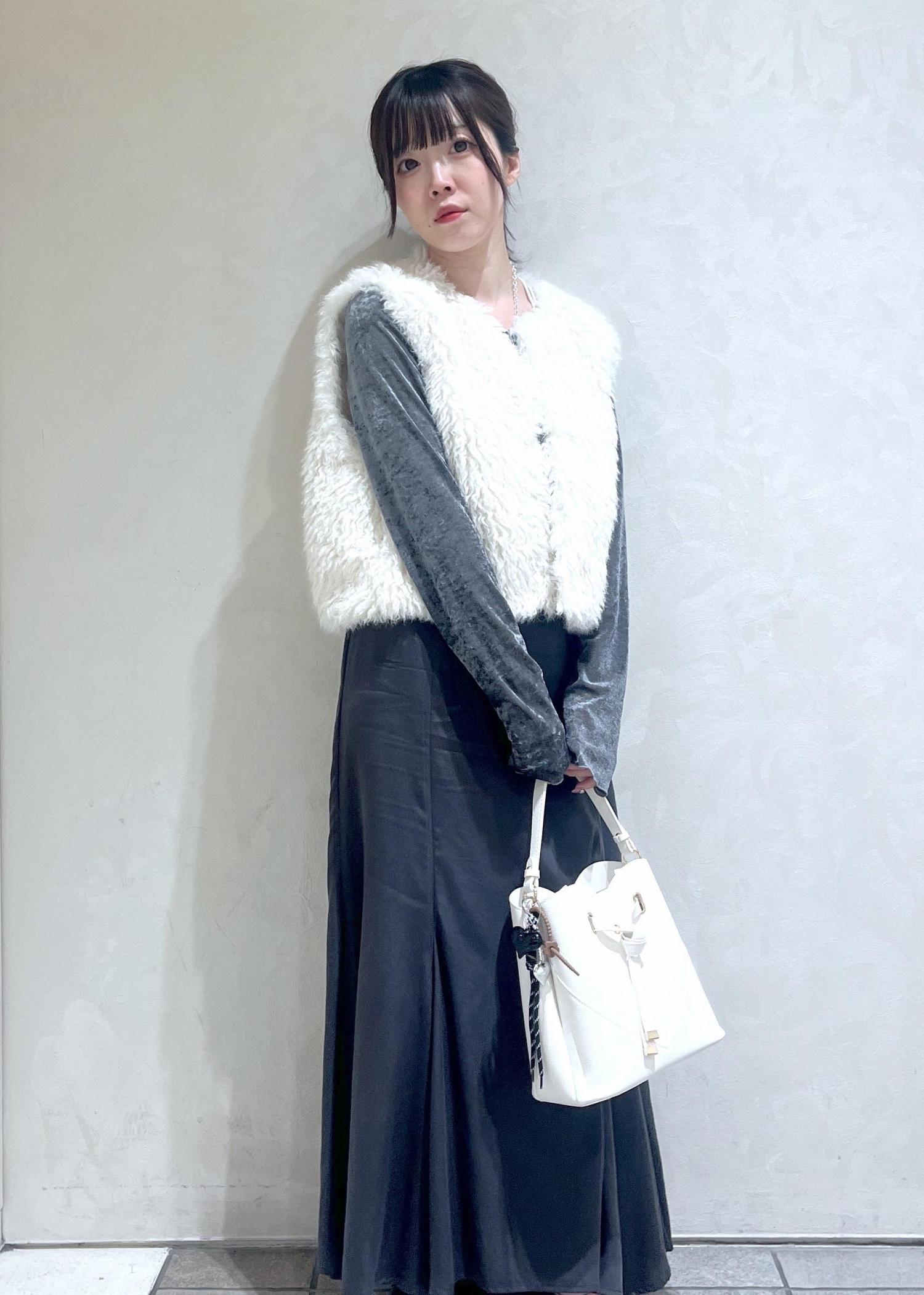 白くてふわふわのファーベストに他のアイテムをグレーで統一してキレイめ大人コーデを組んでみました!