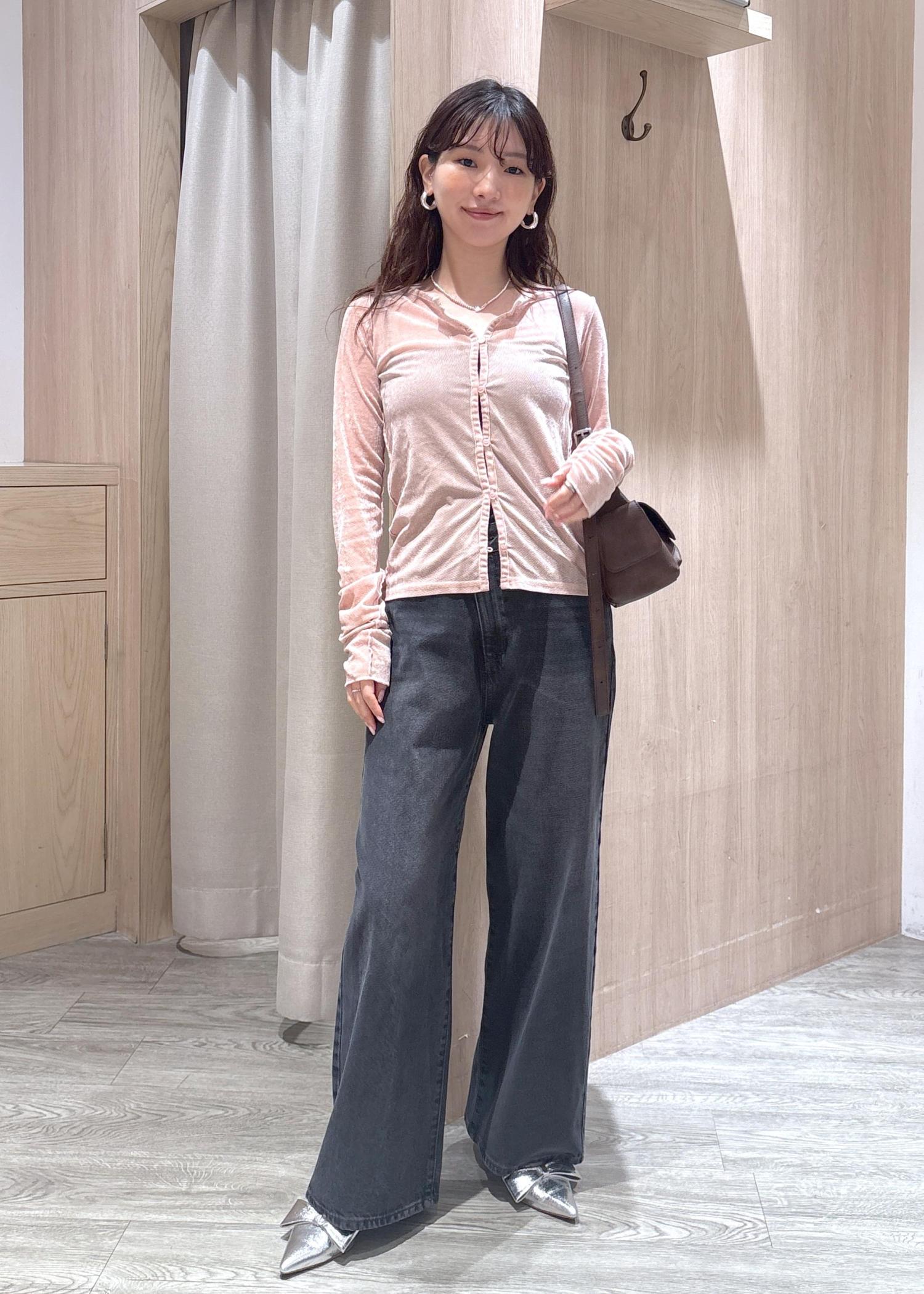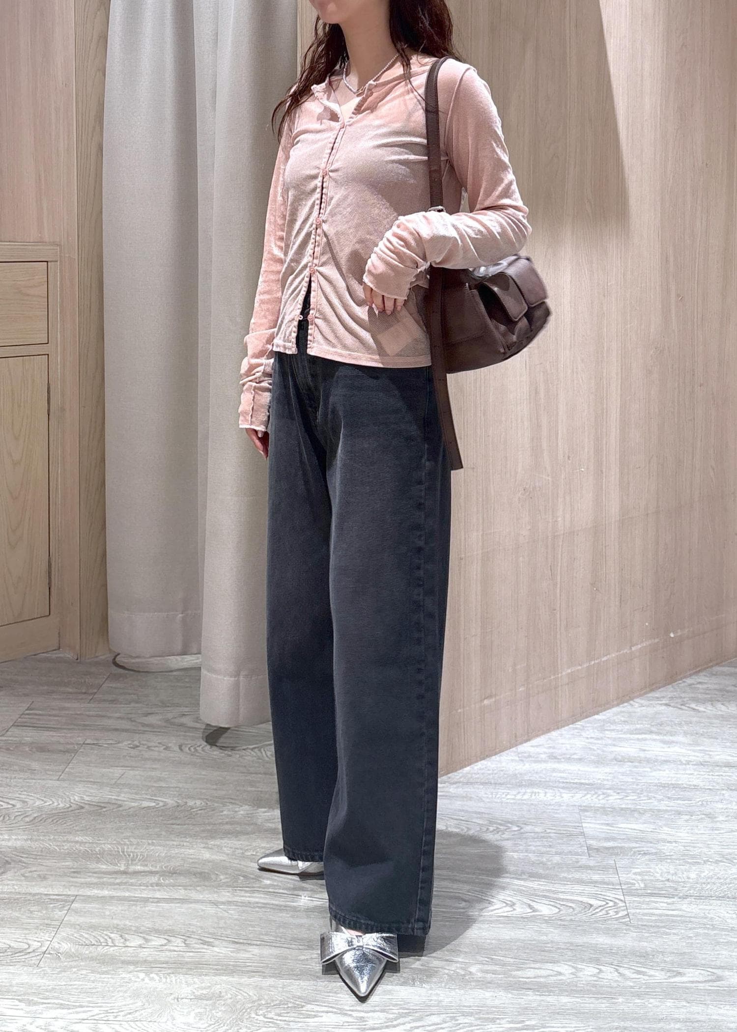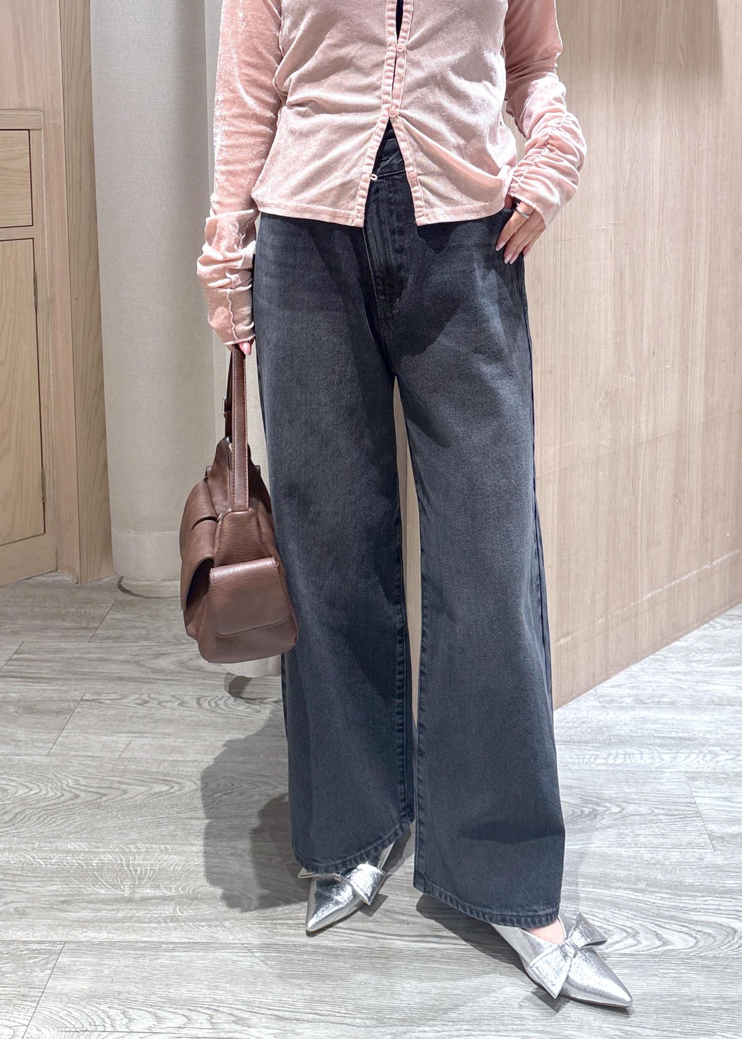 裾にかけてワイドに広がるシルエットで形がとても綺麗です!◎またデニムも程よい柔らかさで履き着心地も◎ -