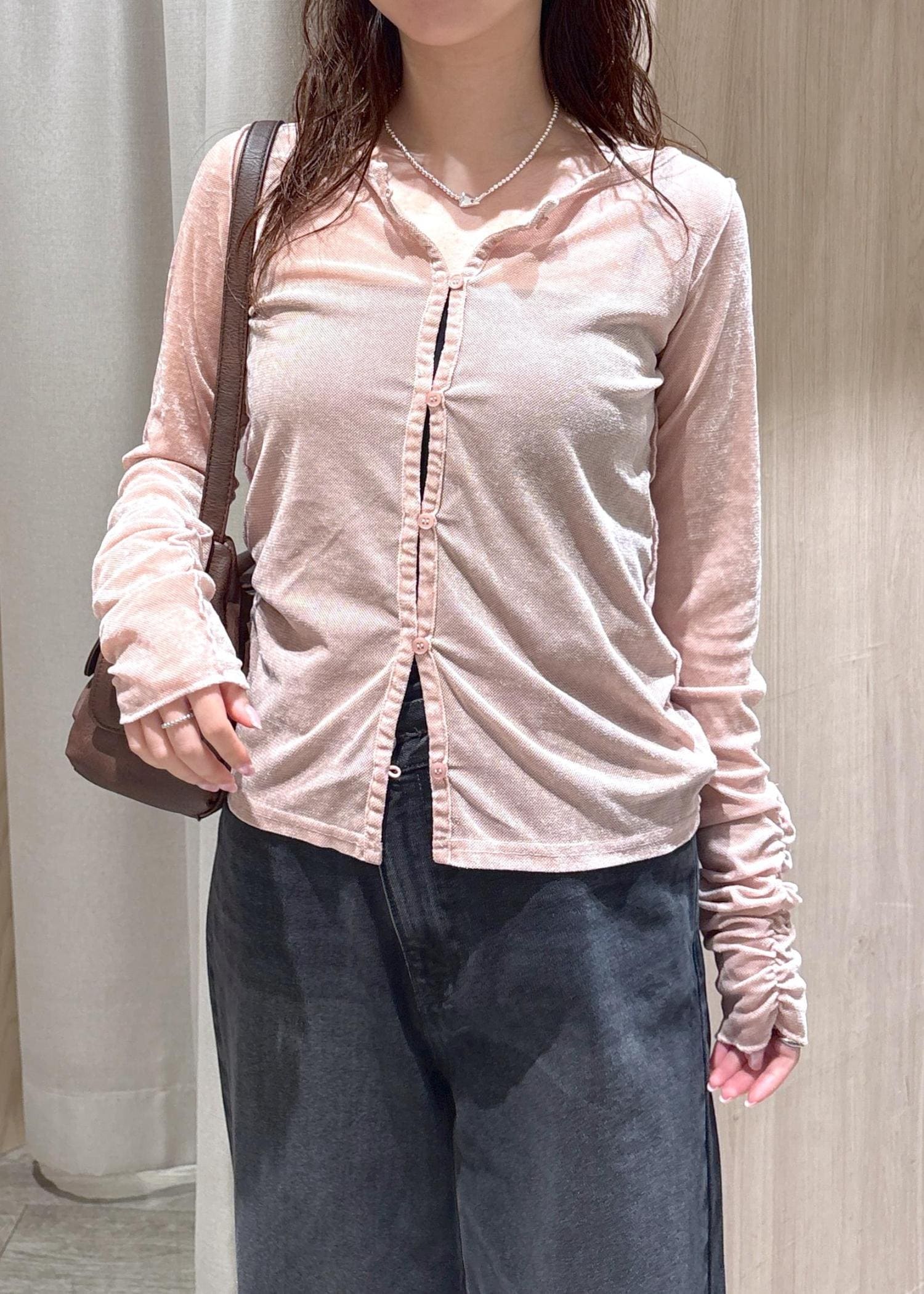 VIS【2WAY】花柄&無地アソート袖シャーリングベロアカーディガンピンク / F¥3,951レビュー袖がくしゅくしゅになっており、インナーとしても使いやすい全体的にフィット感のあるサイズです。
