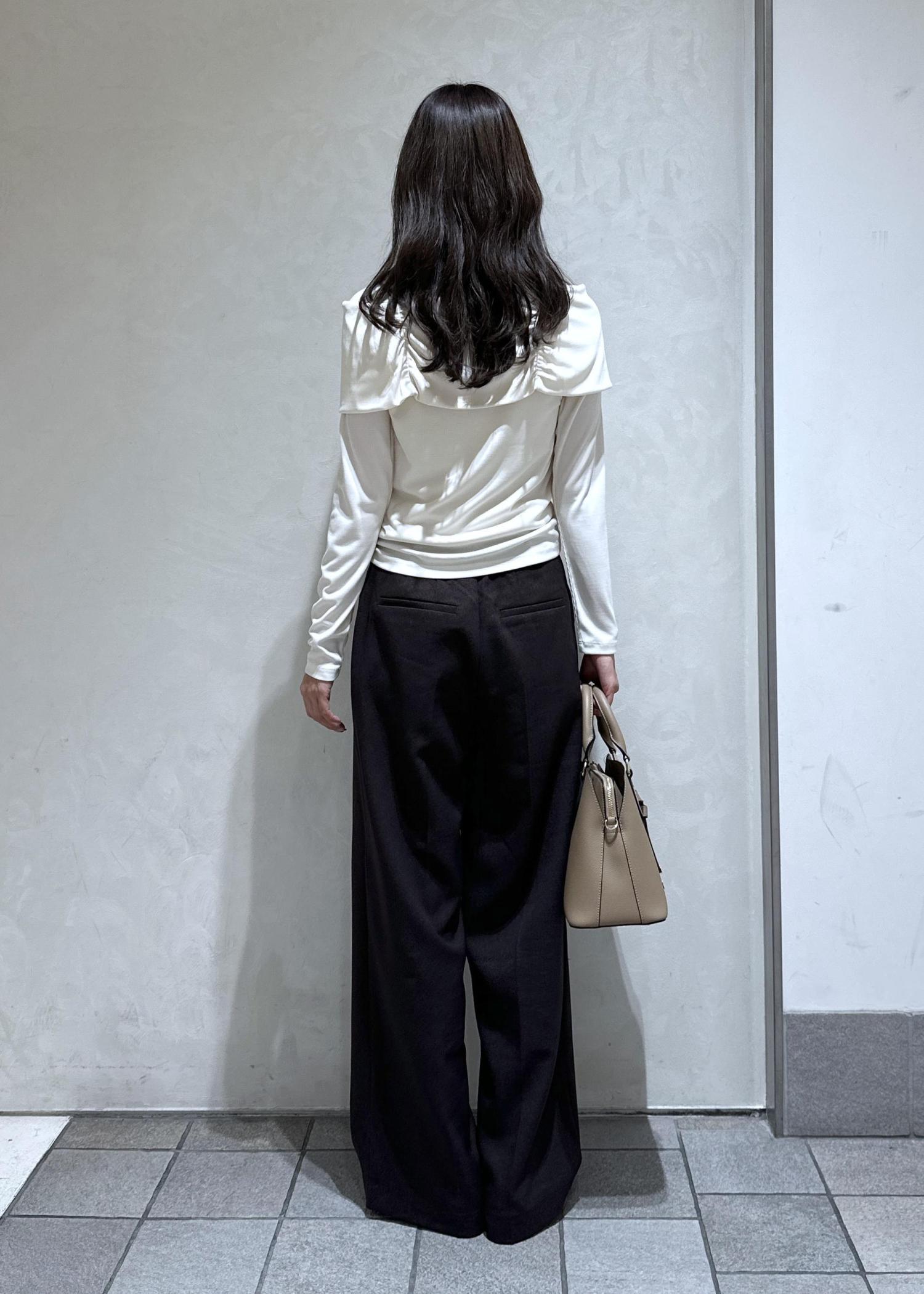 露出の少ないオフショル風トップスなので