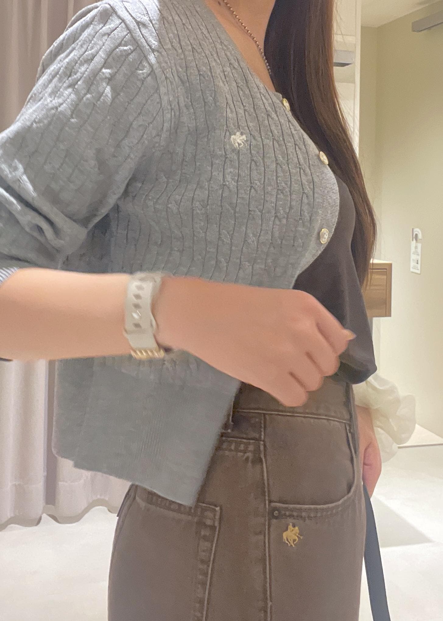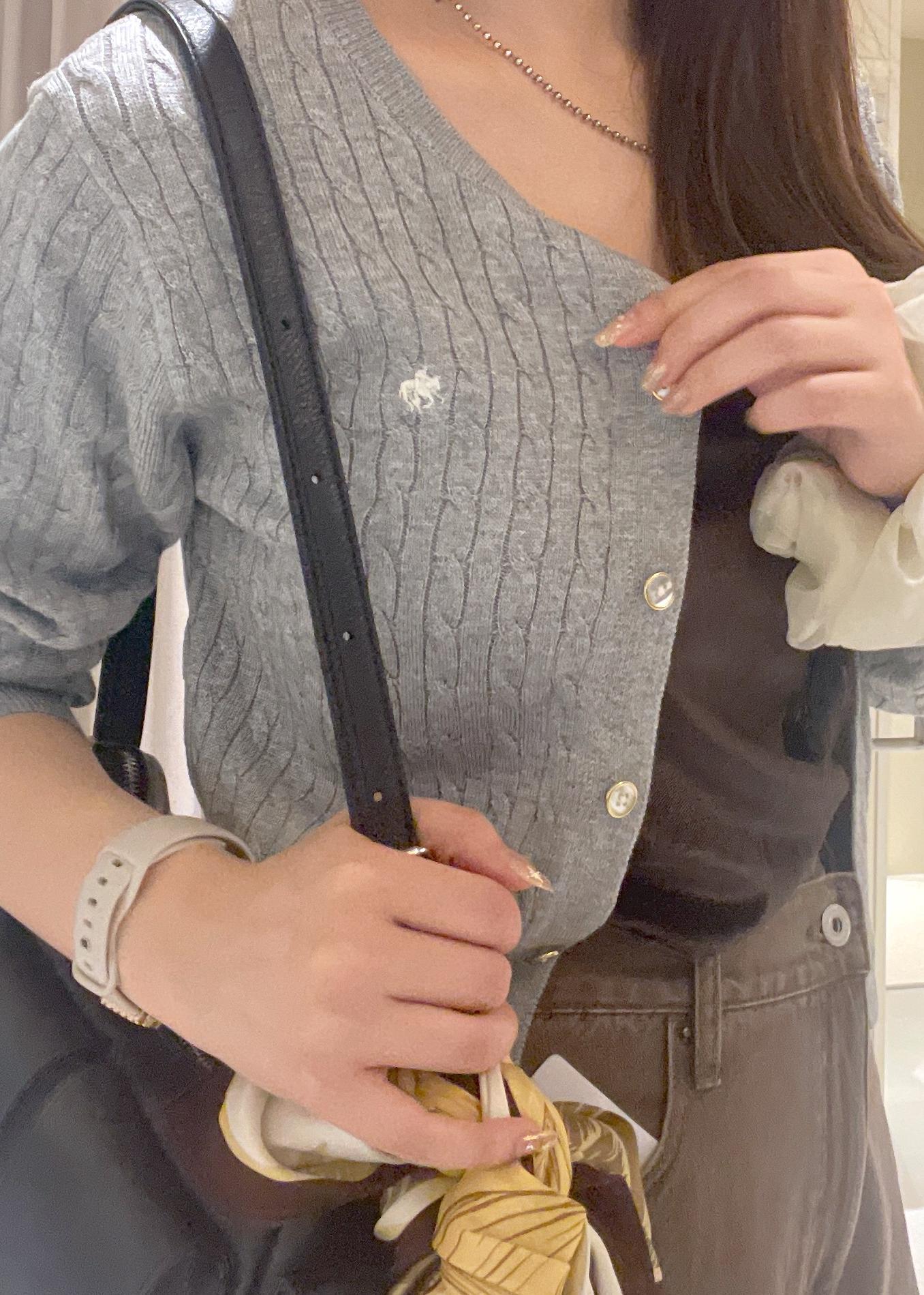 POLOのカーディガンとデニムパンツを合わせたコーデです