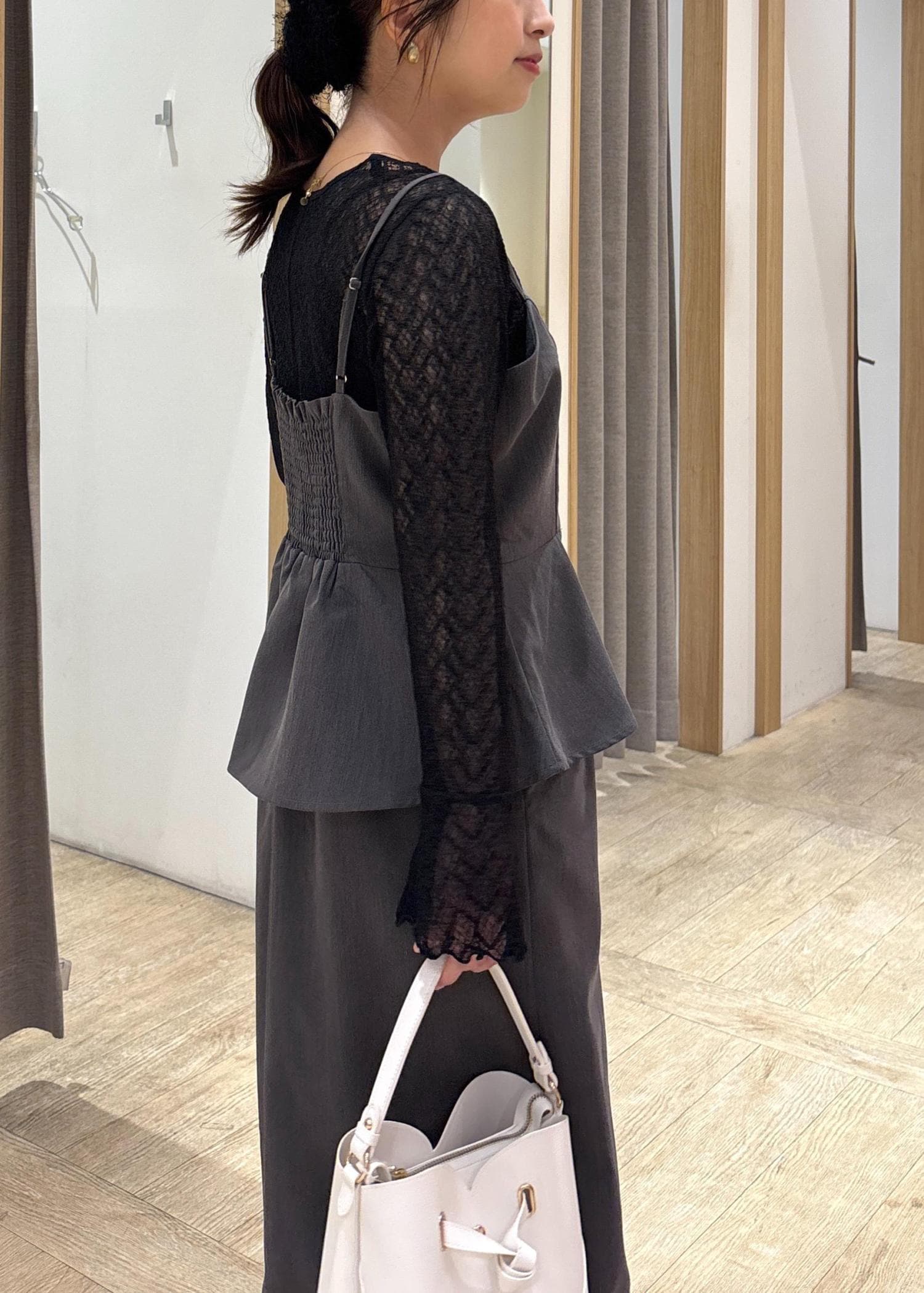 紐がダブルで見えても可愛いので、夏物のシアーシャツと合わせて秋見えさせるのもおすすめ◎ -