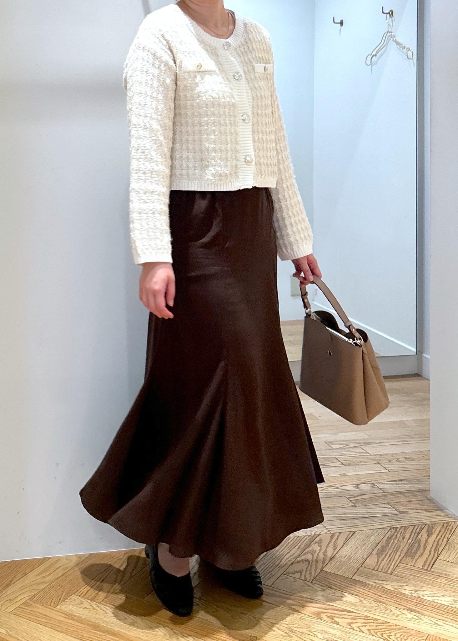 トップスのカーディガンはラメ感があり、一枚でも着映え抜群!!