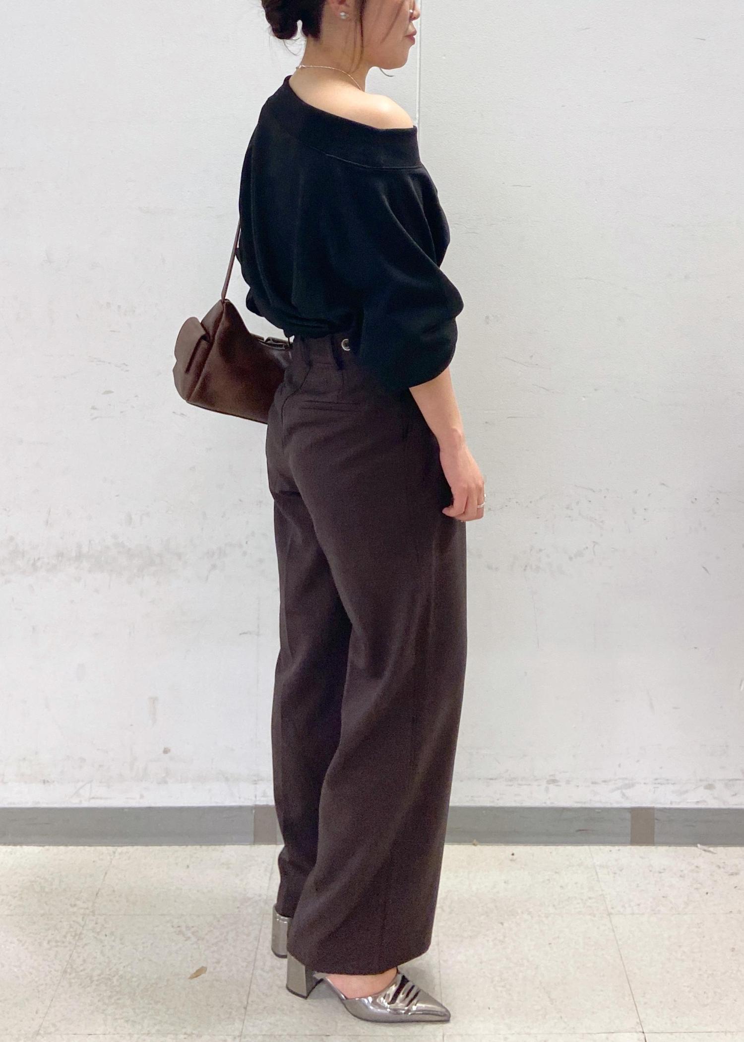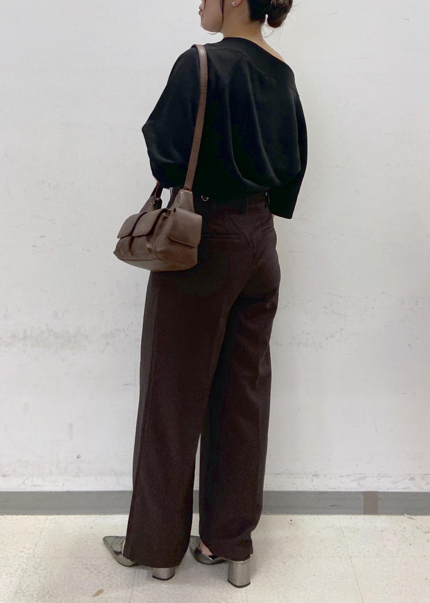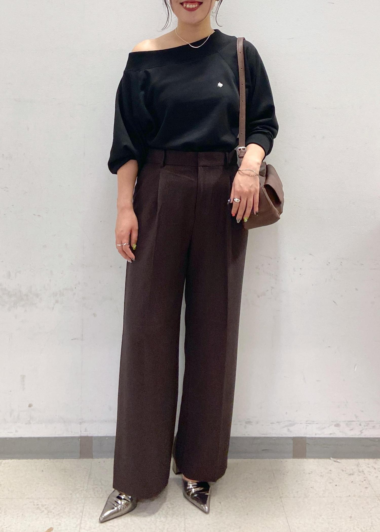 カジュアルなスウェットですが、ワンショルにすると一気に女性らしい印象に❤︎