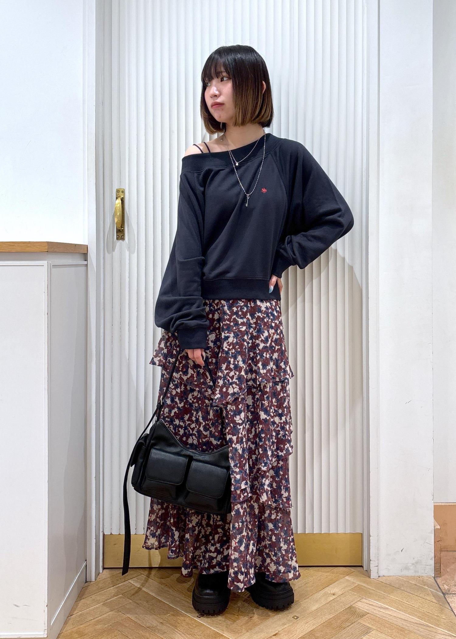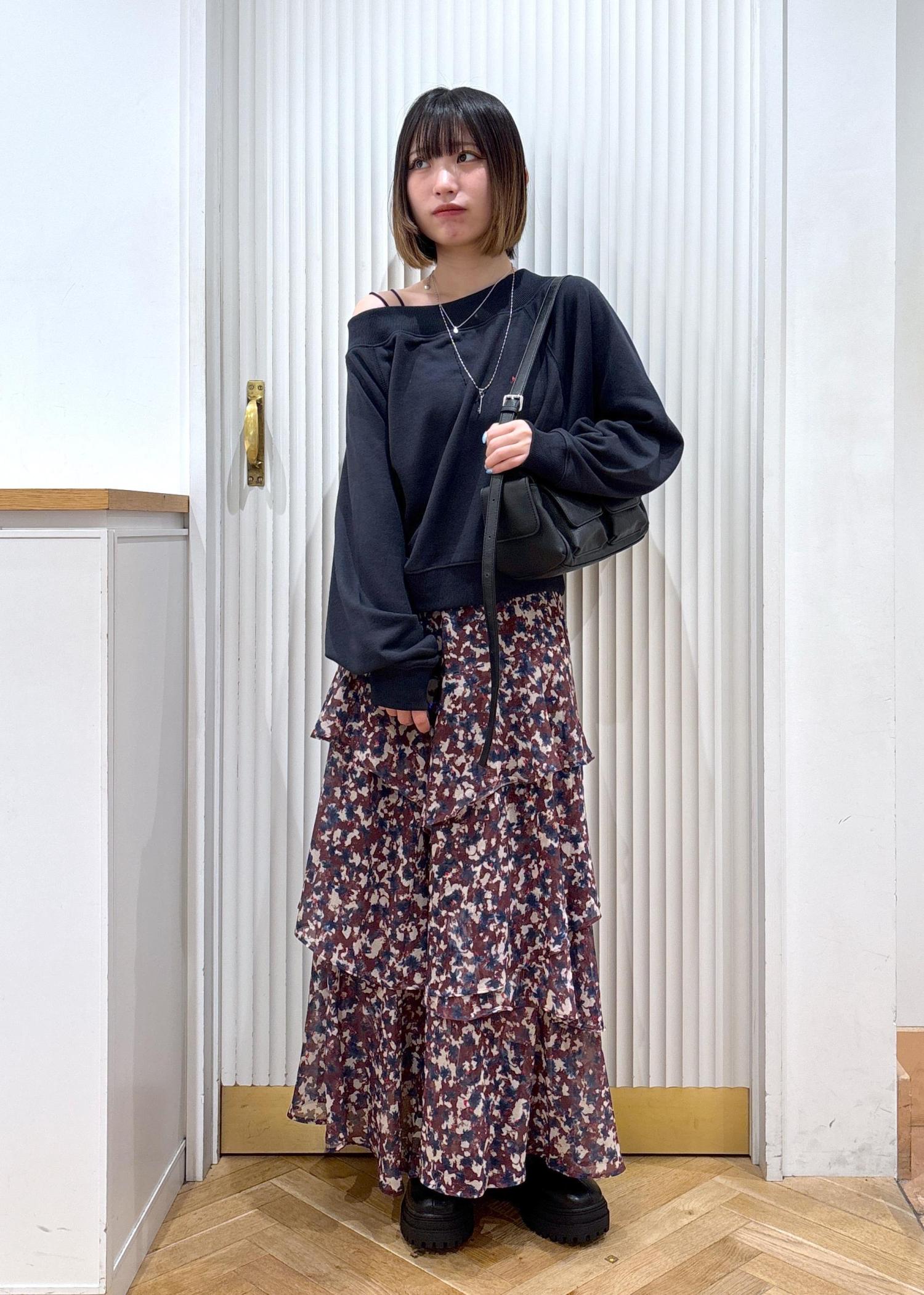 スウェットにティアードスカートで甘めカジュアルなコーディネートです。秋らしさ満載の花柄スカートにヴィンテージ風のバッグを合わせることで少し古着感のあるコーディネートになります。少し個性派なコーデを着て見たい方におすすめです!