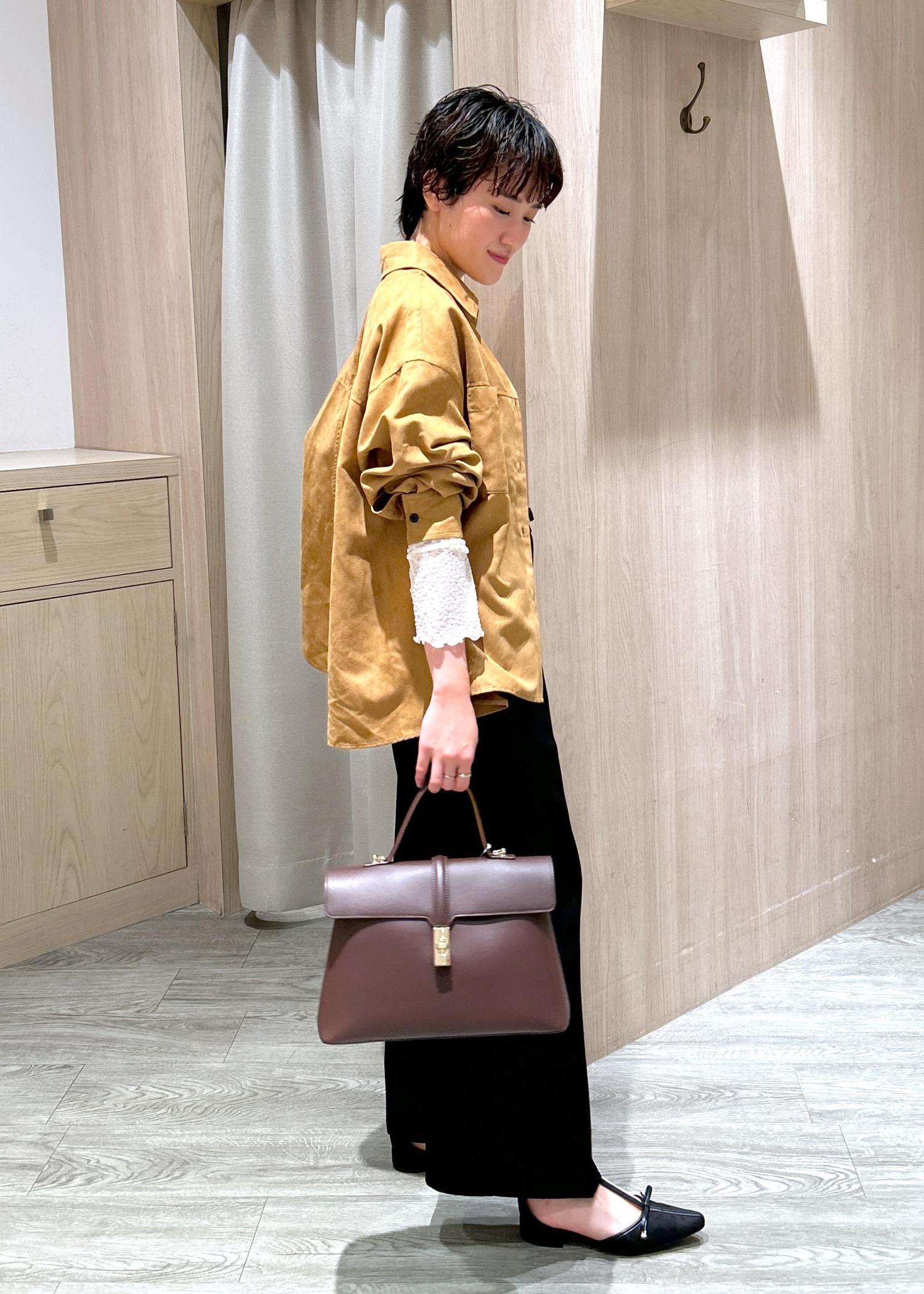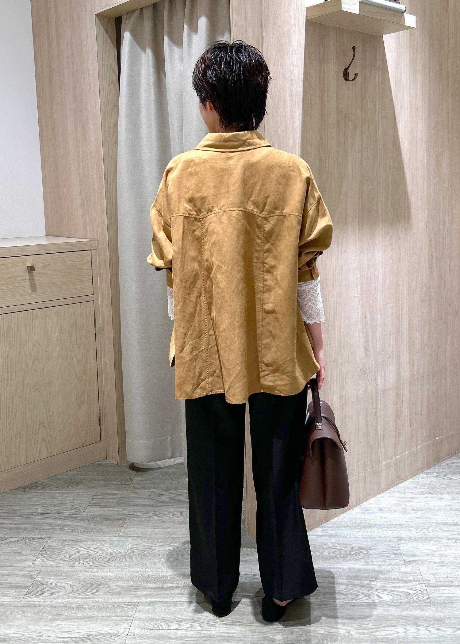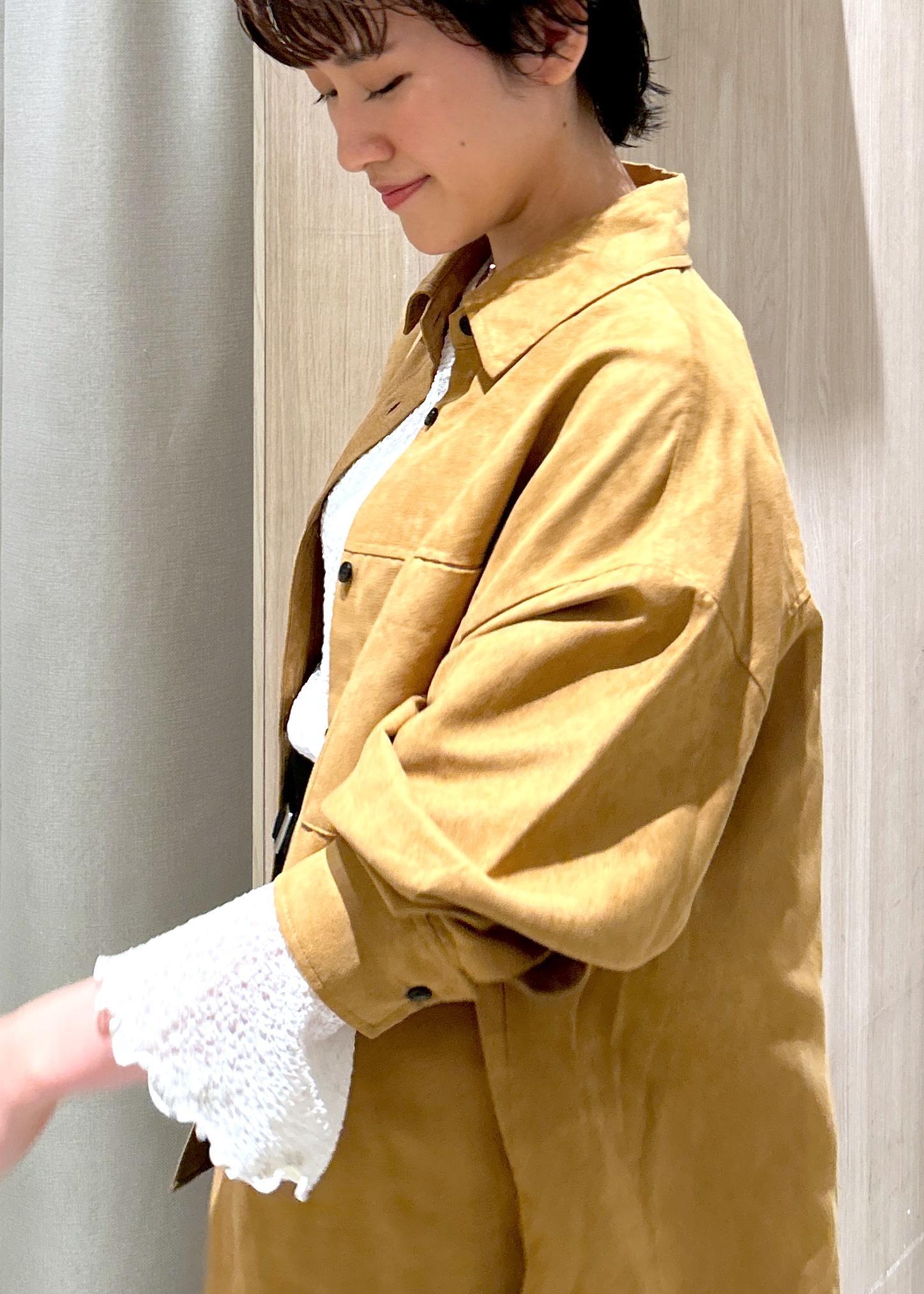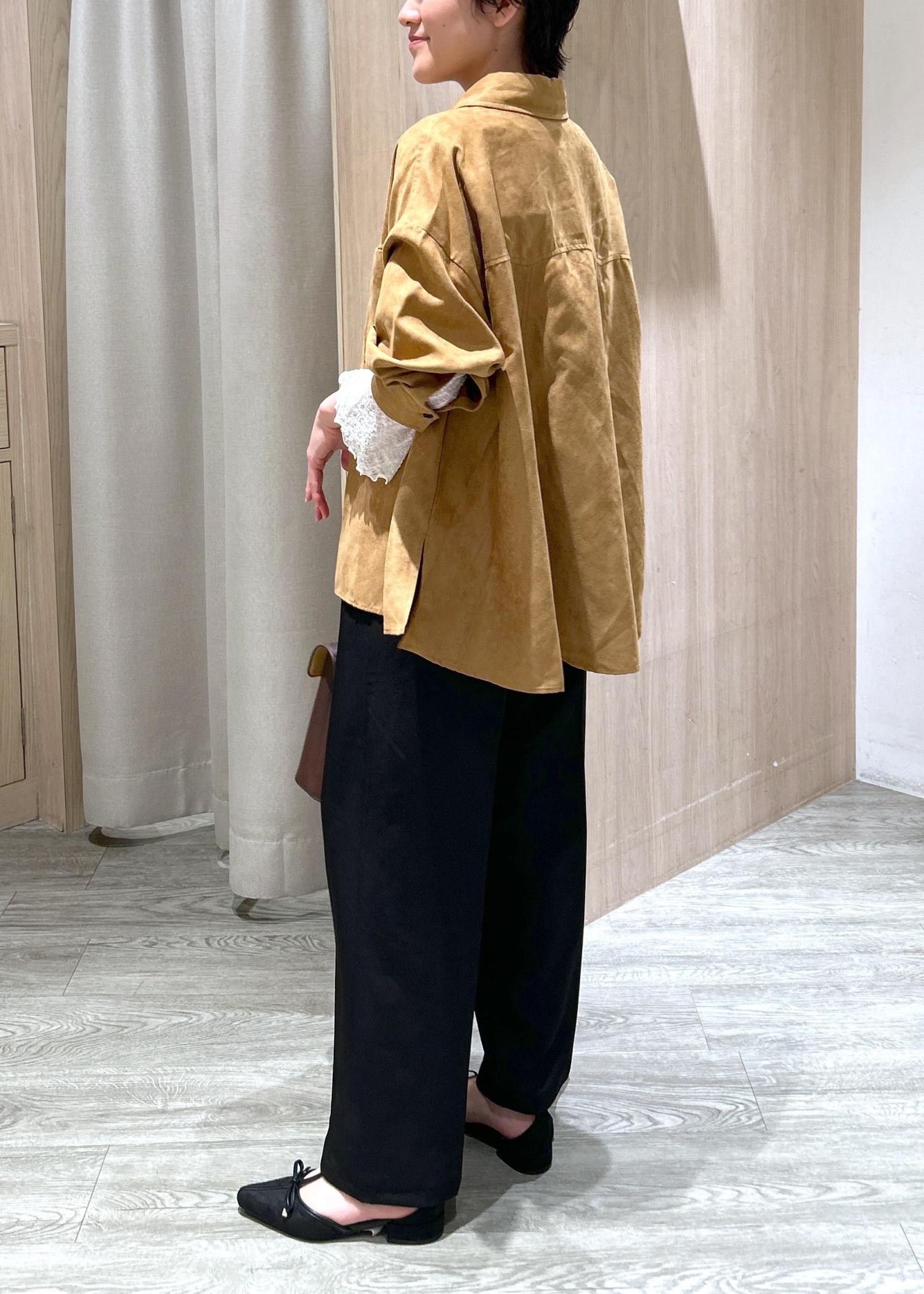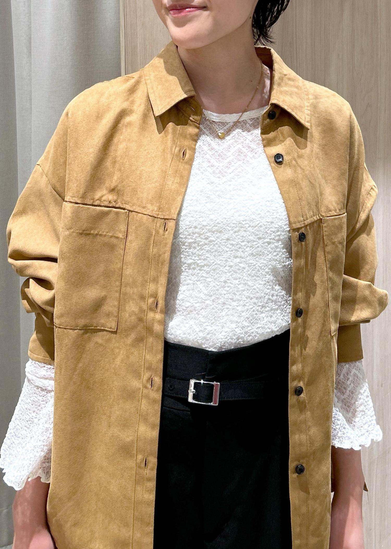 スウェード素材のシャツにポイントでレースのインナーをレイヤードさせ袖口からチラッと見せることでオシャレ感のあるコーデにしました!