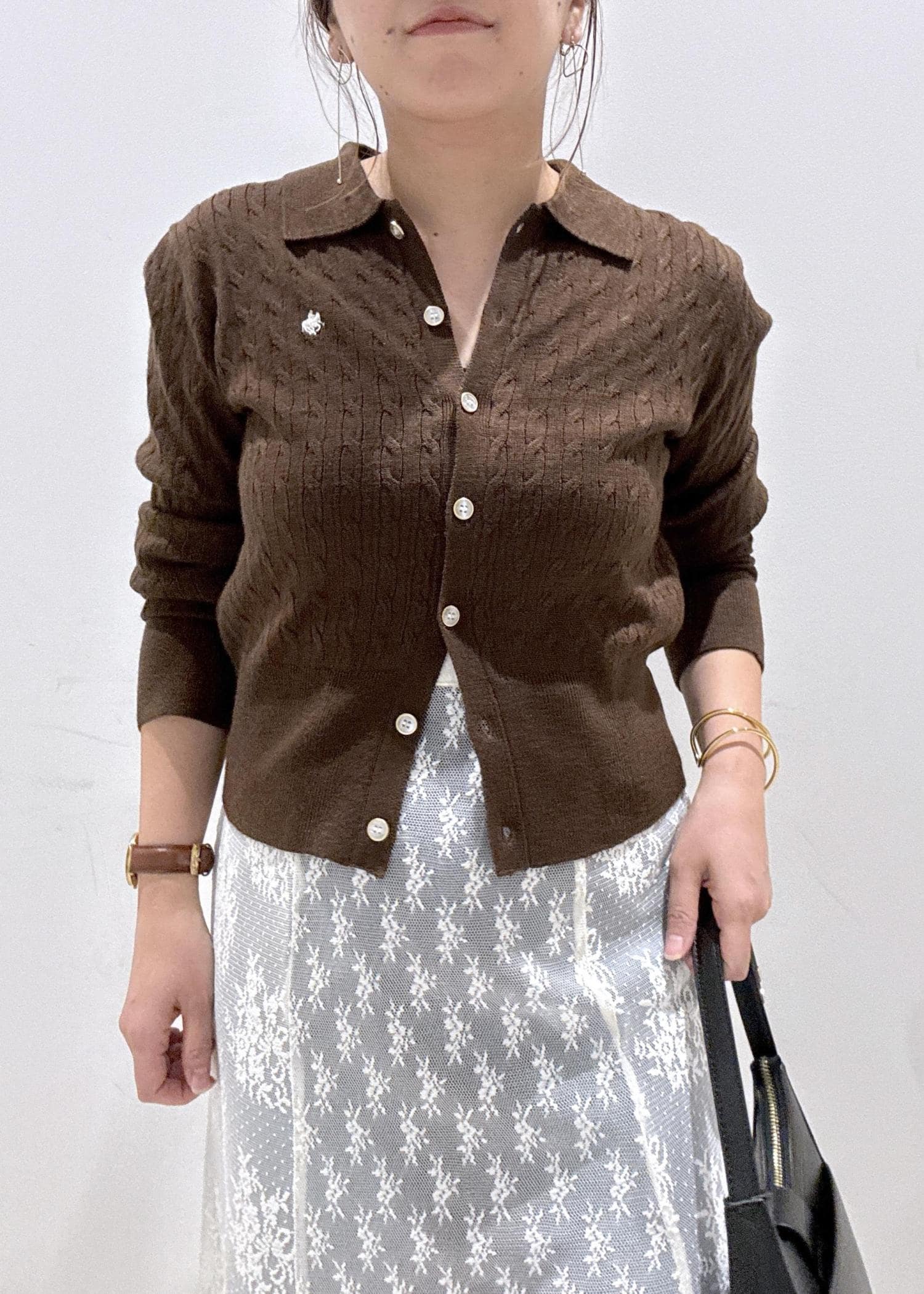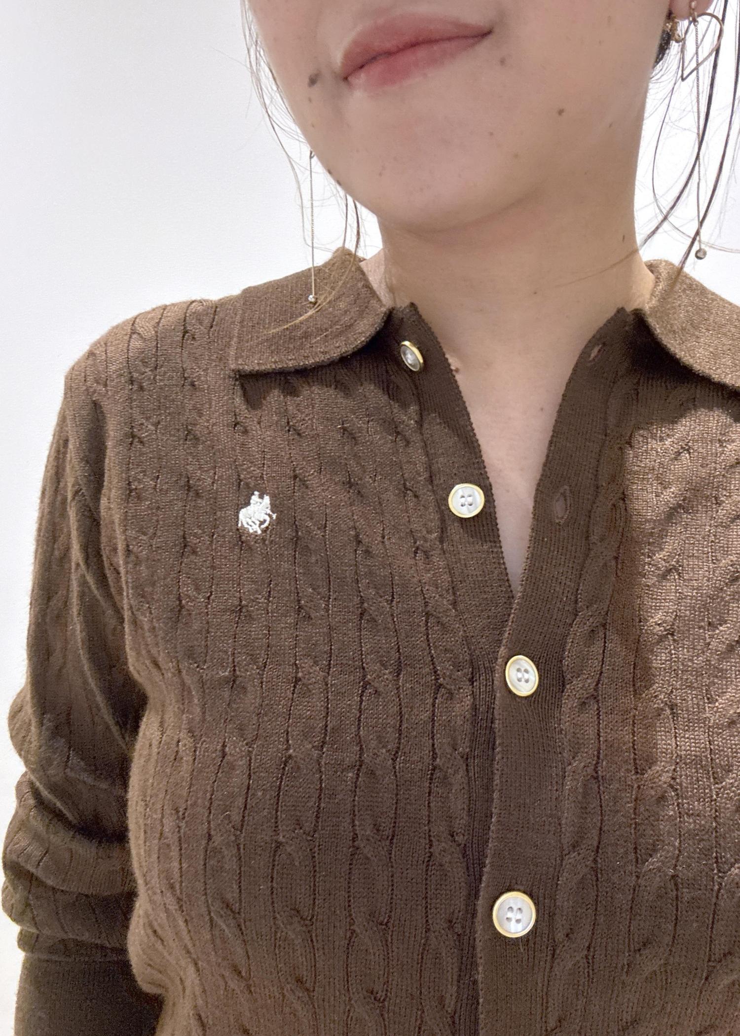 VIS【POLO BCS】VIS別注ミニケーブルポロ襟ニットカーディガンダークブラウン / F¥7,150レビュー人気のケーブルカーディガンの襟付きバージョンで、トップスにも羽織にもなり着回し力抜群です。