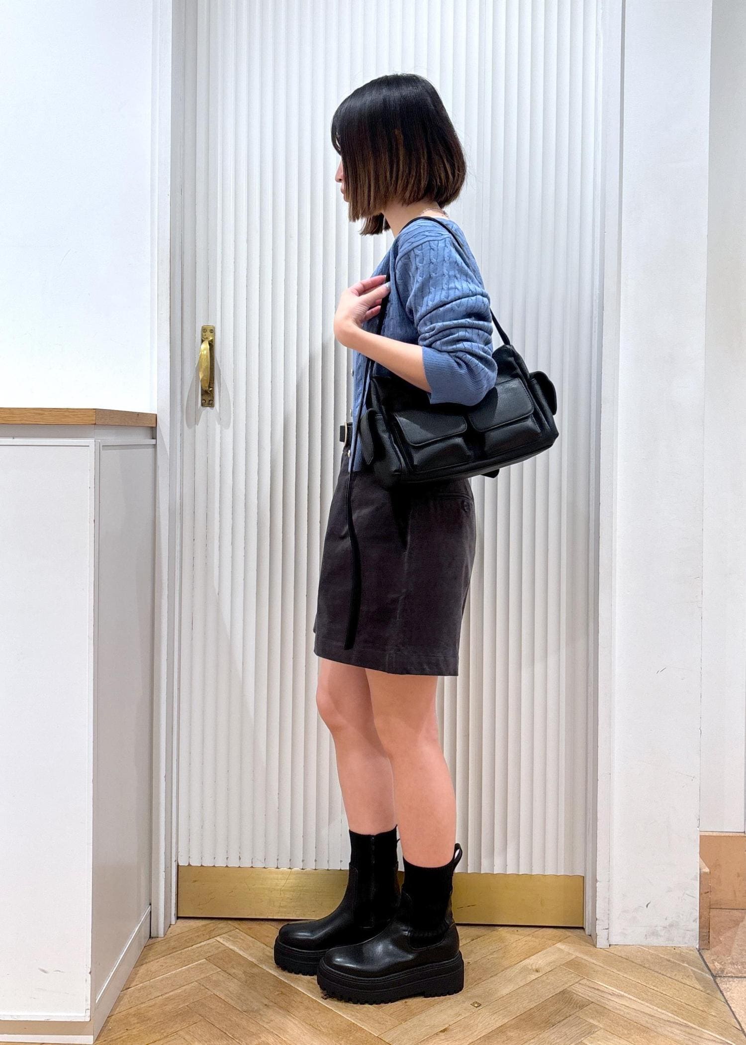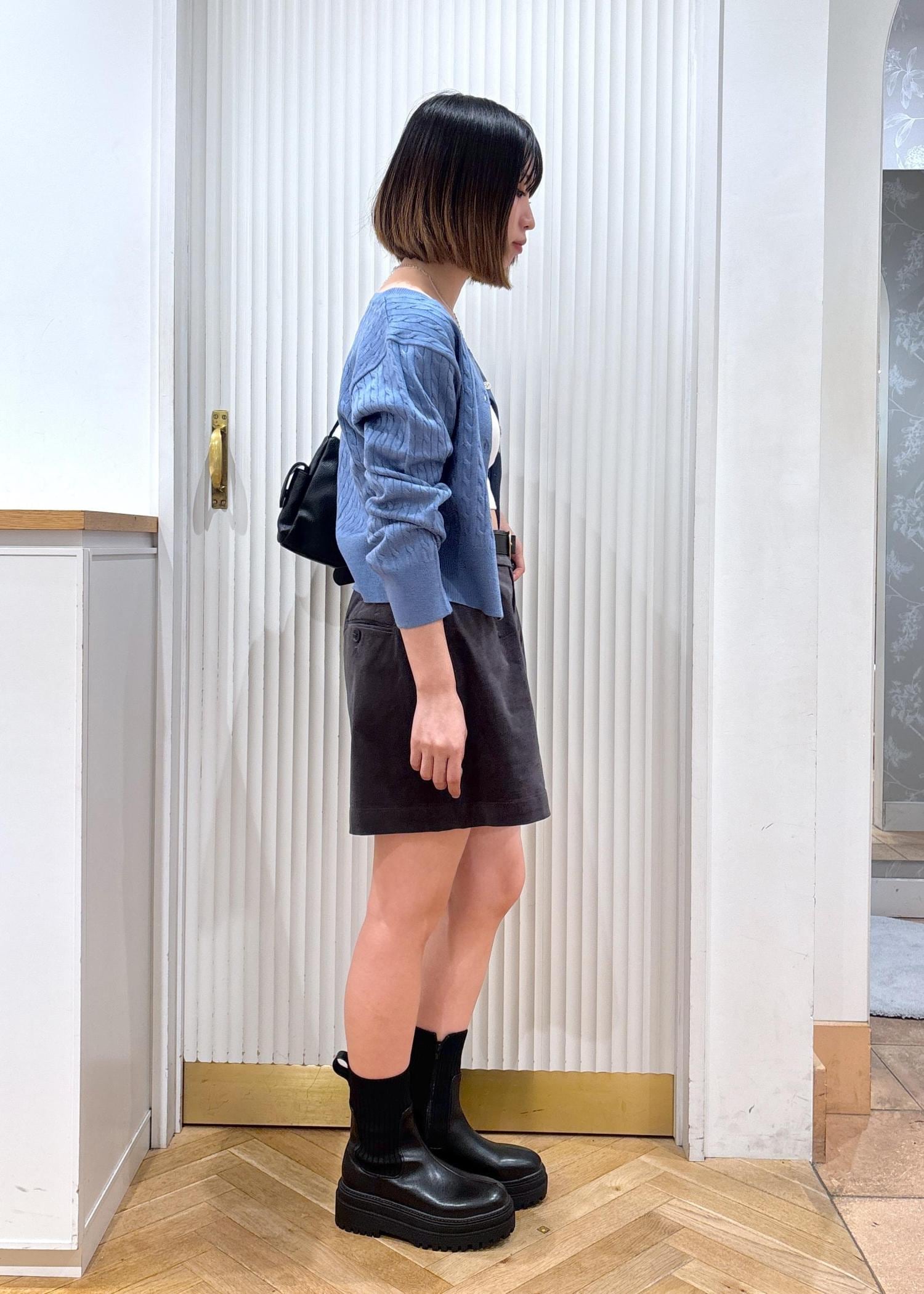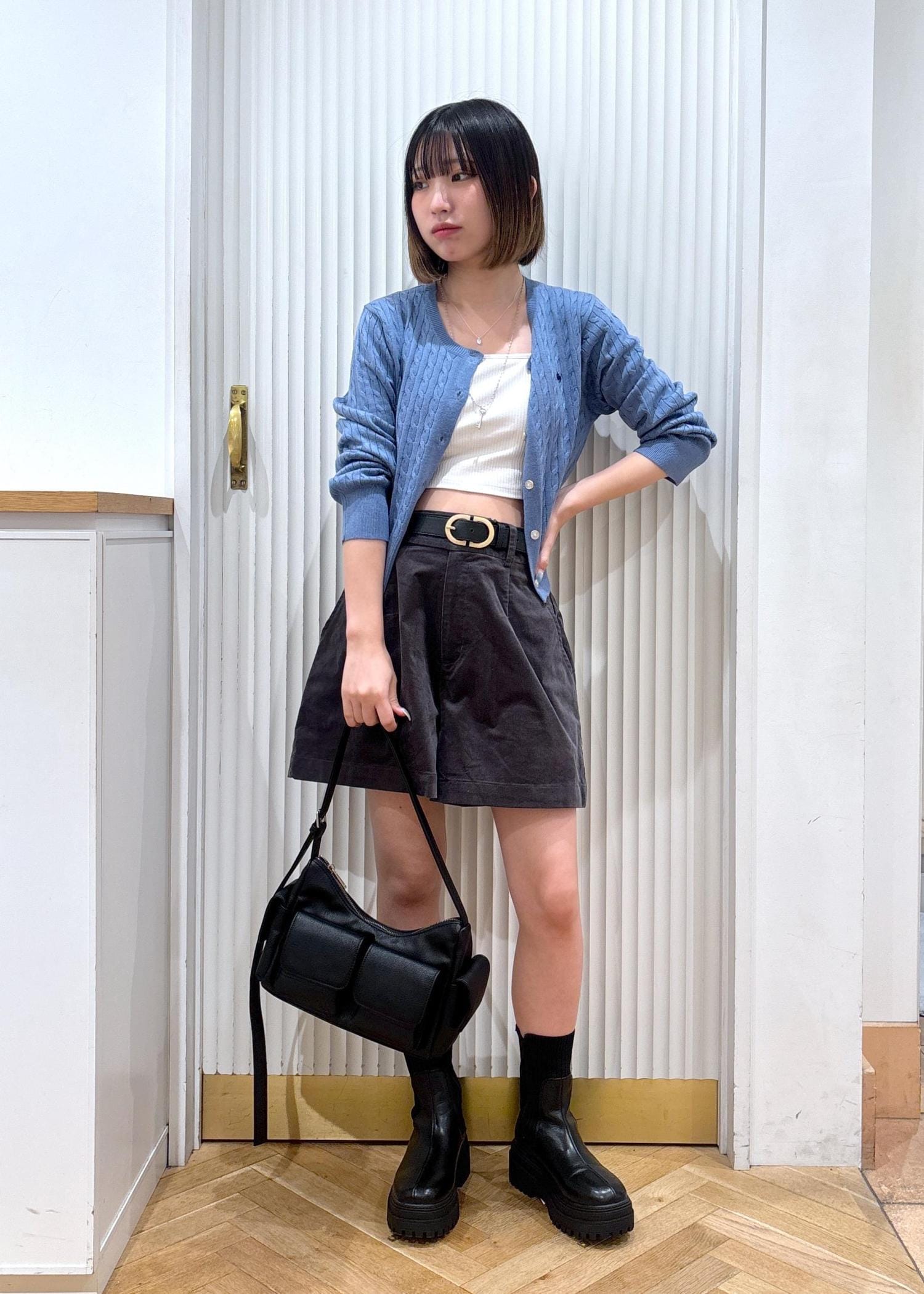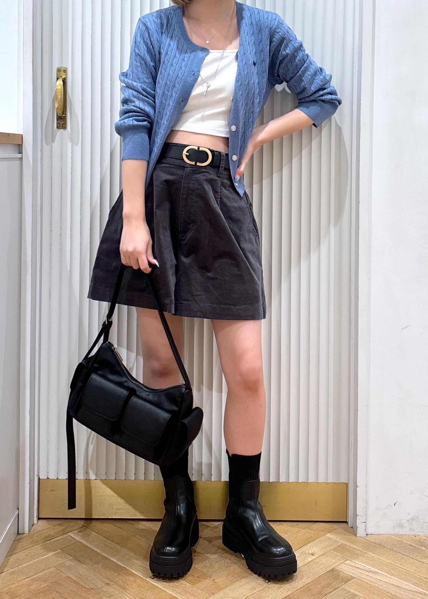 ブルーが目を惹くカーディガンを使ったカジュアルコーデです。ミニ丈にショートブーツで秋らしさをプラスし、前を開けることで抜け感がでます!小物を黒に統一することでコーディネートが締まりブルーが引き立ちます!