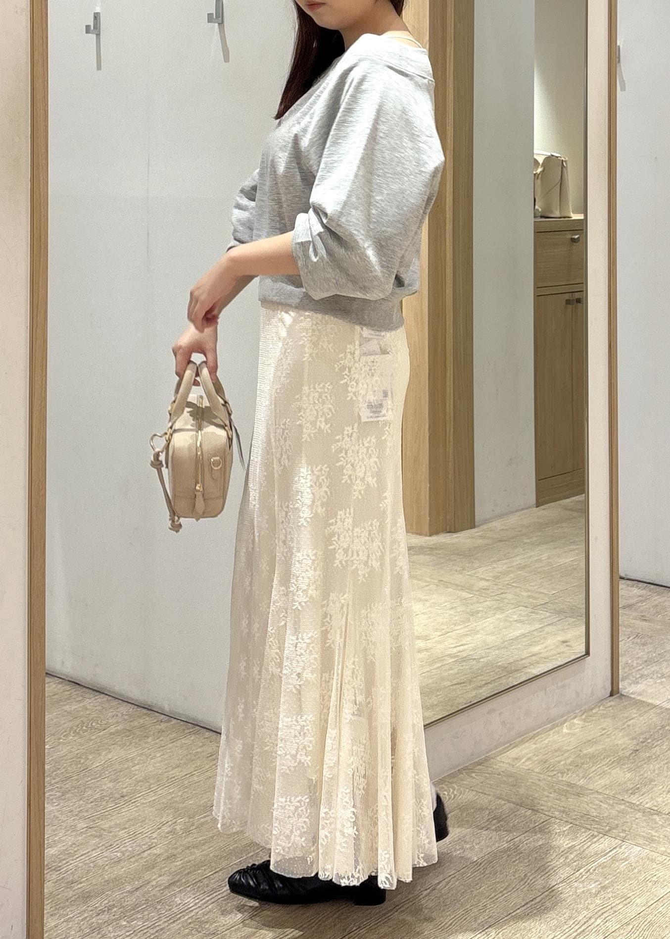 VISフィブリルサテン&レースアソートマーメイドスカートキナリ / F¥5,382レビューロング丈(91cm)の足首あたりにくる丈感は縦ラインをきれいに演出できました。