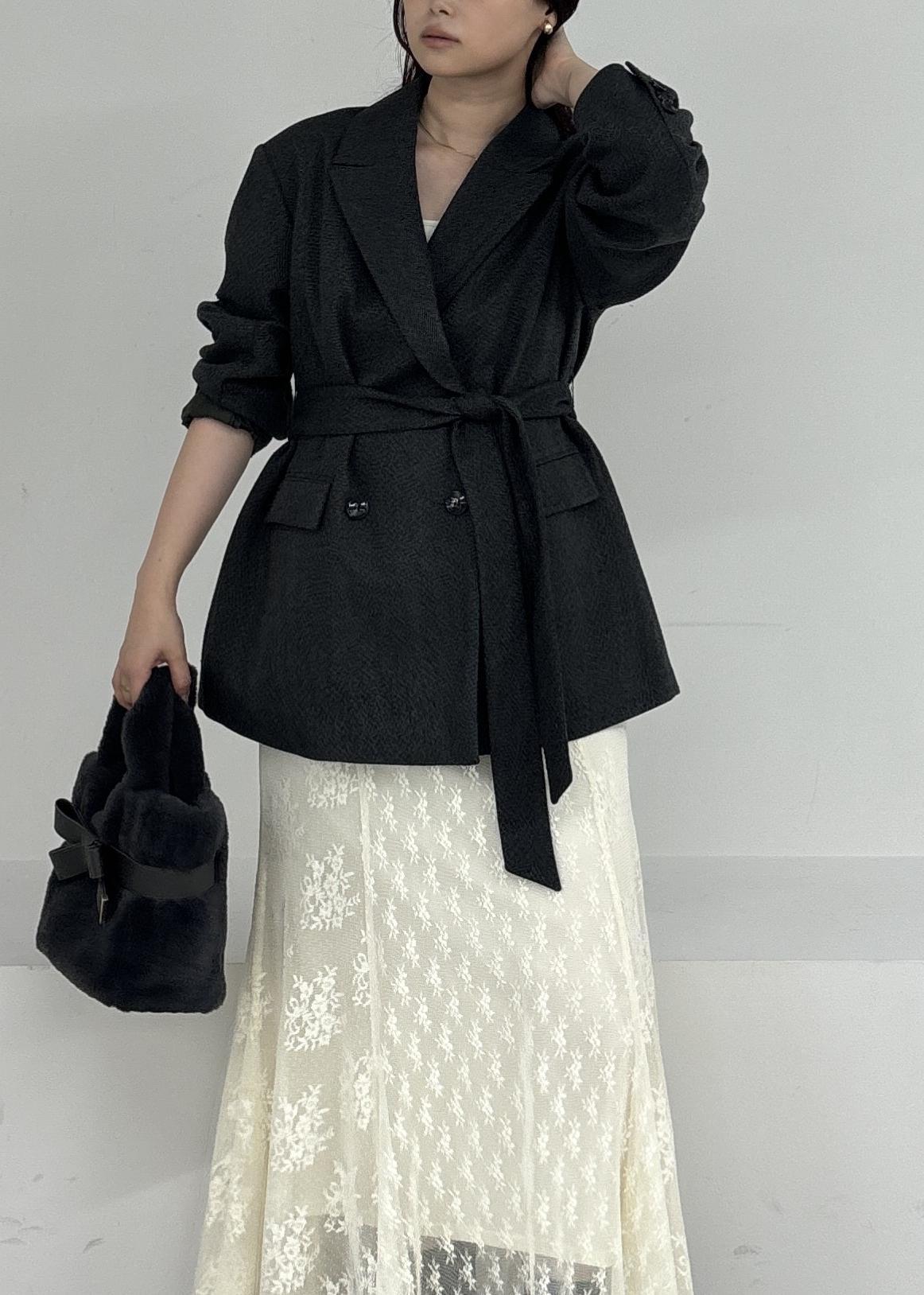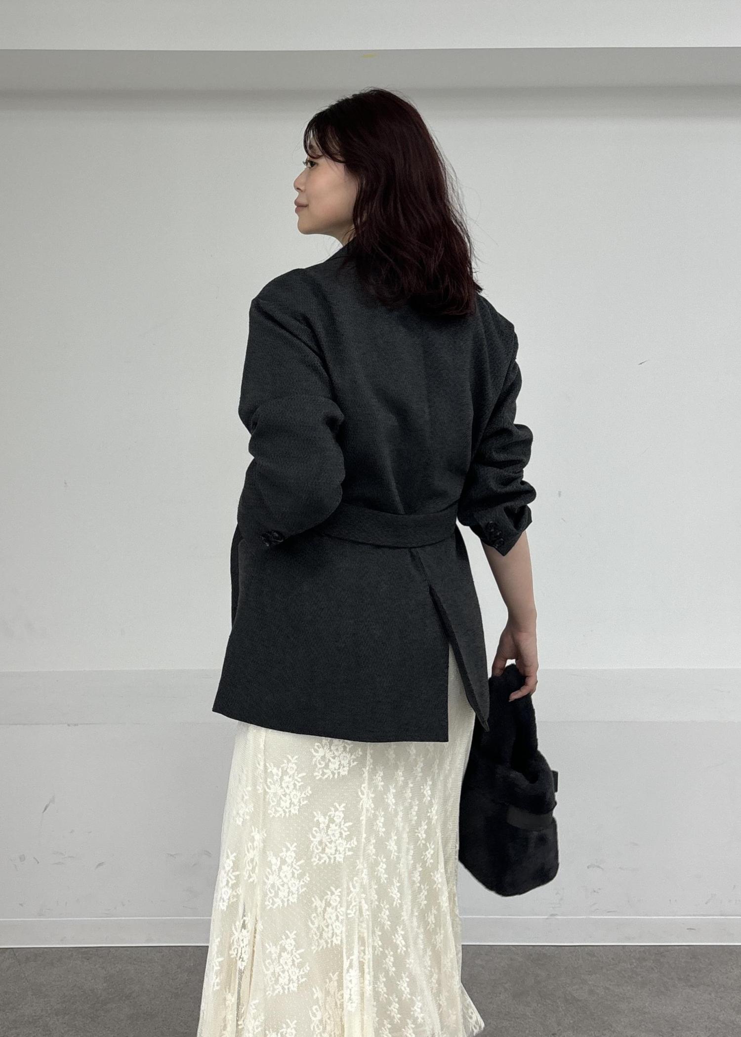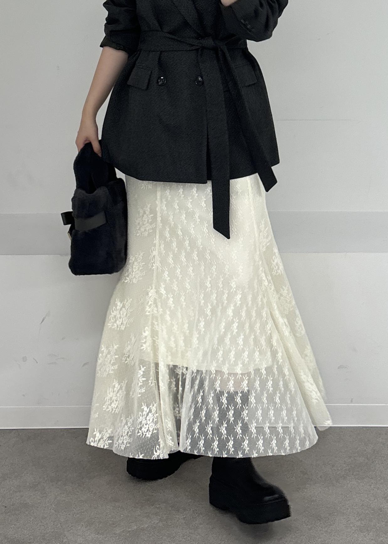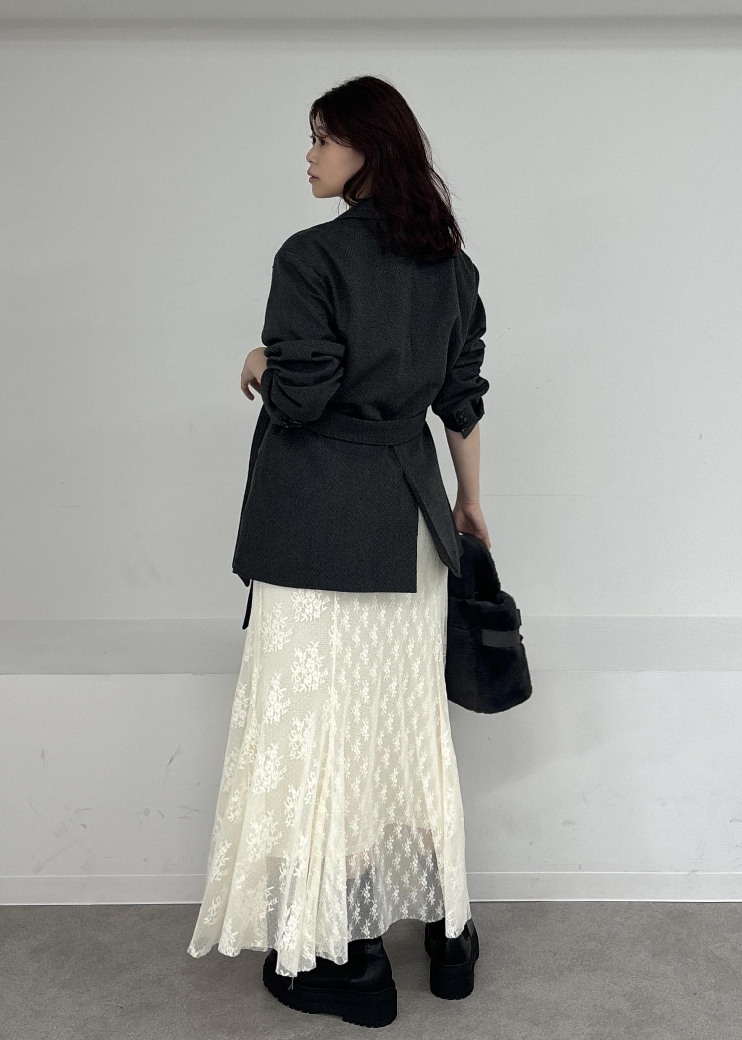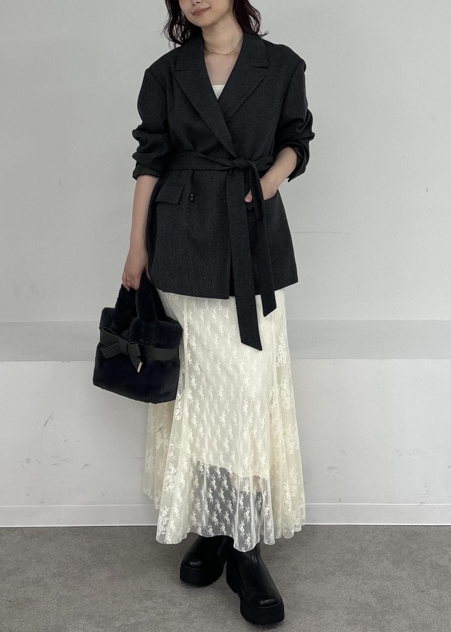 こなれ感を一気に出してくれる深Vネックのジャケットと、レーススカートを合わせ少し甘さも+αした秋に着たいスタイリングにしてみました!