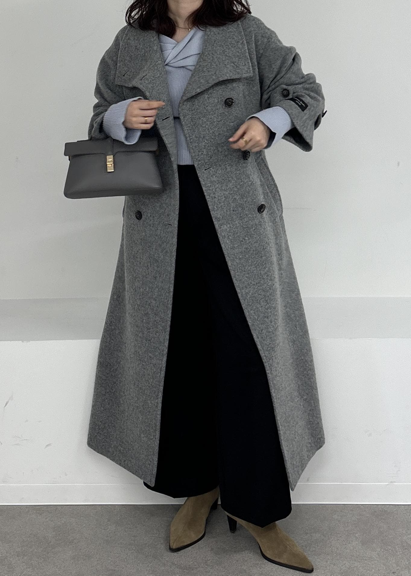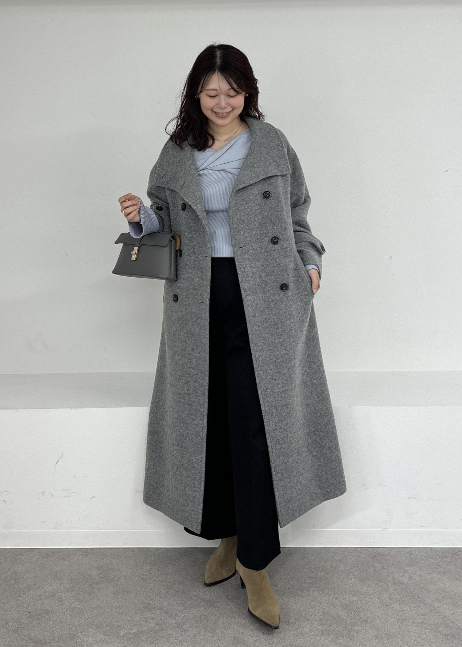 ライトグレーのカラーにインナーはデザイントップスブルーとグレーのニュアンスカラー合わせに◎