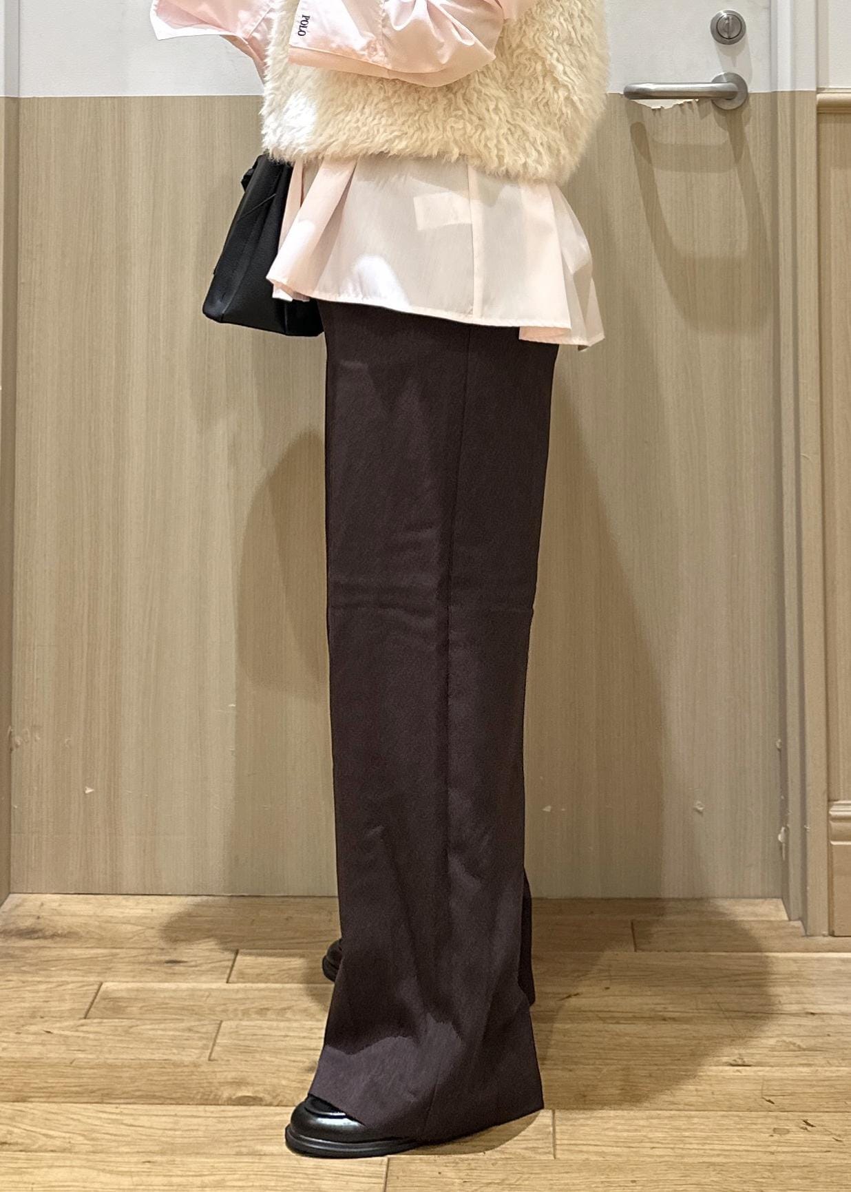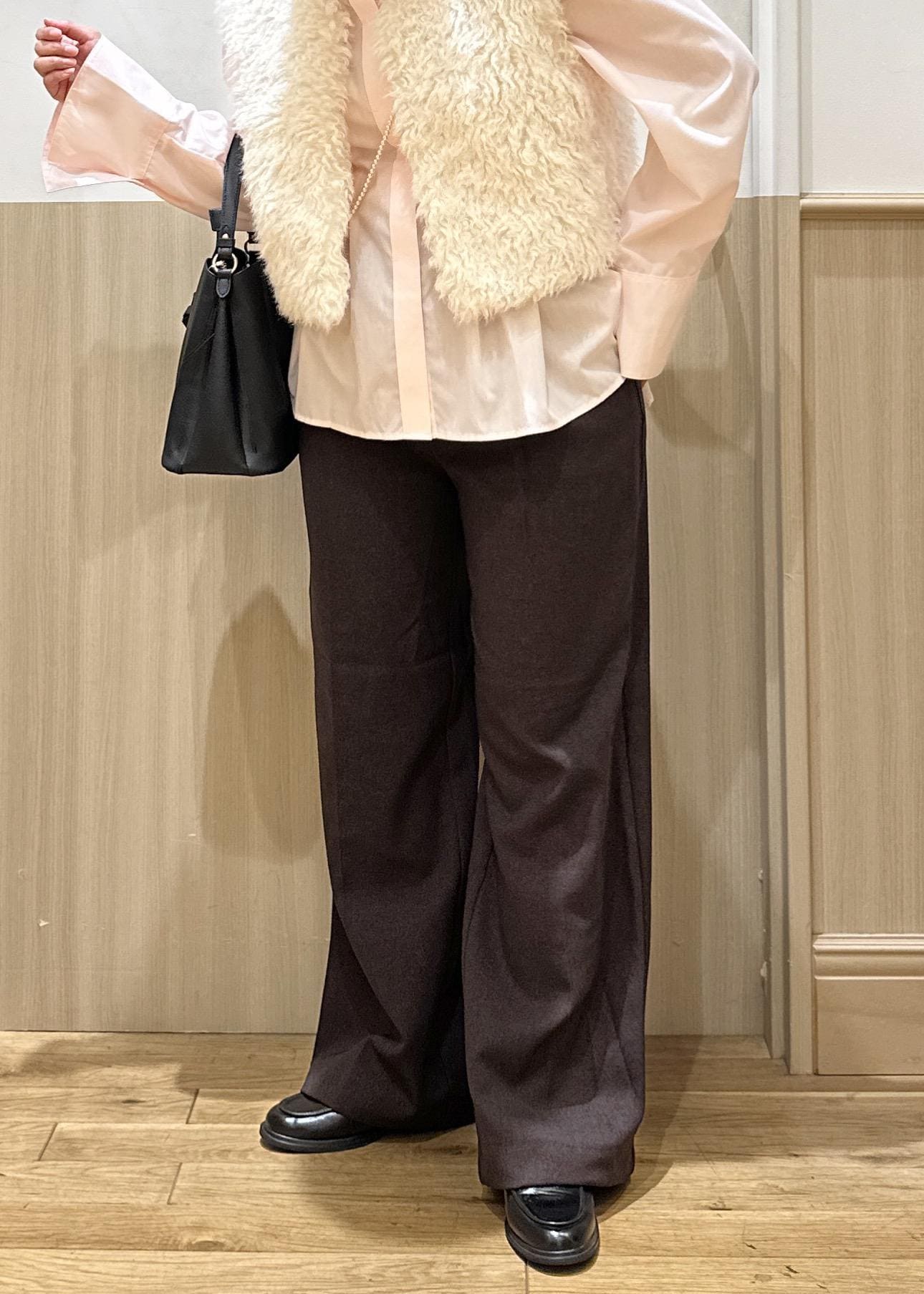 ブラウンはポリエステル100%ですが、高見えする素材感で履くだけで垢抜けるパンツです。