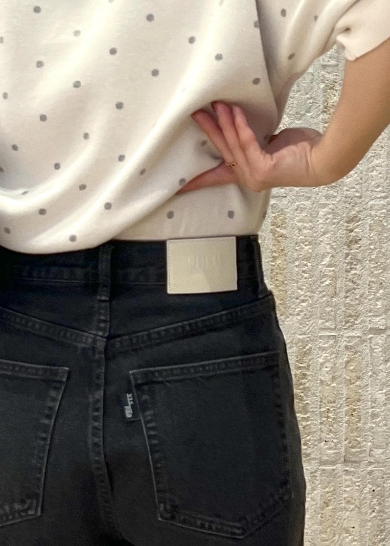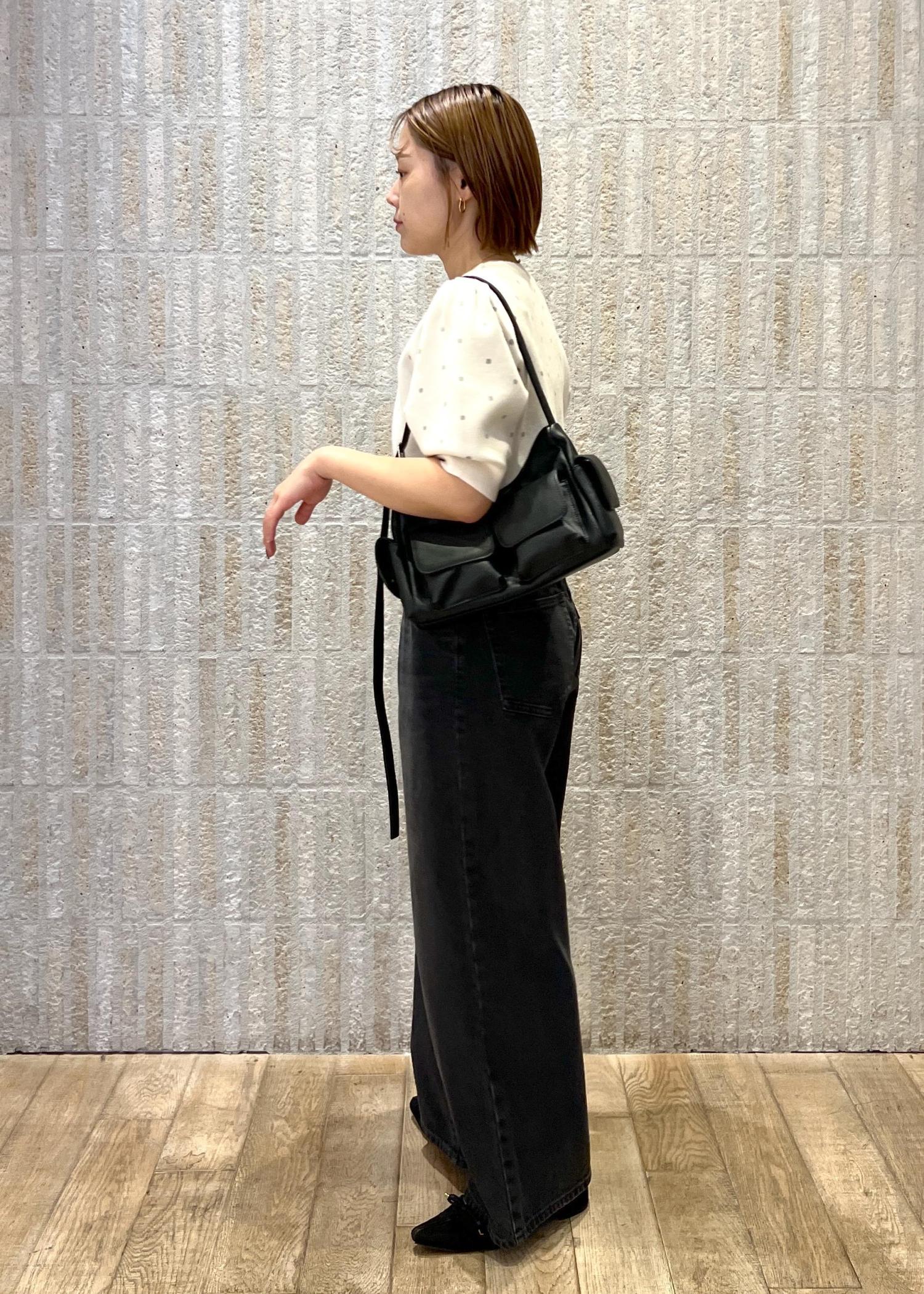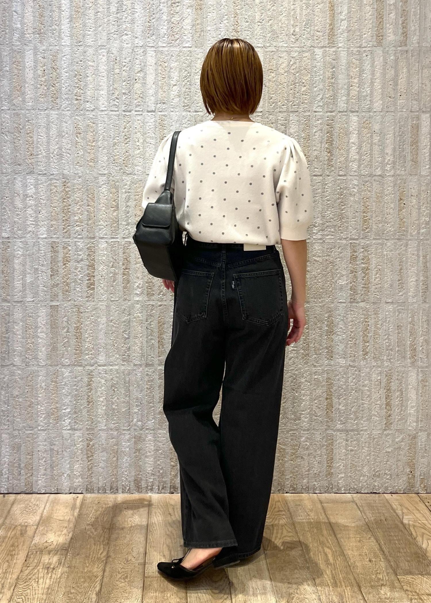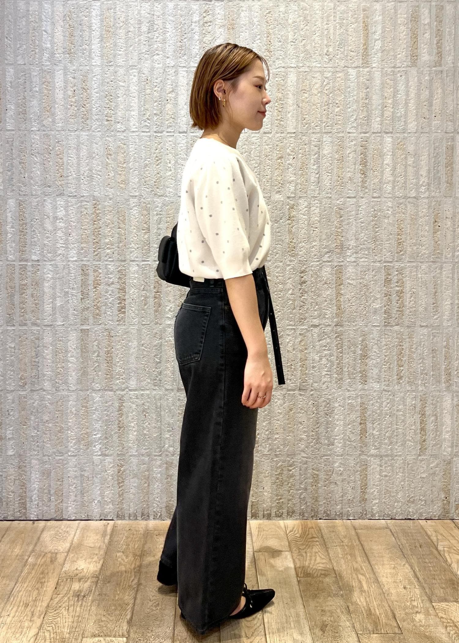 トレンド感のあるドットのトップスに、POLOのクロスベルトデニムを合わせてフェミニンカジュアルコーデにしました♡
