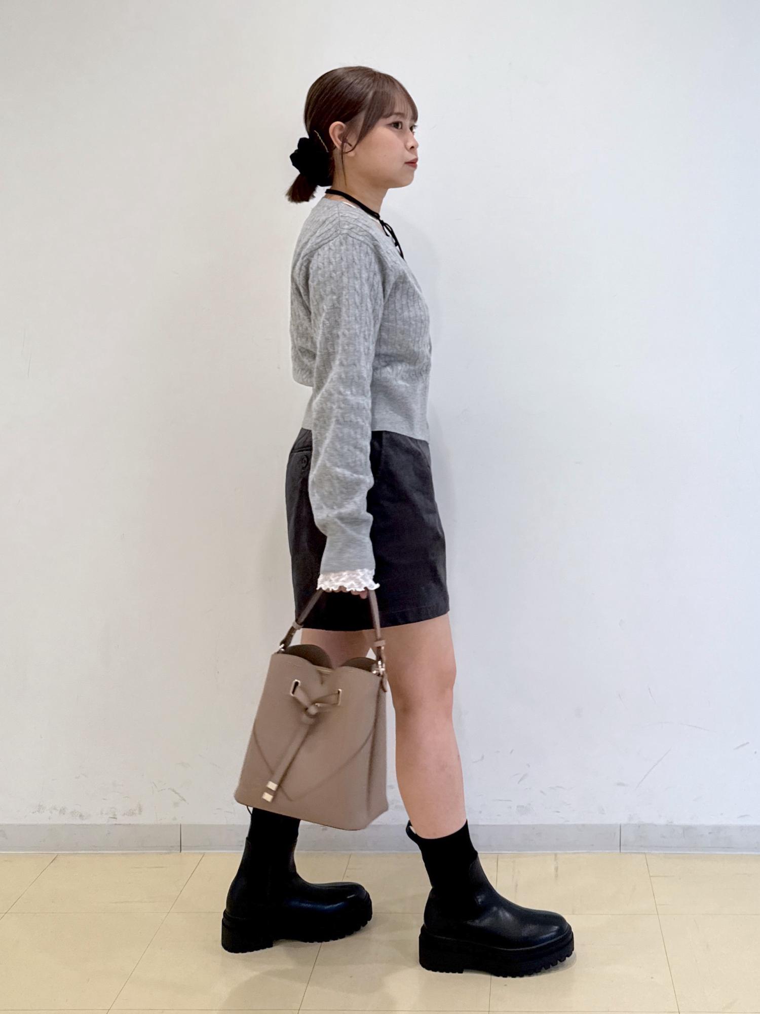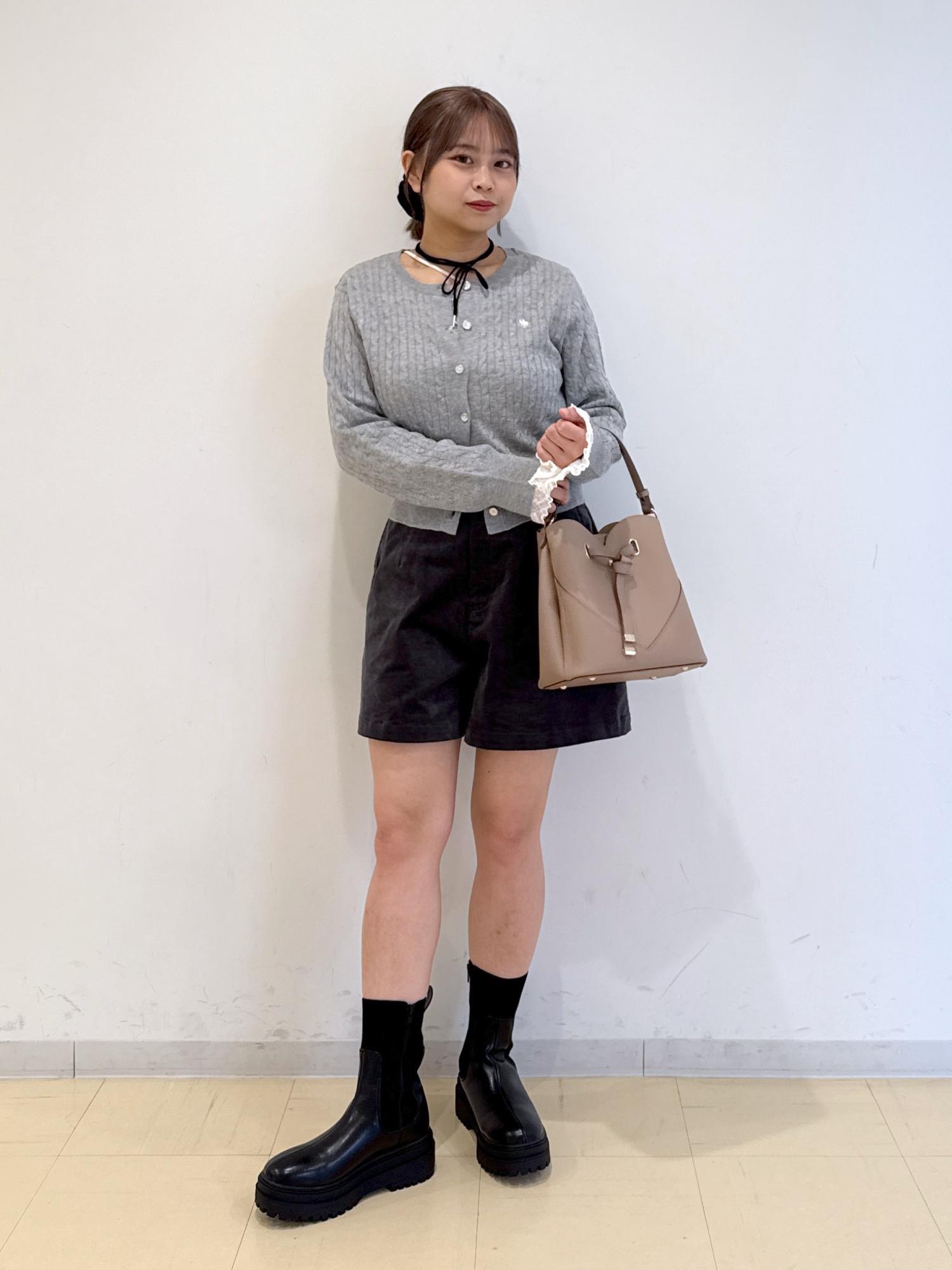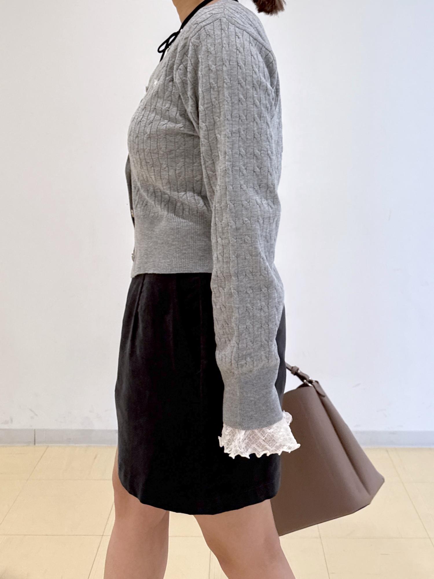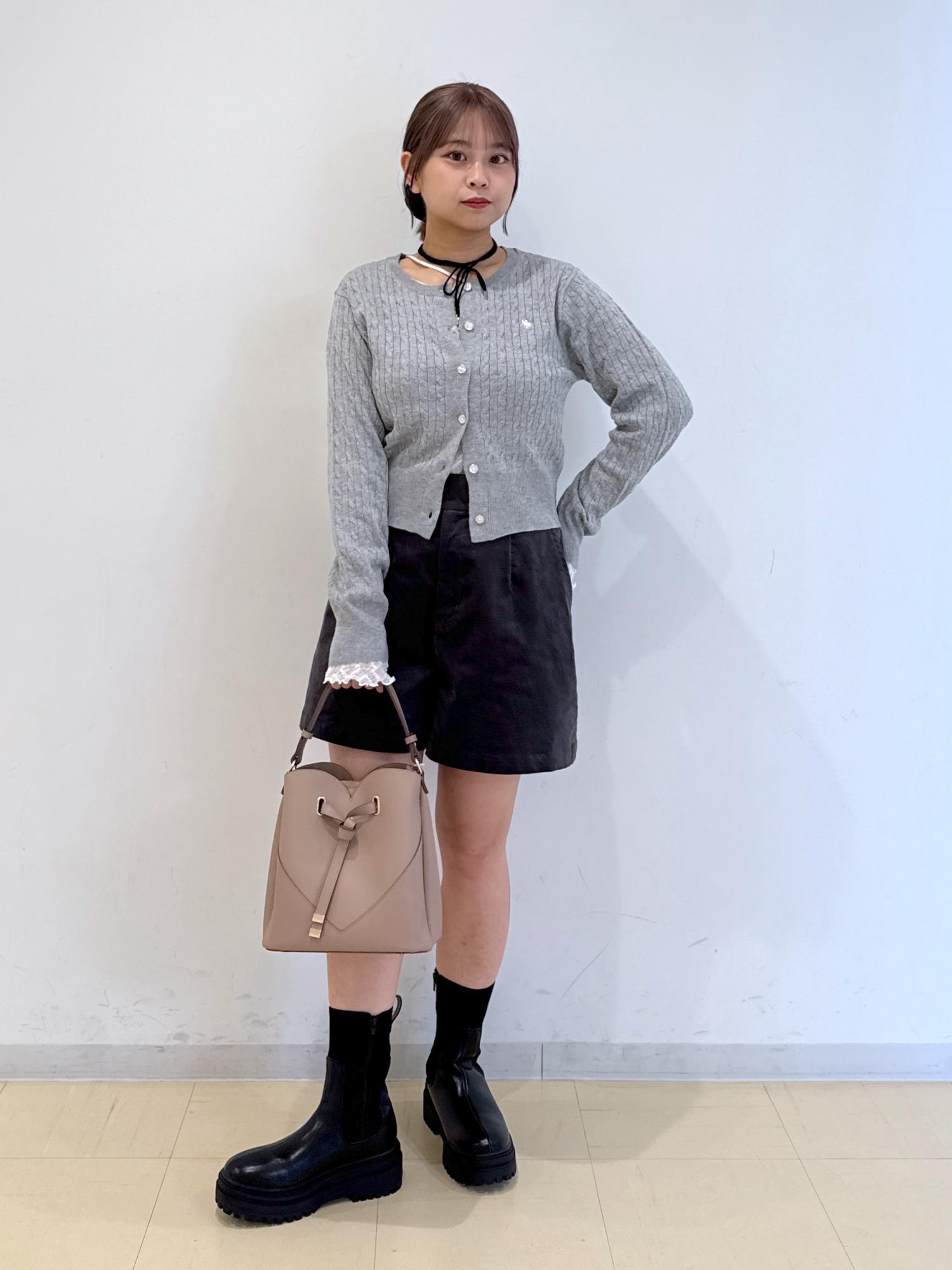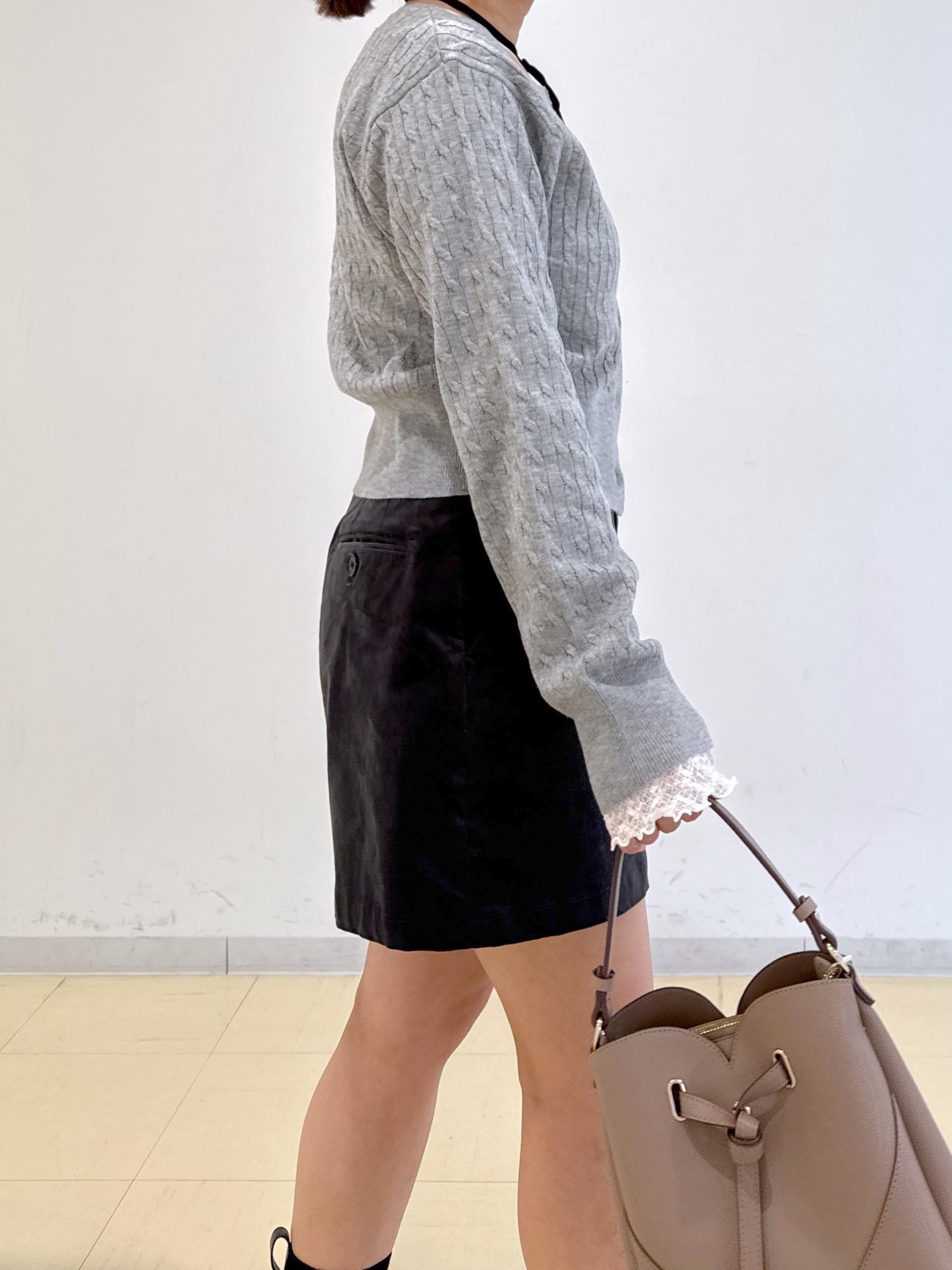 ハートカットバッグの新色のミルクティーチョコをコーディネートの差し色にし、カーディガンのインナーもレースにすることでコーディネートに柔らかさをプラスしました!