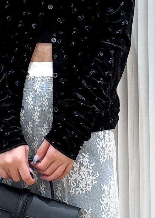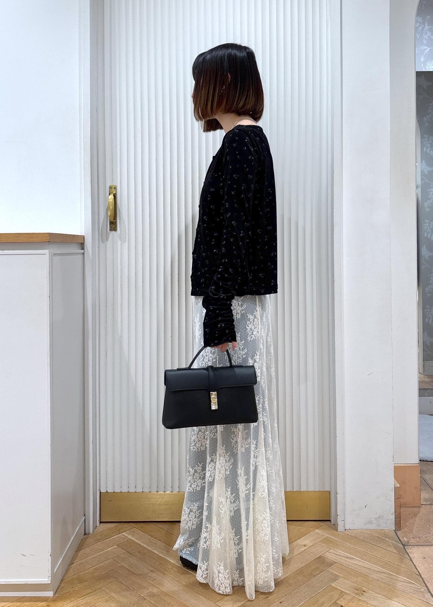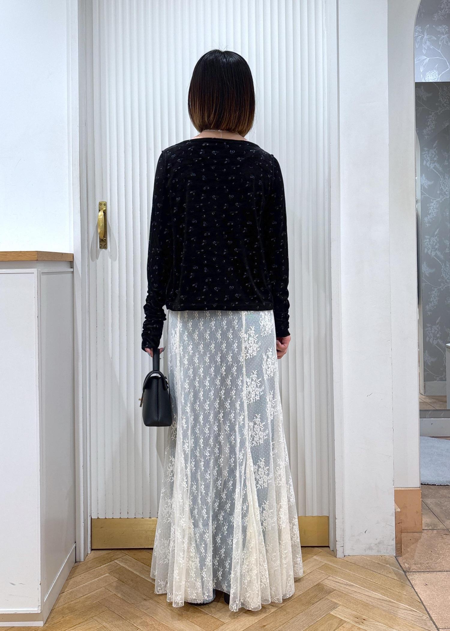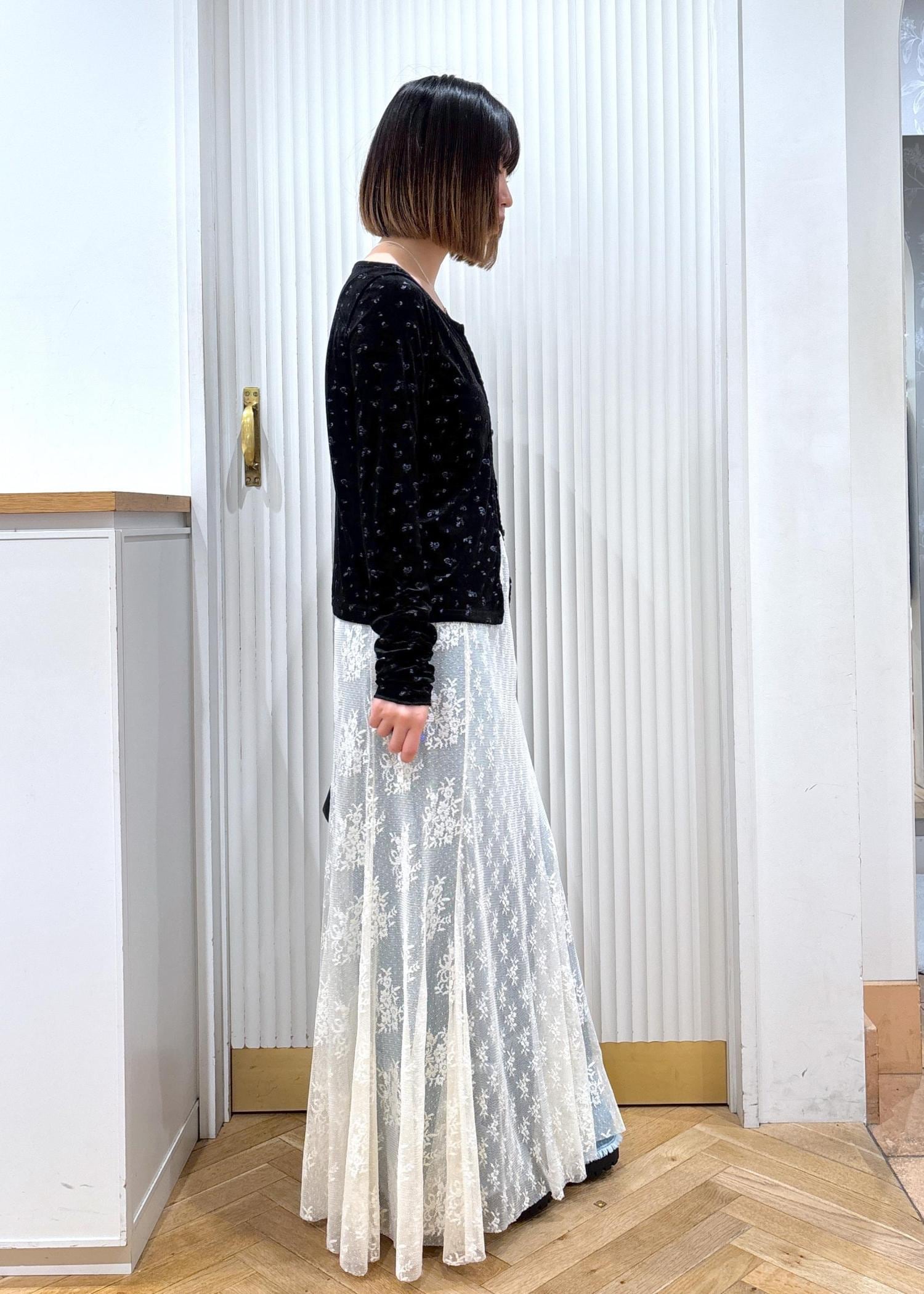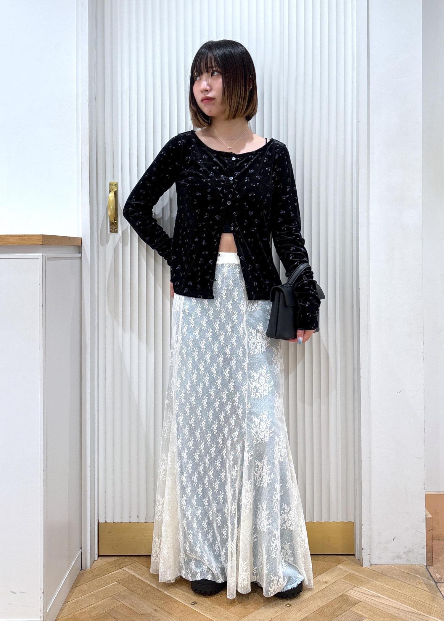 ベロアのカーディガンにデニムとシンプルなコーディネートですがレースのスカートを上から重ねることでより華やかになります!柄が多いので色味をモノトーンに抑えることでうるさくなりにくいです。小物を黒にすることでコーディネートが締まり大人っぽい雰囲気になります。