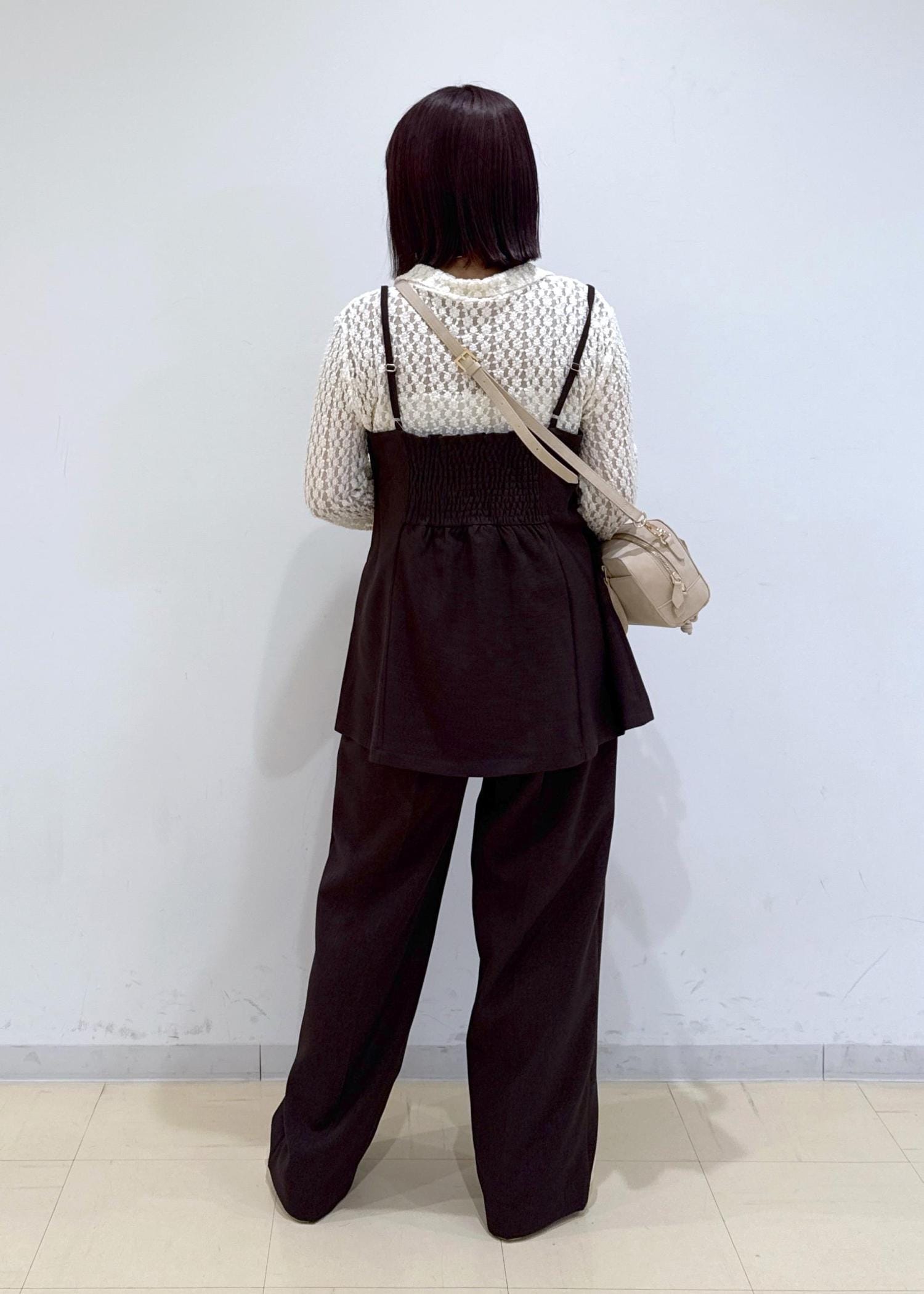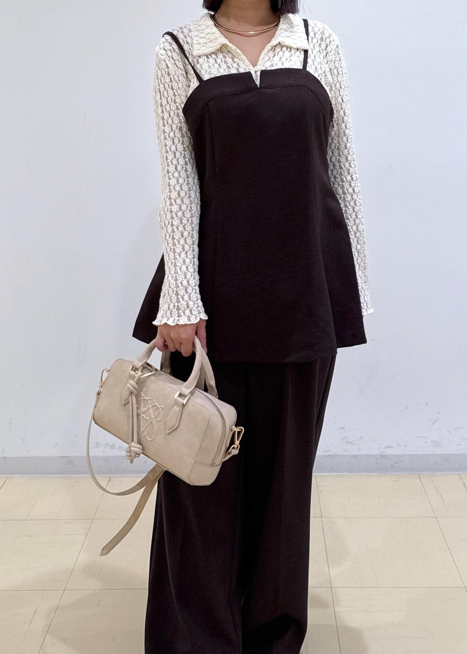 ブラウンのセットアップのインナーを衿つきのレースで合わせることでシンプルになりすぎない一癖あるコーディネートにしました♩