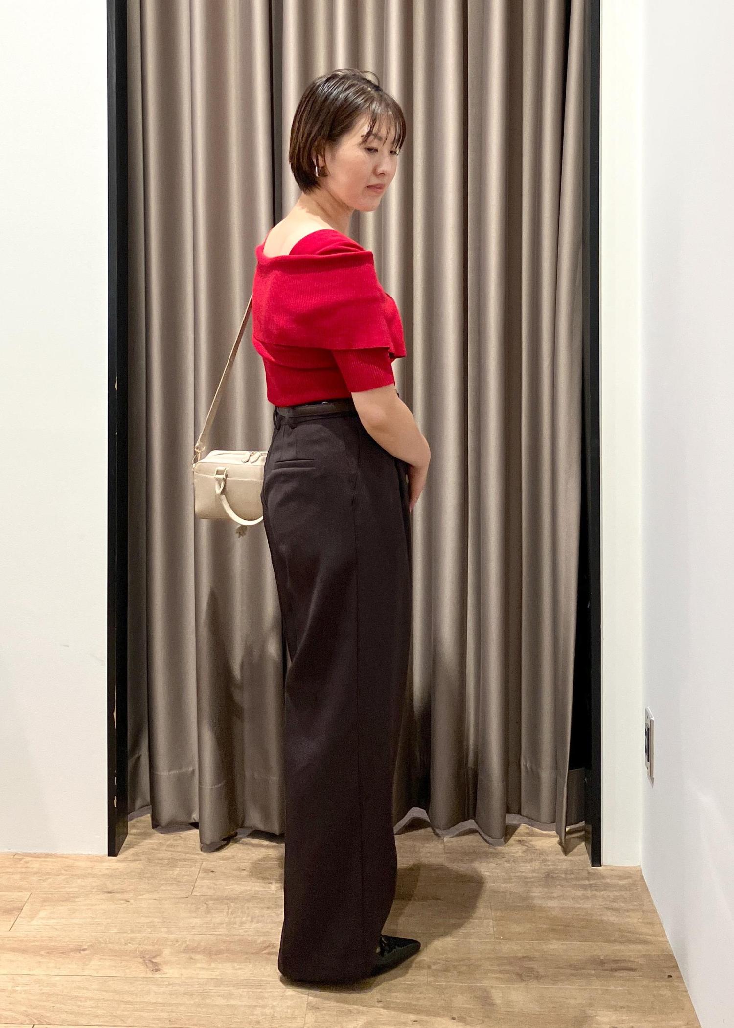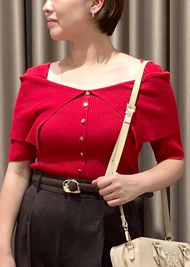 VISビックカラーオフショルハーフスリーブニットレッド / F¥2,963レビュー大きめな衿がポイントの1枚で決まる華やかなデザインのプルオーバー!V肌を見せすぎないフェミニン感もあり肩マチもあるの安心!細めのリブなのですっきりしたシルエットに!