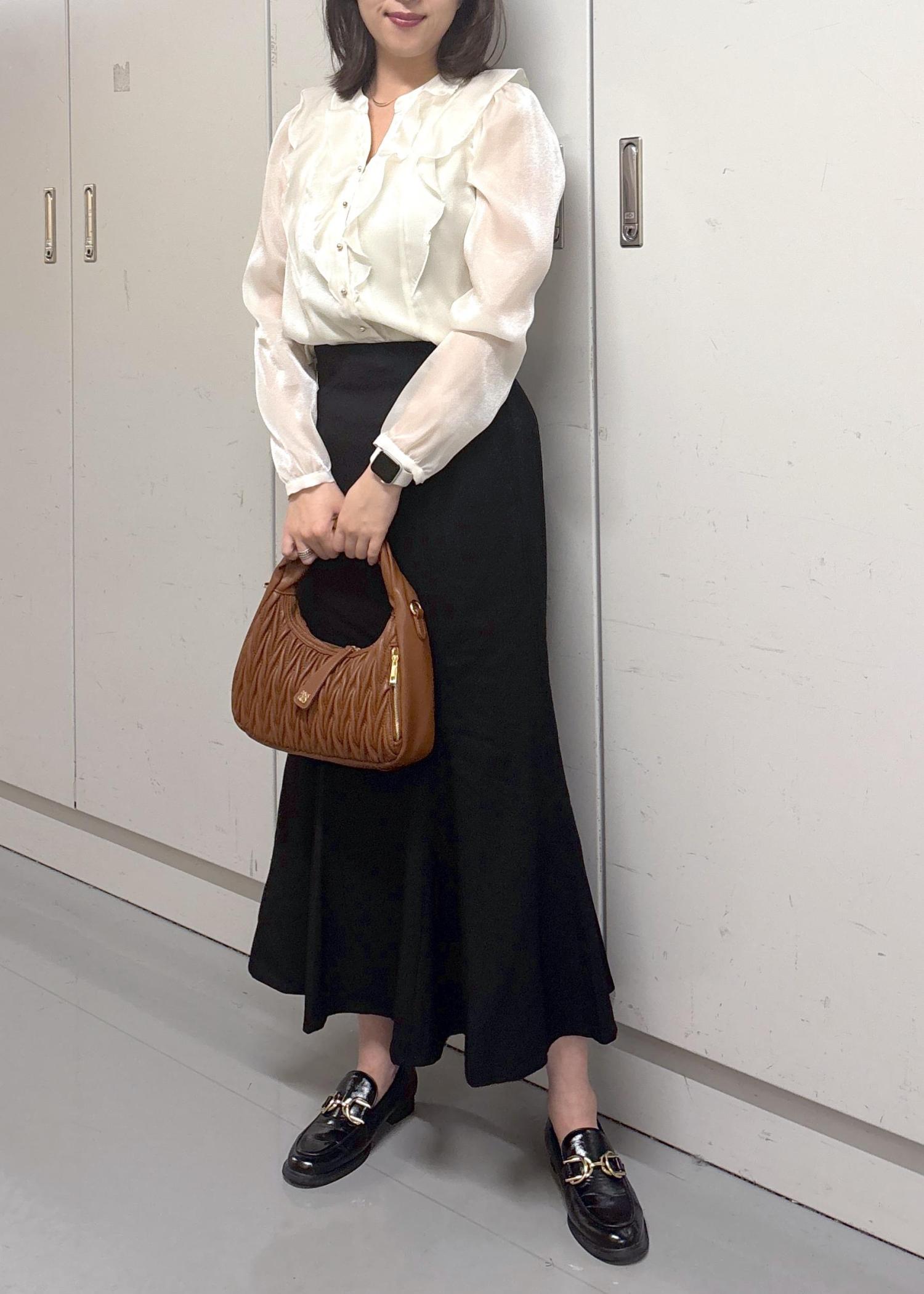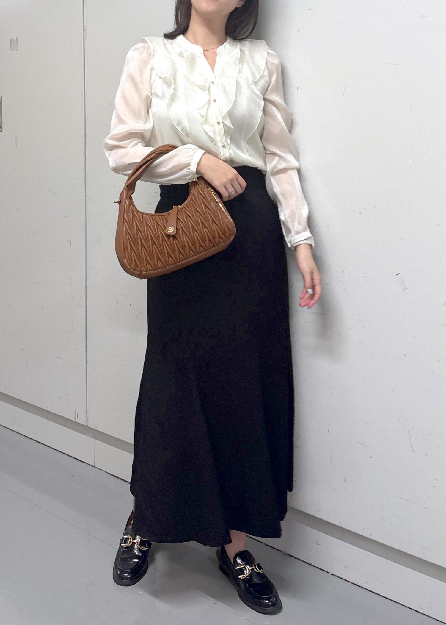 洋服は無地で合わせるとバッグのデザインが引き立ちます。 -
