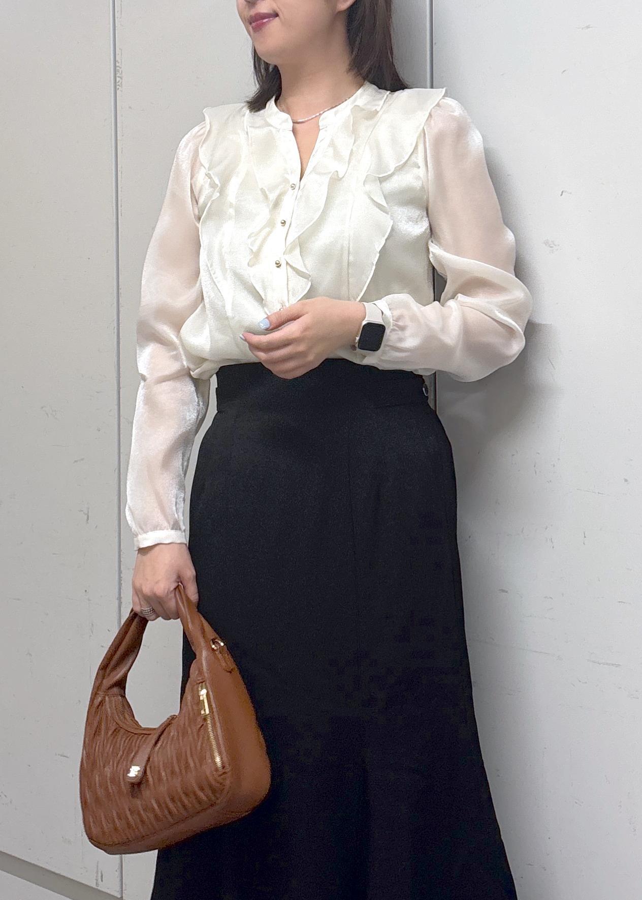 VISシアーラッフルブラウス/イージーケアキナリ / F¥3,842レビュー手首までしっかり長さありました。肩幅は細めです。腕には裏地無いのでしっかり透けます。着丈は短くてスカートにインしましたが、手を挙げると出てきやすかったです。