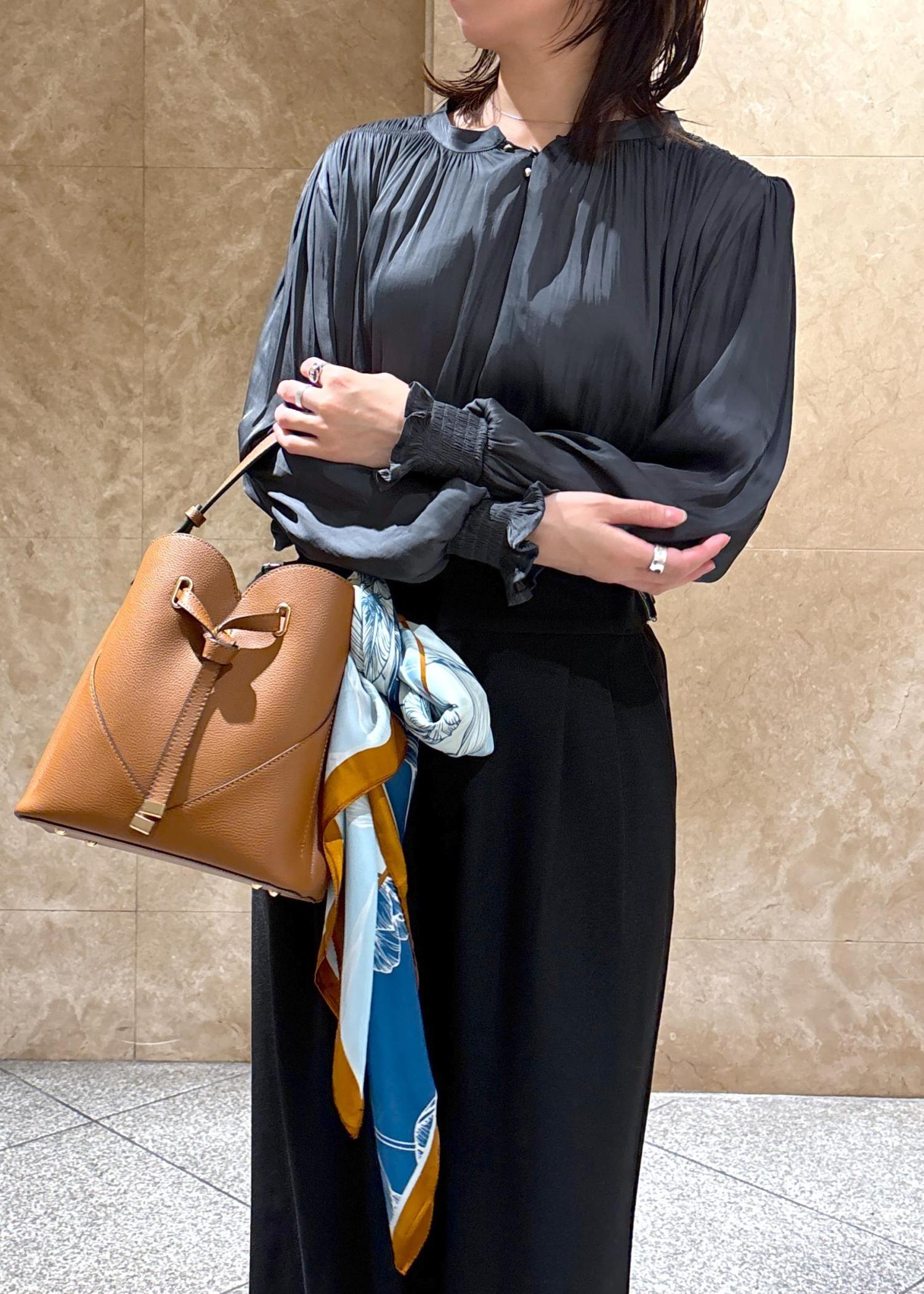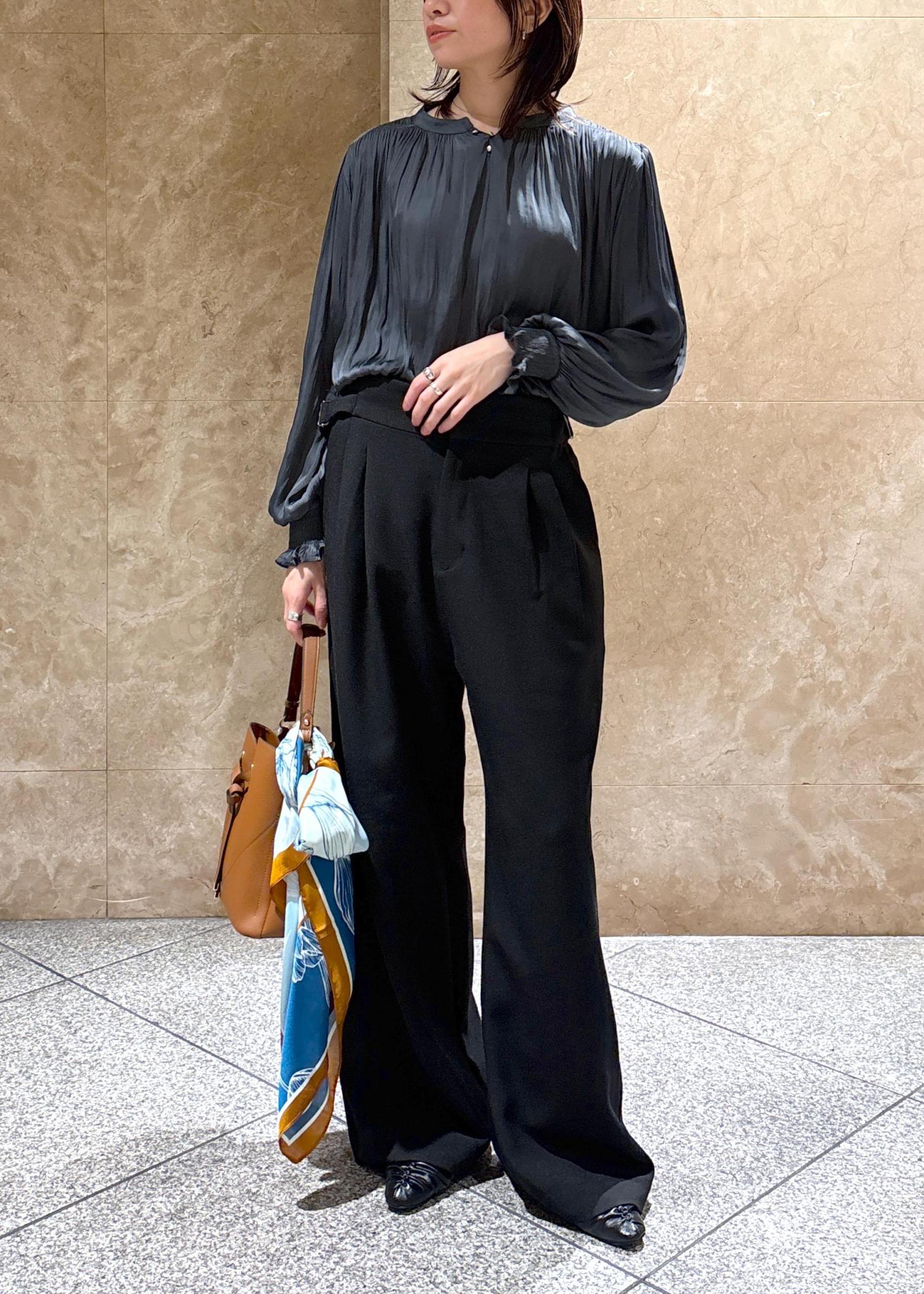 VIS割繊シャーリングブラウス/2WAY・イージーケアチャコール / F¥5,489レビューゆとりのあるサイズ感ですが、テロンとした落ち感のある素材なのでスッキリ着膨れしなかったです✨