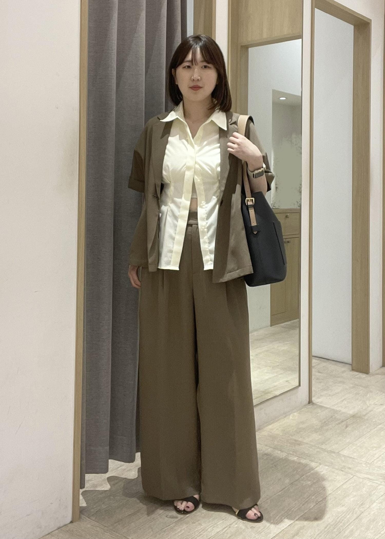 身長155センチでMサイズ着用。サイドウエストのボタンを左右締めて調整して、長さはフルレングスになります。 -