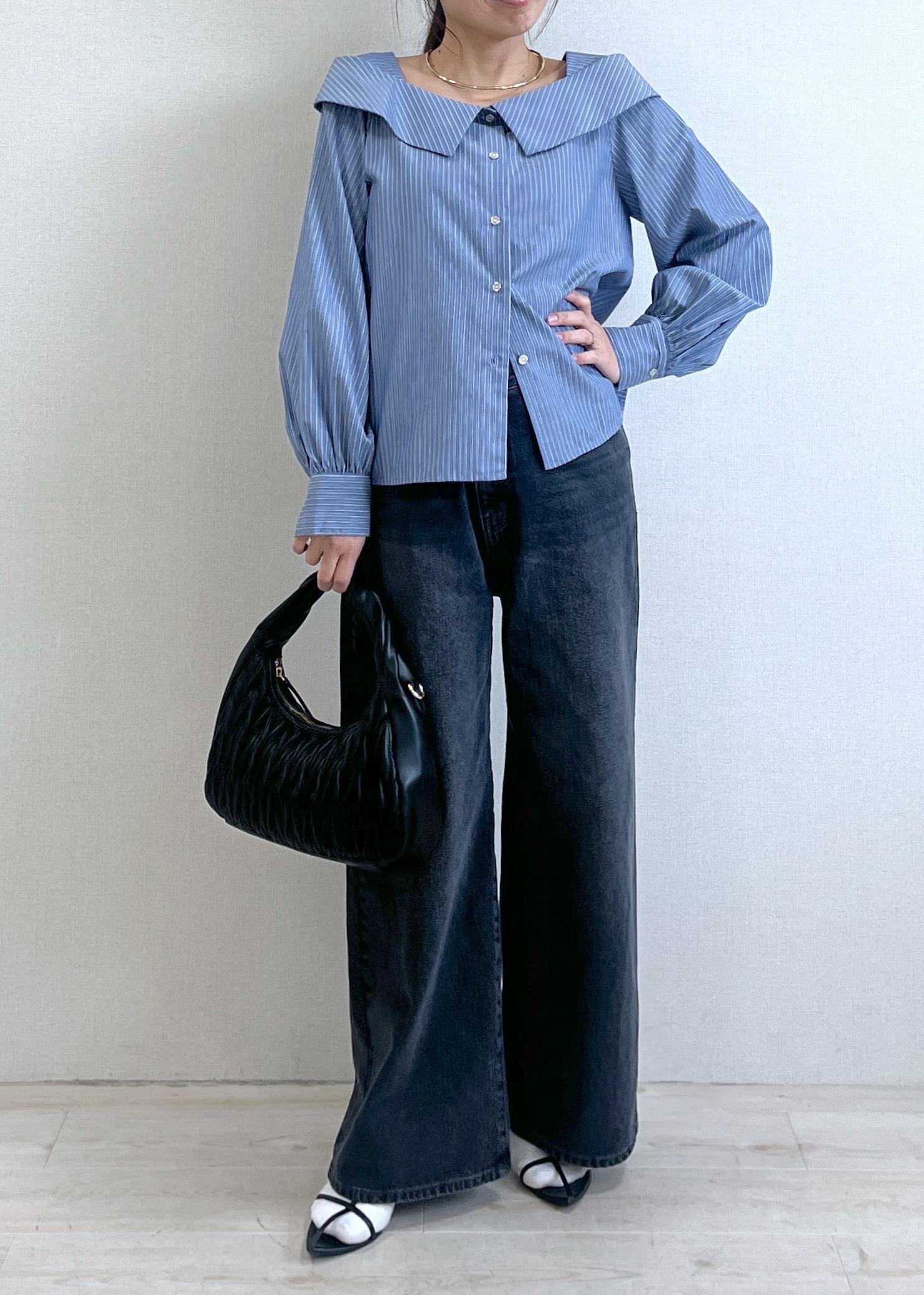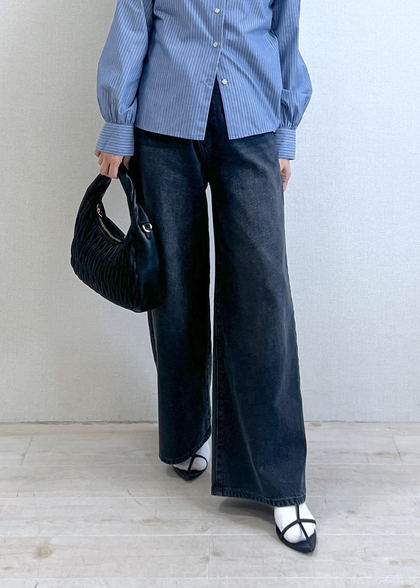 ブラックのワイドデニムと合わせれば、リラックス感のある大人カジュアルに。