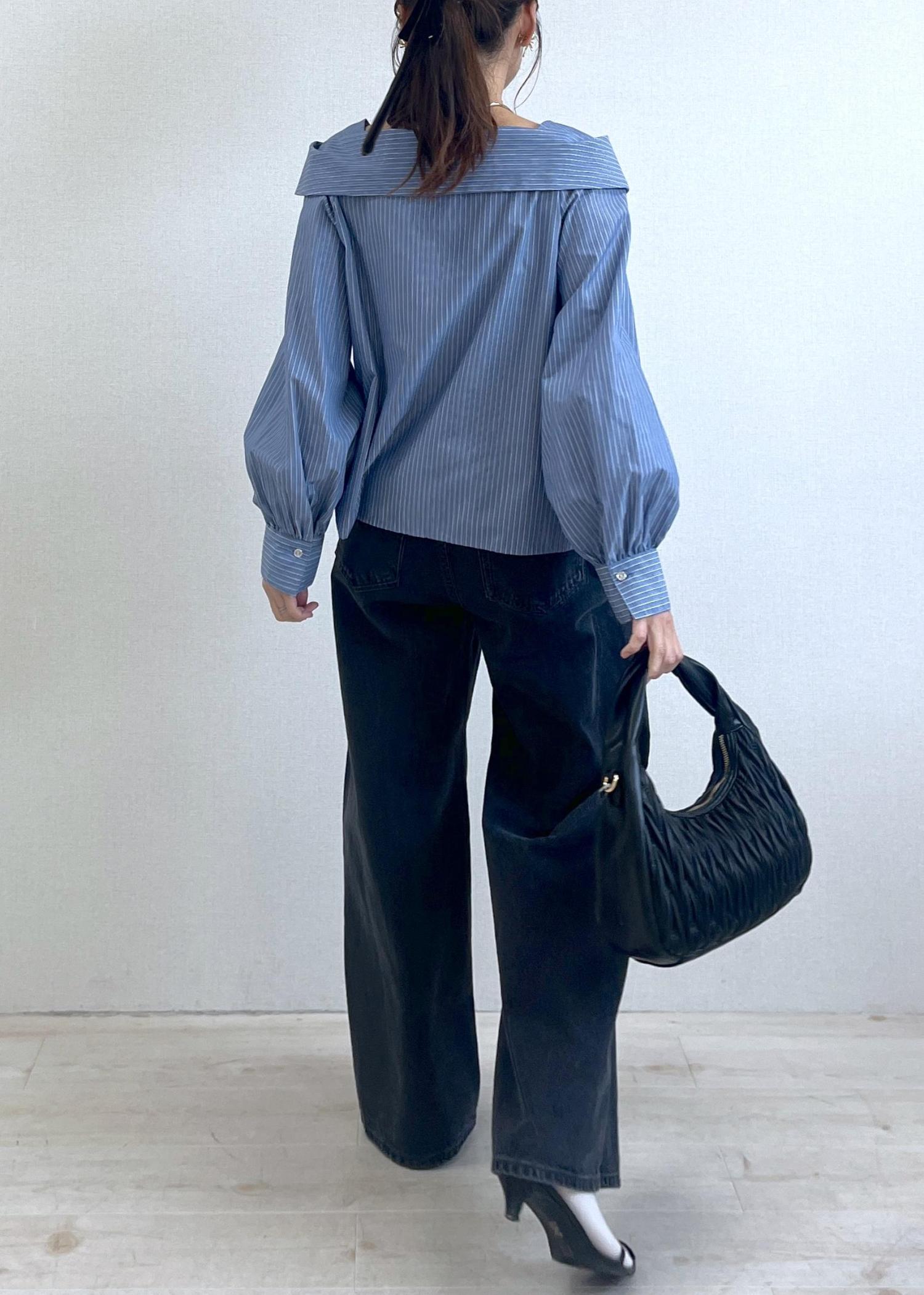 オフショル風デザインが人気のストライプシャツは、ほどよい肌見せでこなれ感抜群。