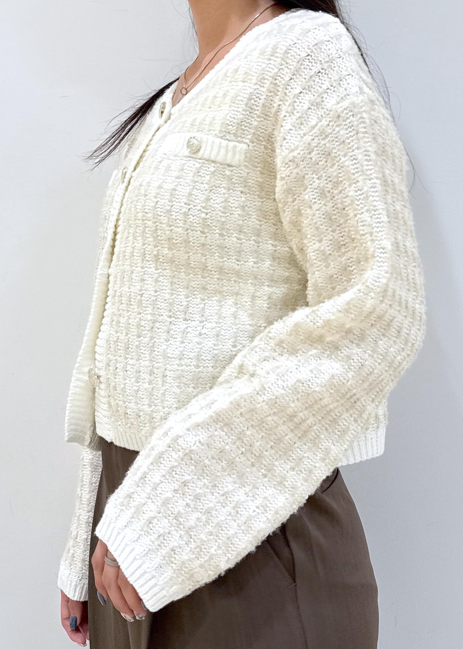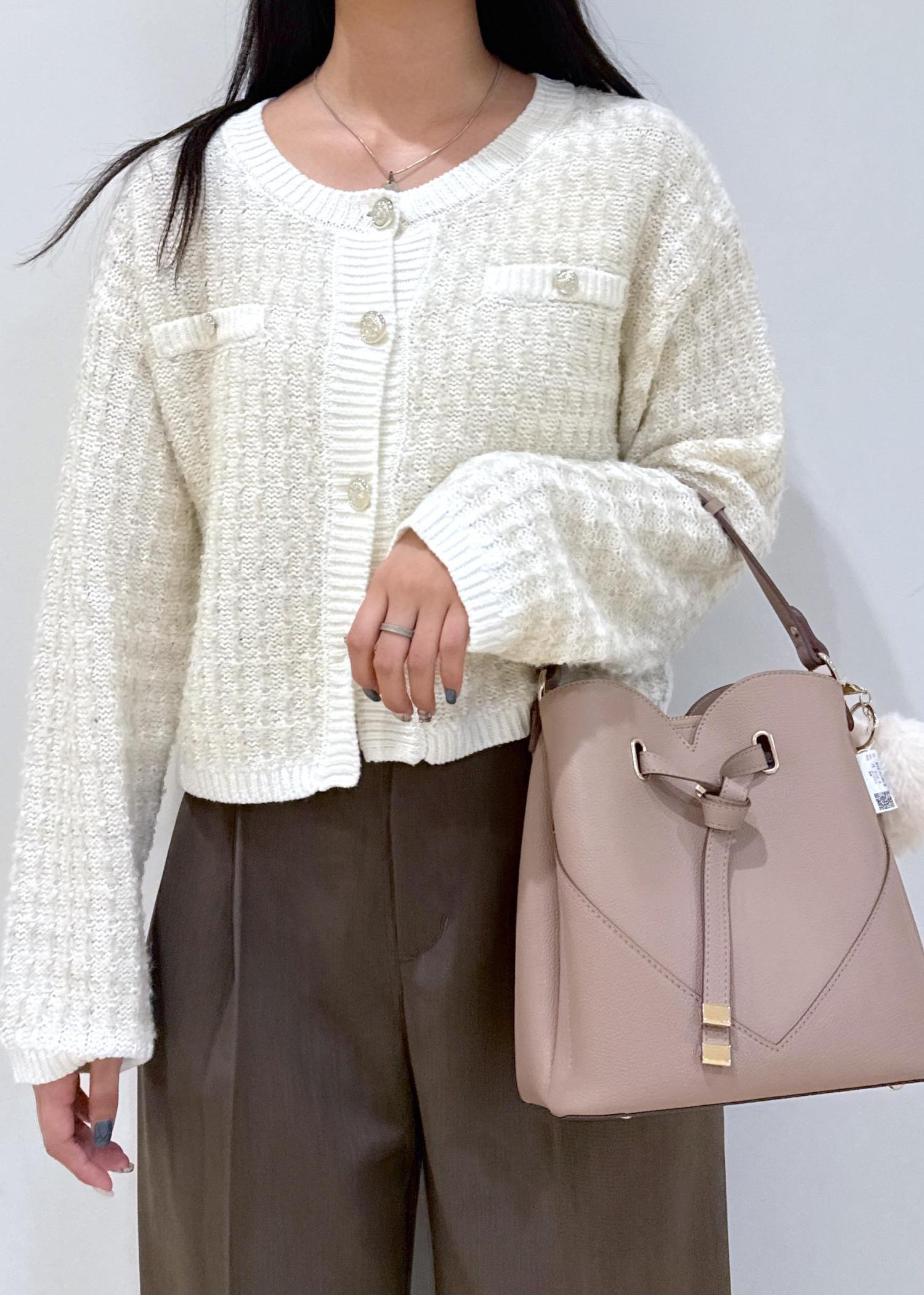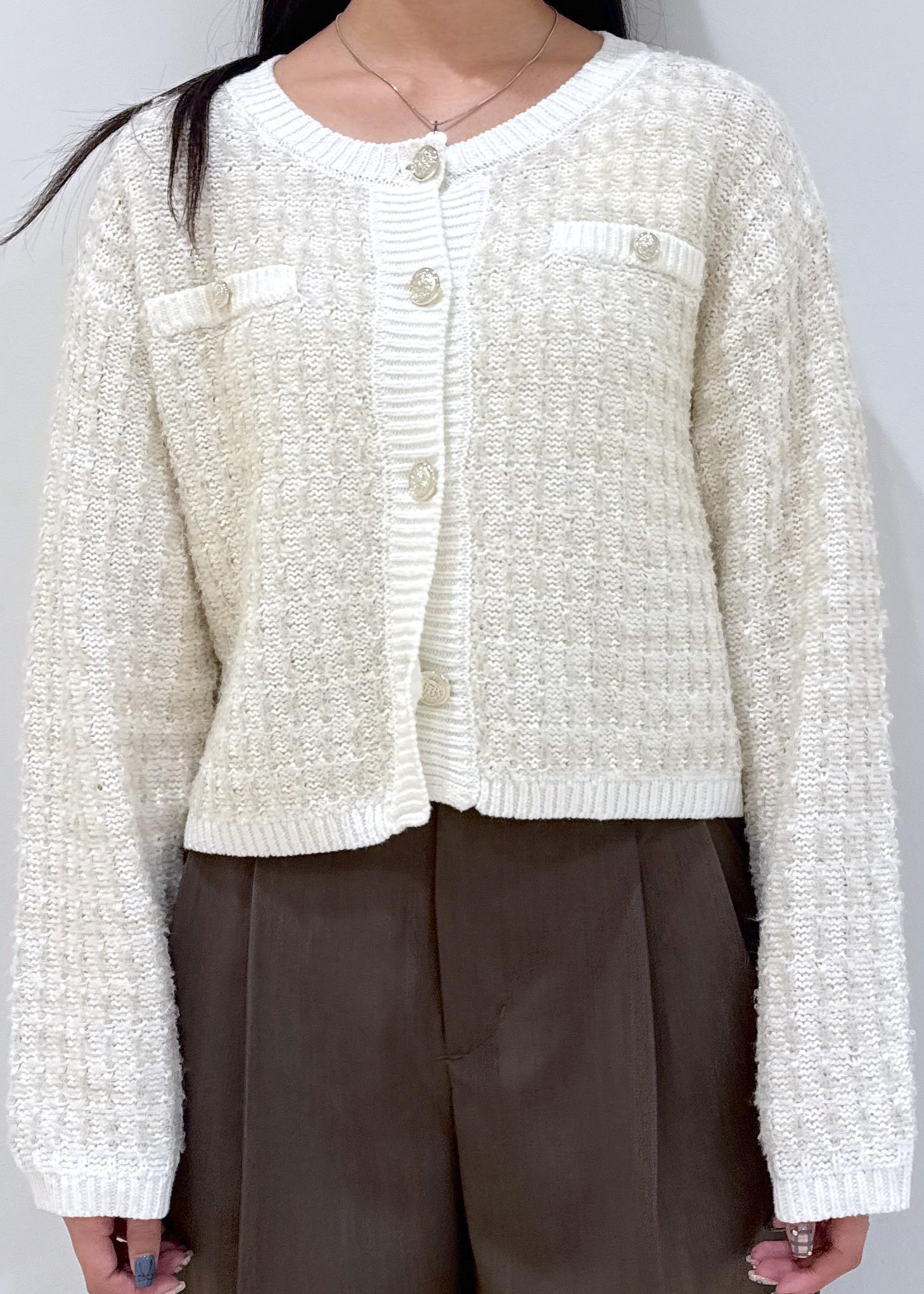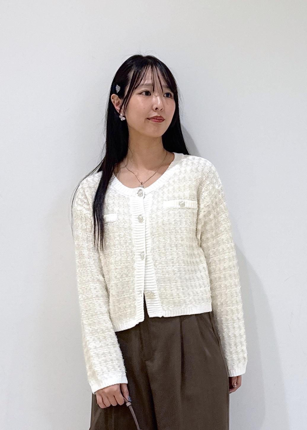 VISファンシーツイードメタルボタンカーディガンオフホワイト / F¥6,589レビュー生地が思ったよりも薄めでゆったりとしたデザインなので、中に着込むこともできます