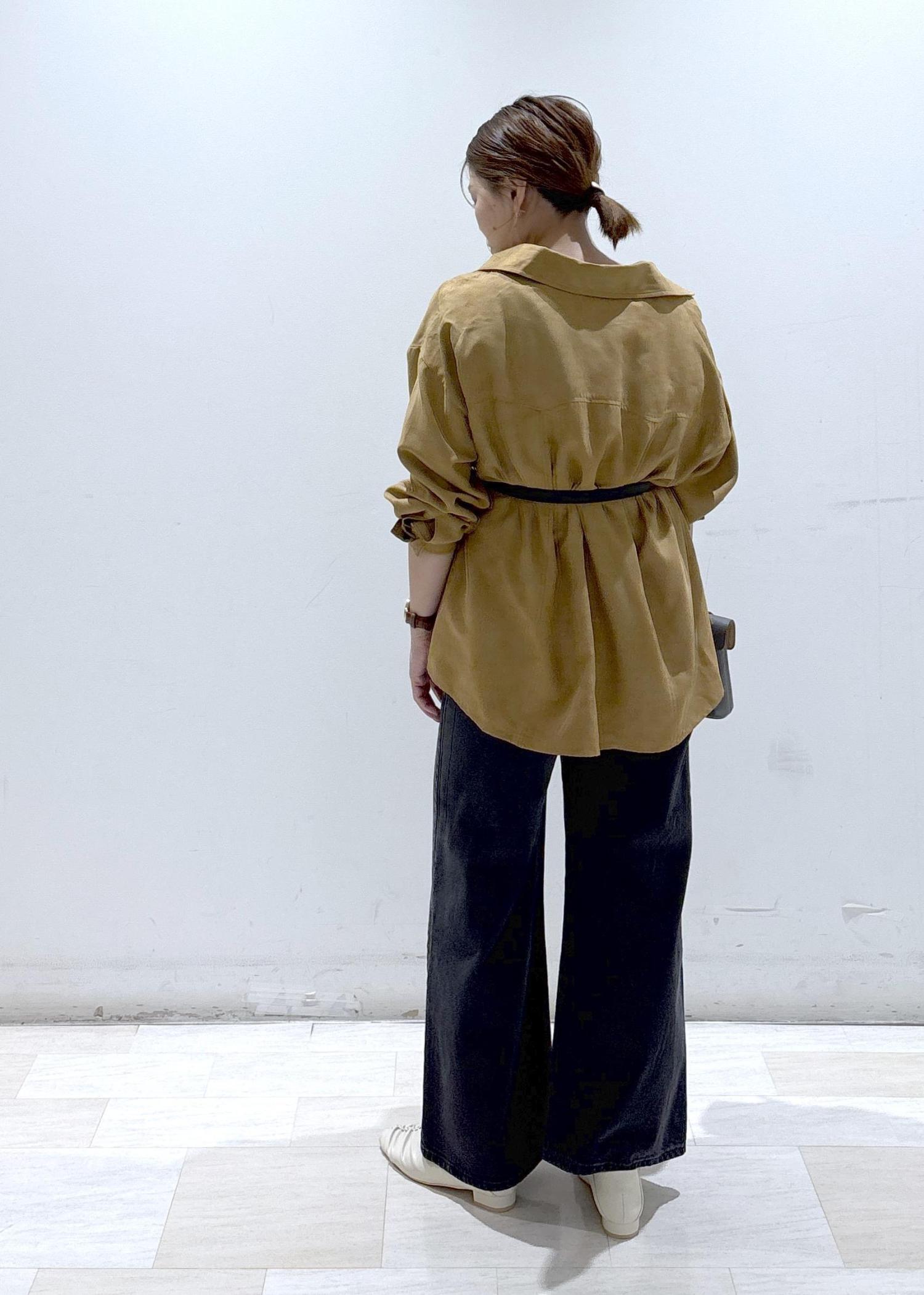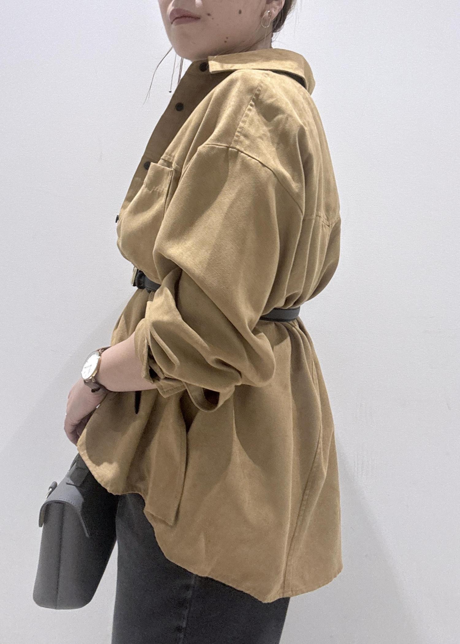 スエード調の素材で柔らかく厚すぎない生地感なので、晩夏から秋に向けての季節の変わり目時期にピッタリです。 -