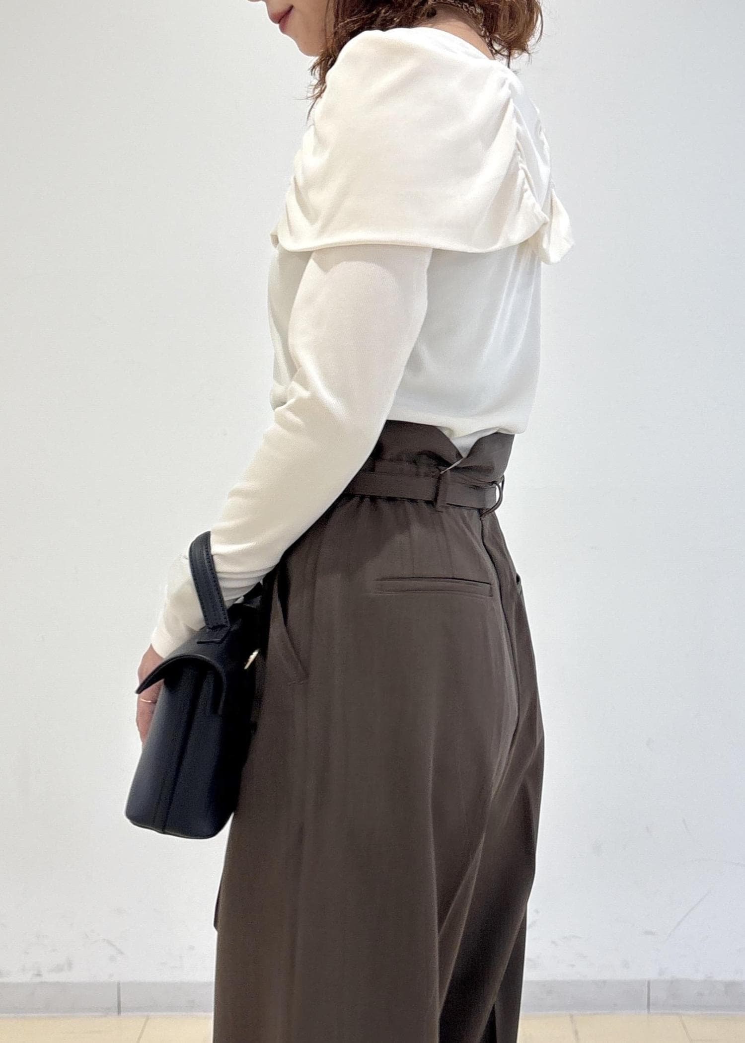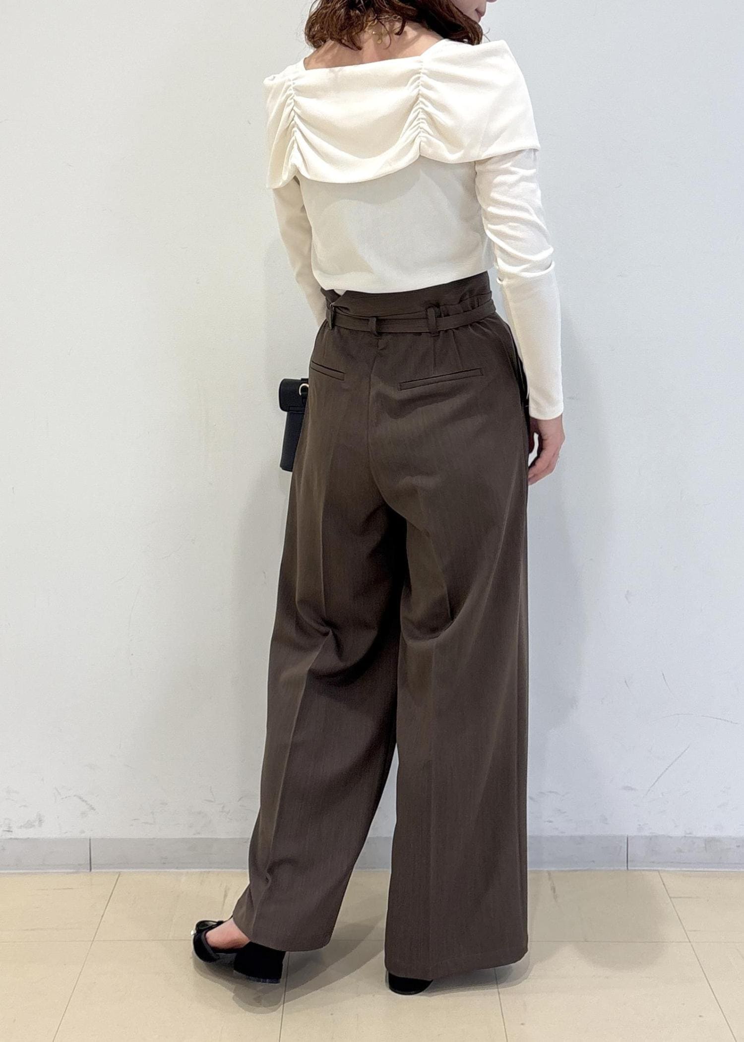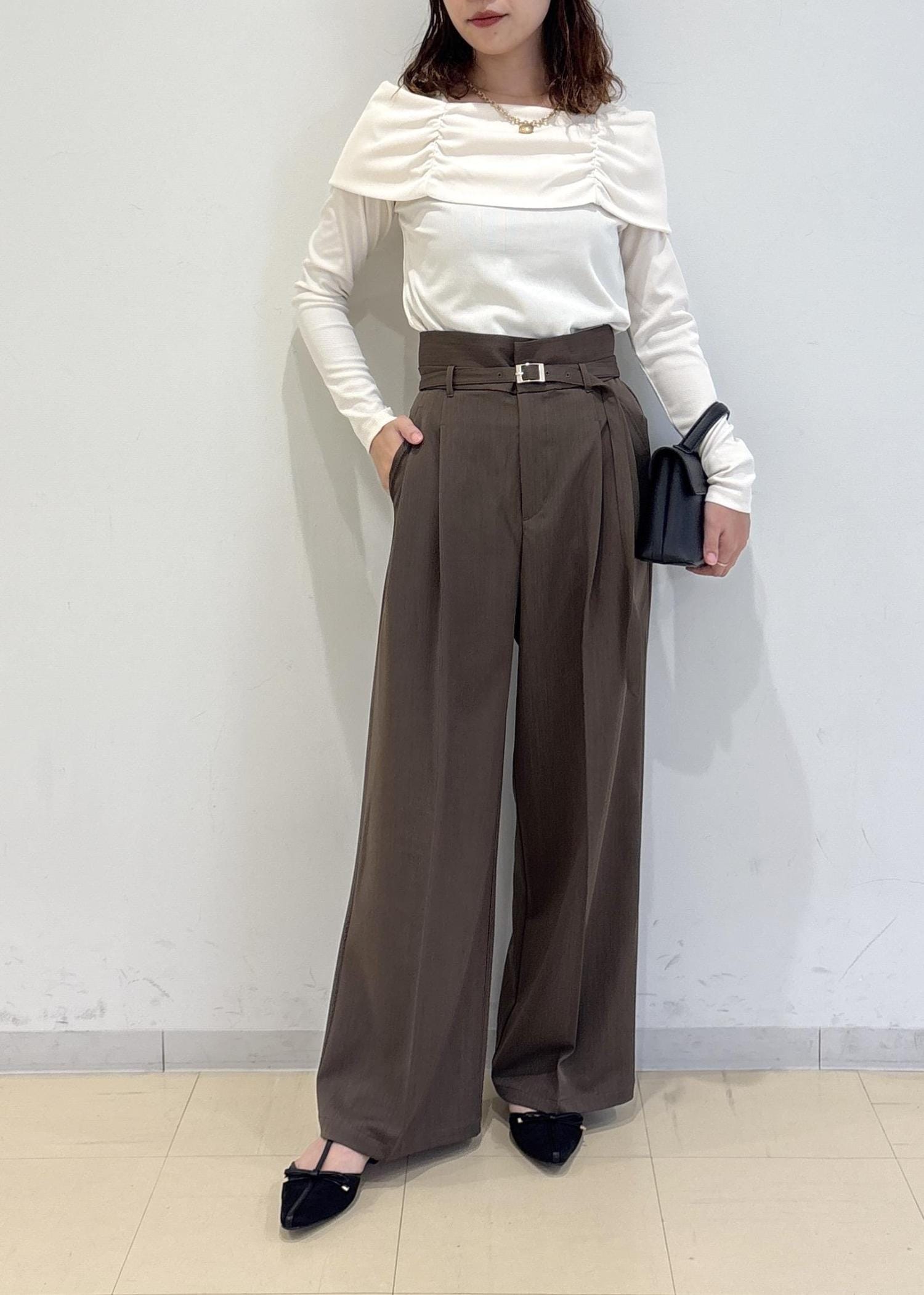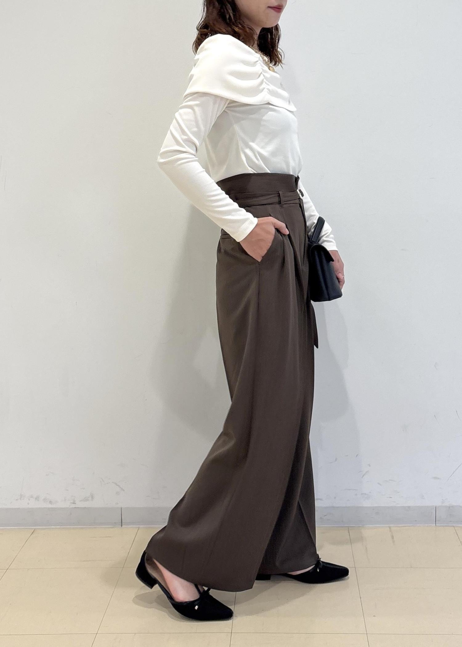 ハイウエストとタックがあるデザインで腰の位置が上がって見えるので足が長く見えスタイル良く見えます! -