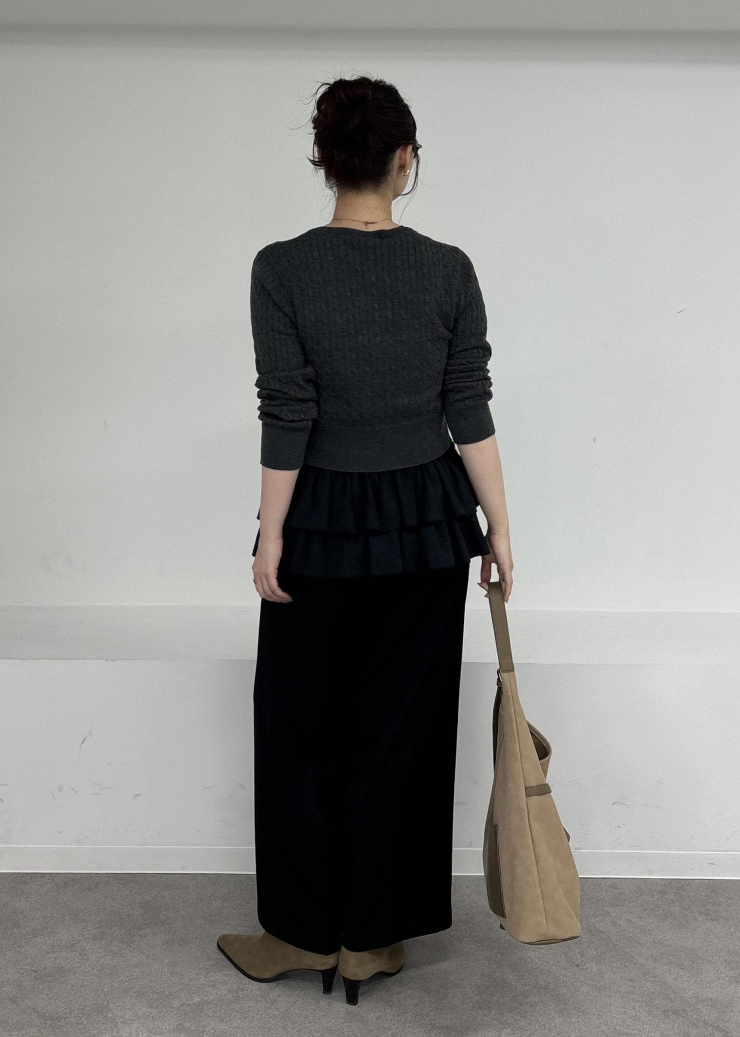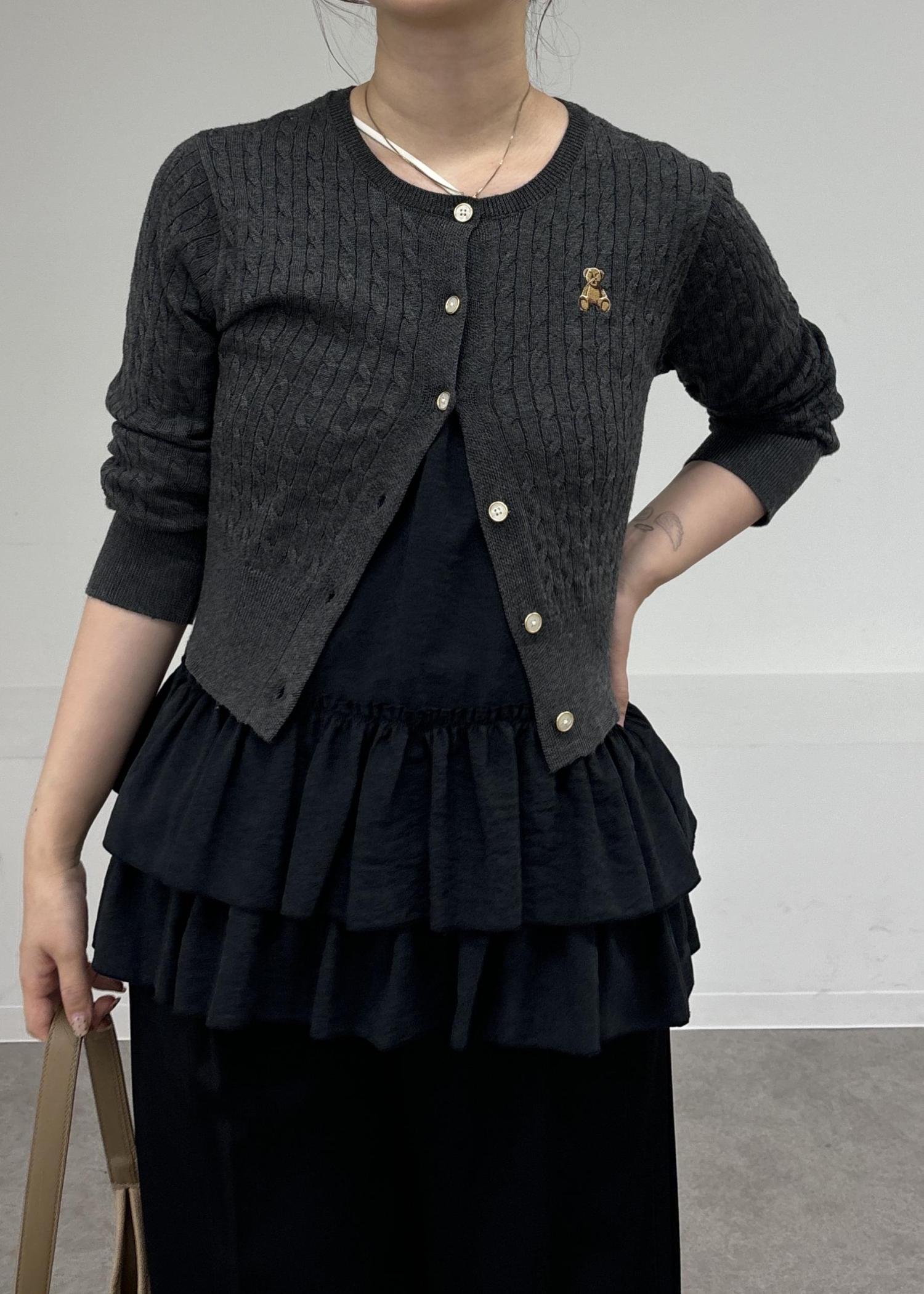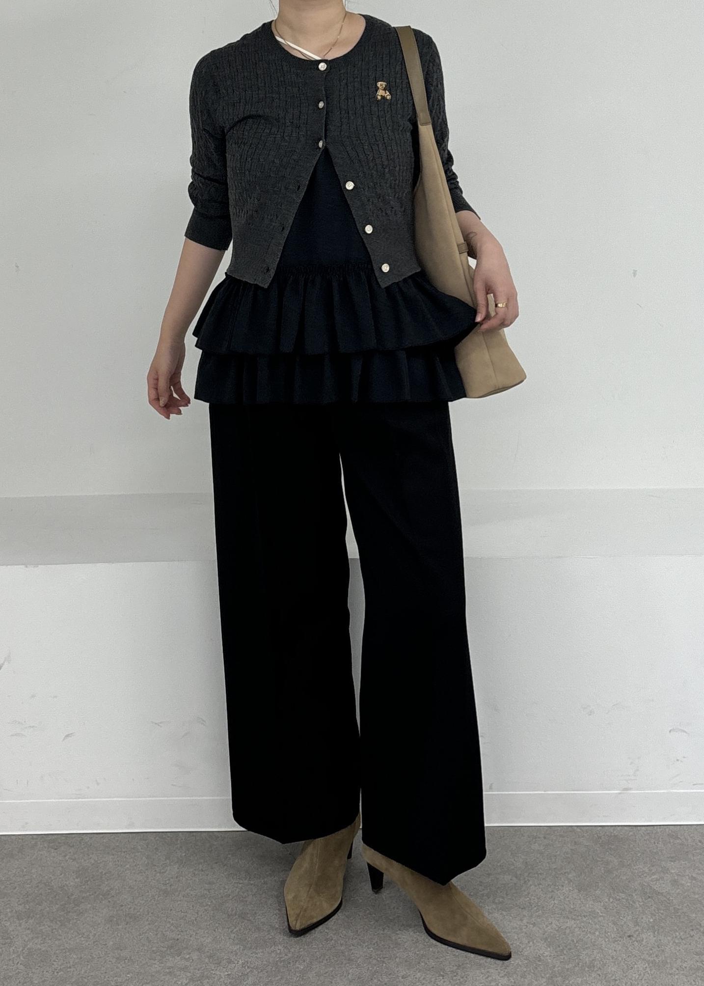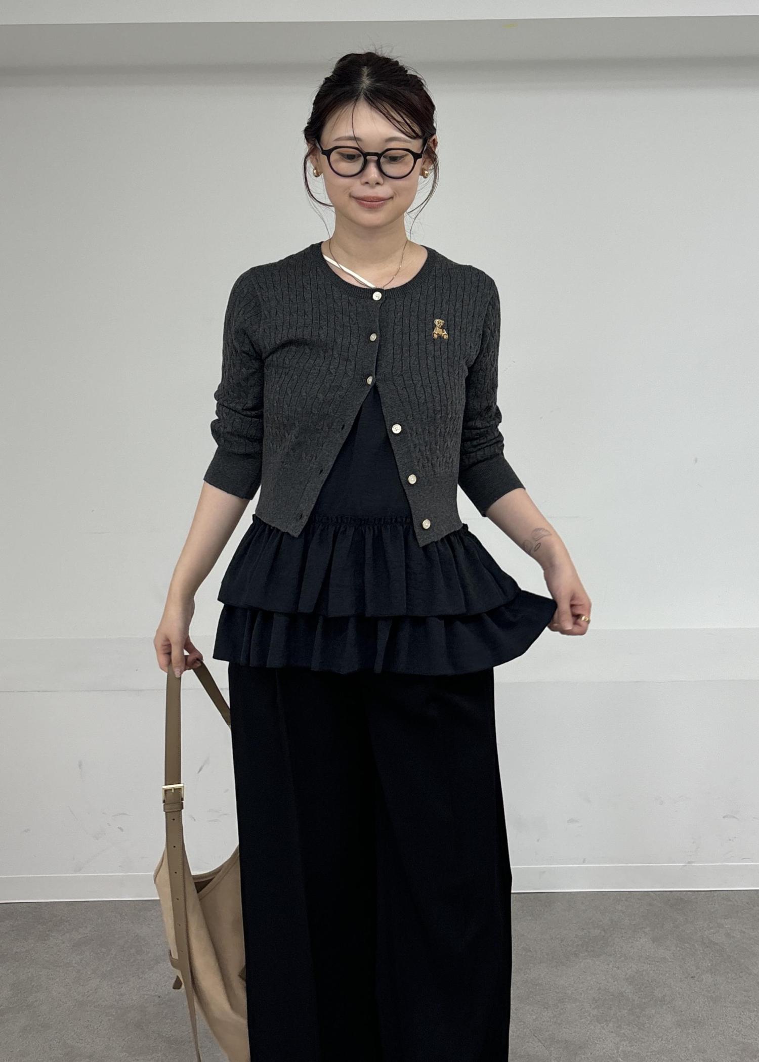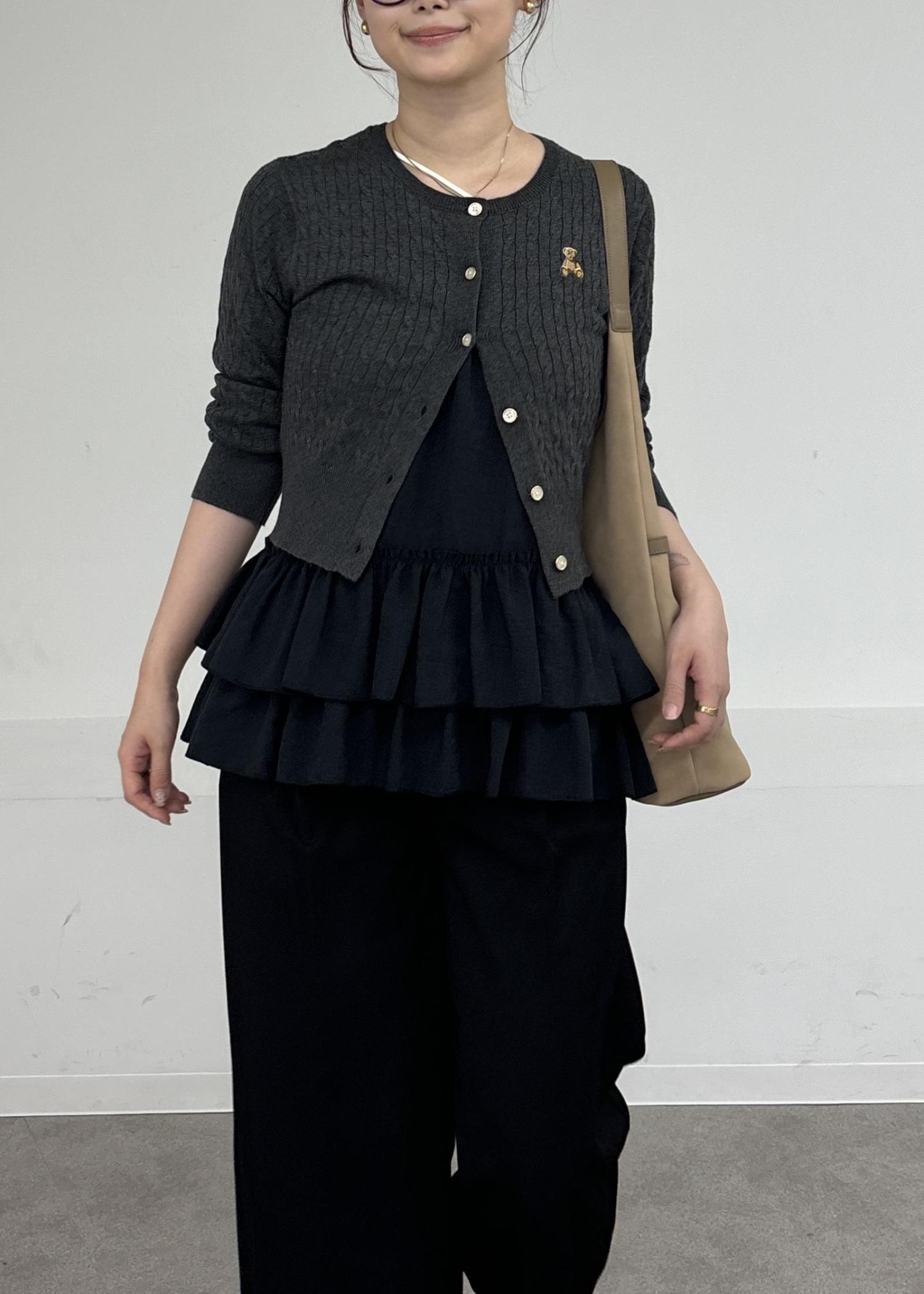 POLOのベアー刺繍がワンポイントになるケーブルカーディガンに、フリルアイテムをレイヤードし、きれいめパンツで合わせてみました!