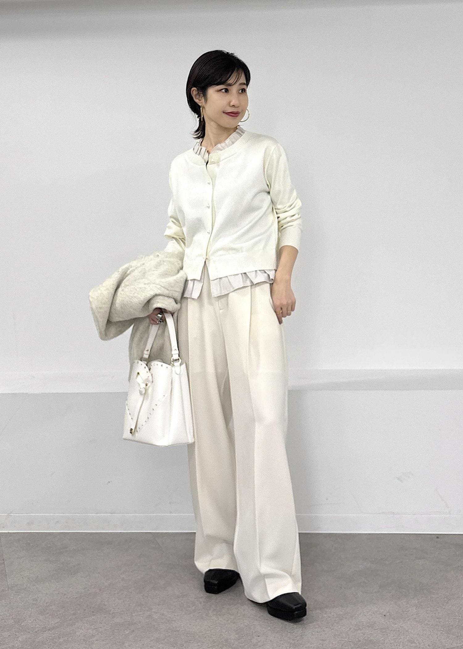 レイヤードスタイルしやすい長さにでき、チラッと見えてるだけでも広がりすぎないのでフェミニン苦手な方でも着やすいです! -