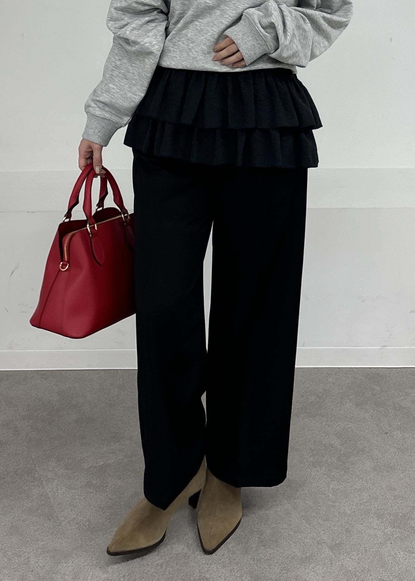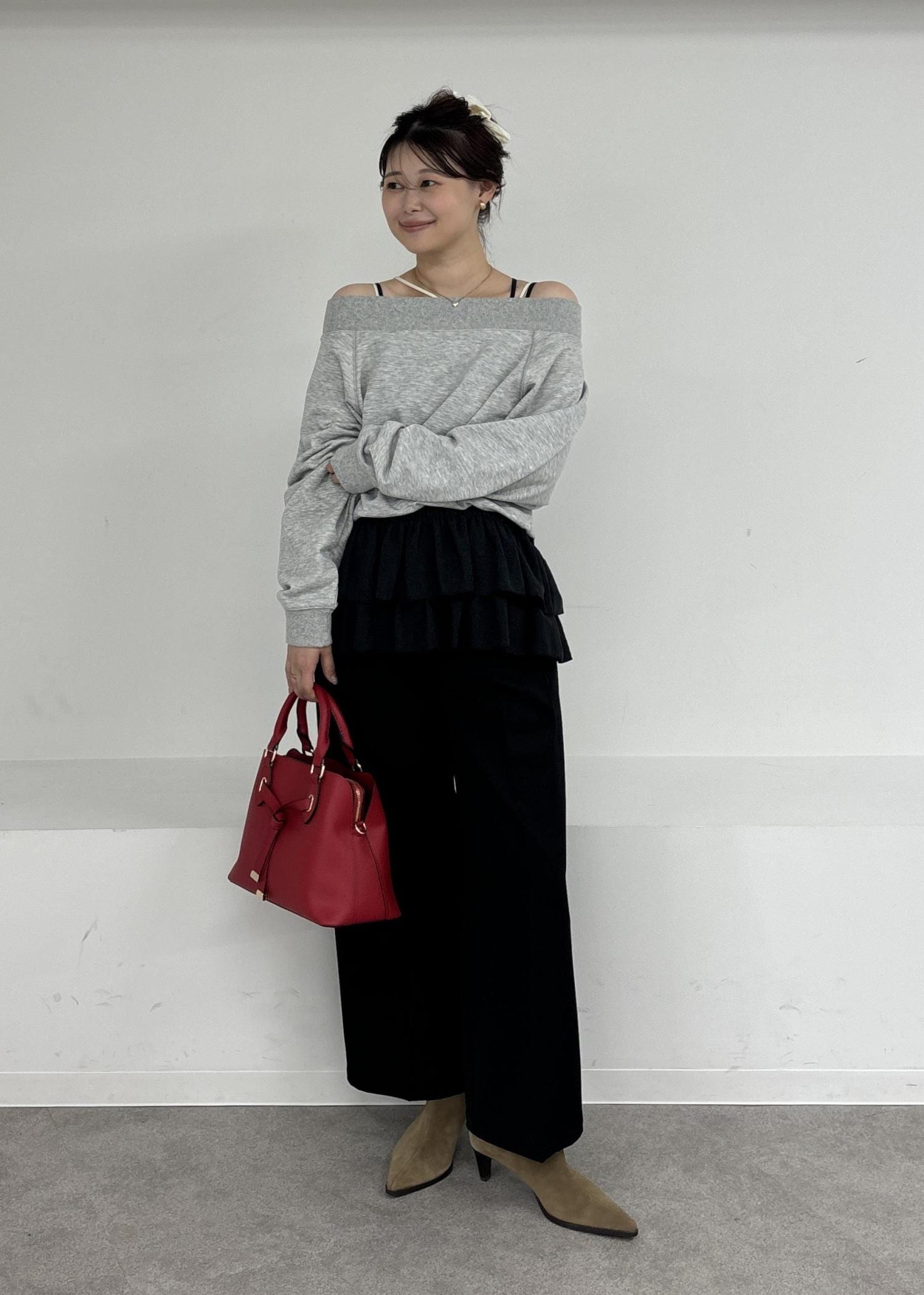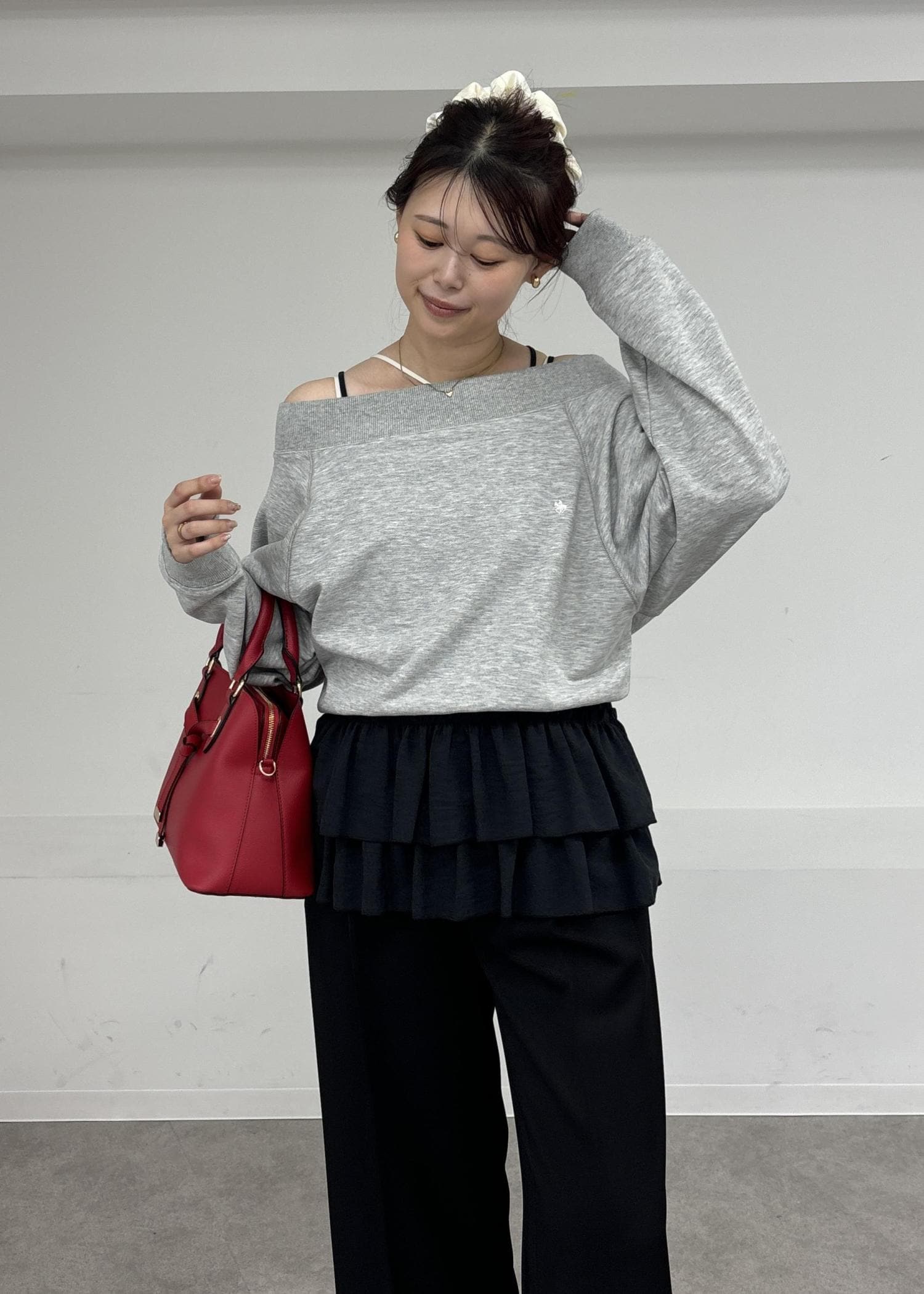 POLOのスウェットにフリルをレイヤードし、パンツスタイルカジュアル過ぎないきれいめなスタイリングにしてみました!