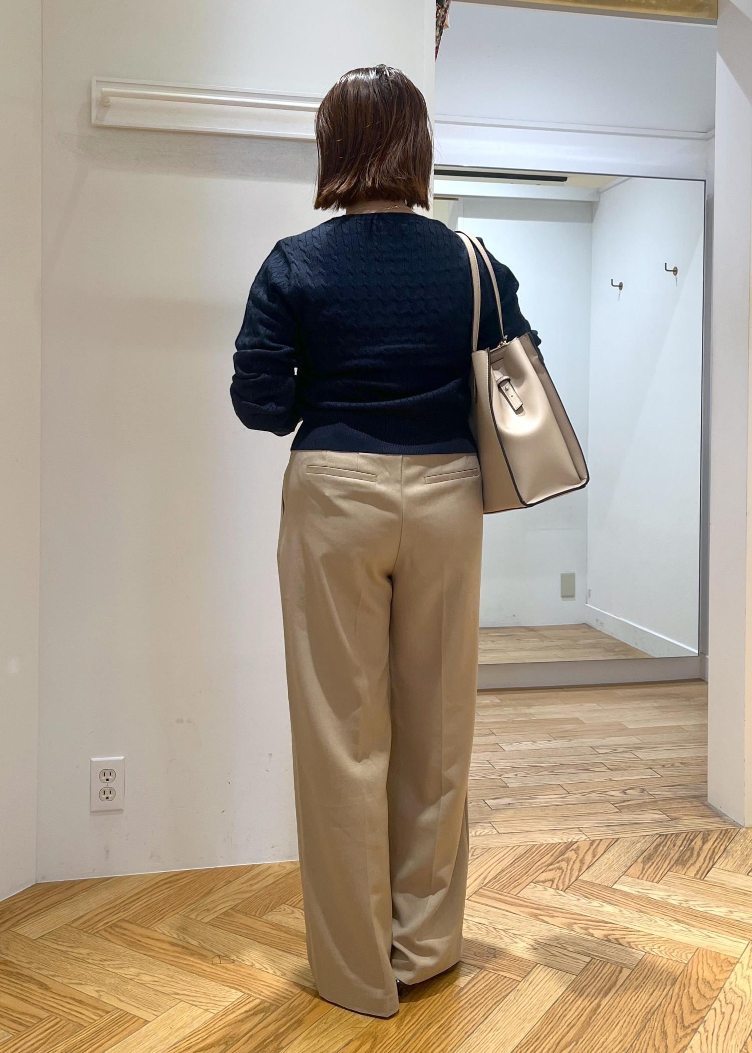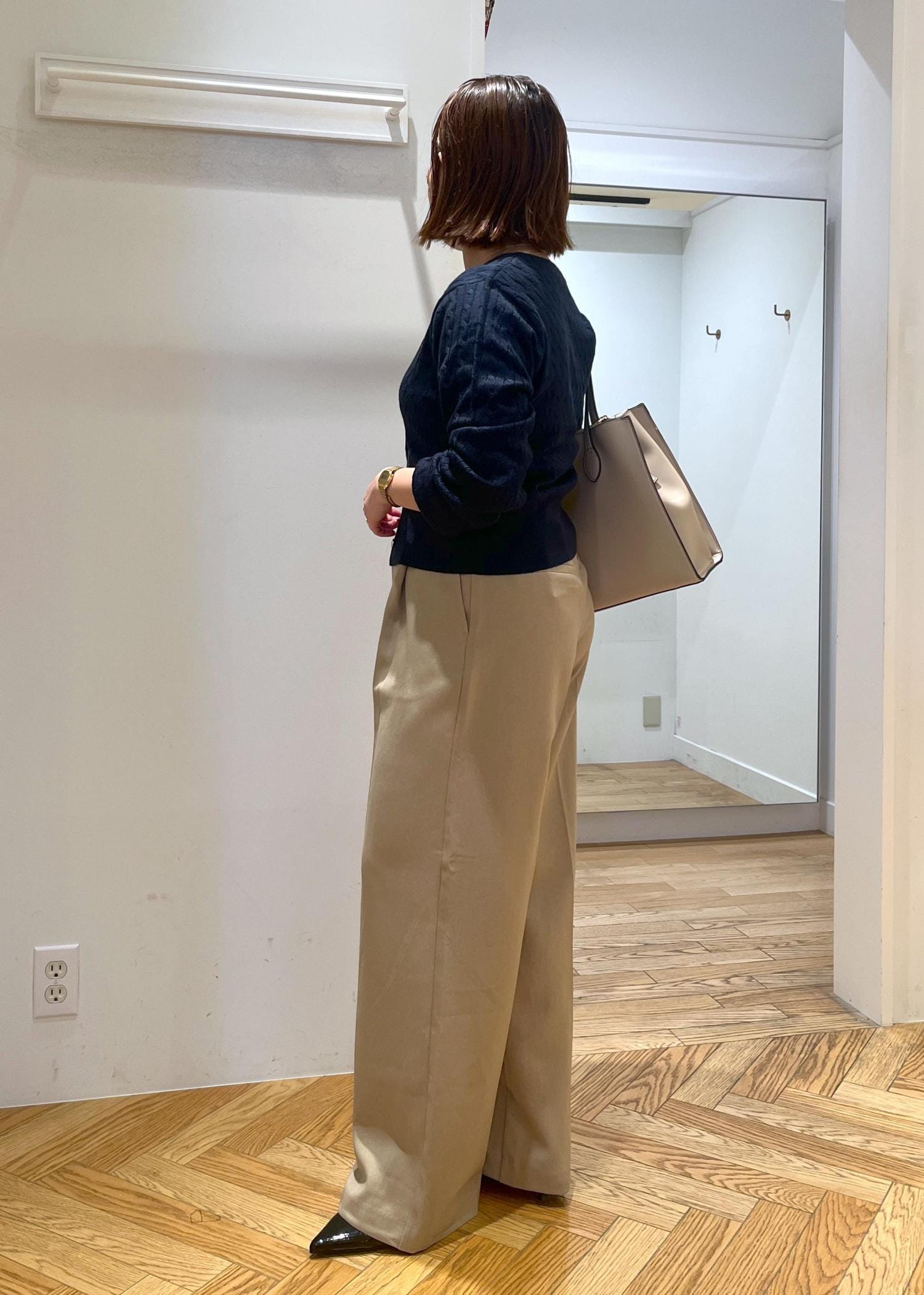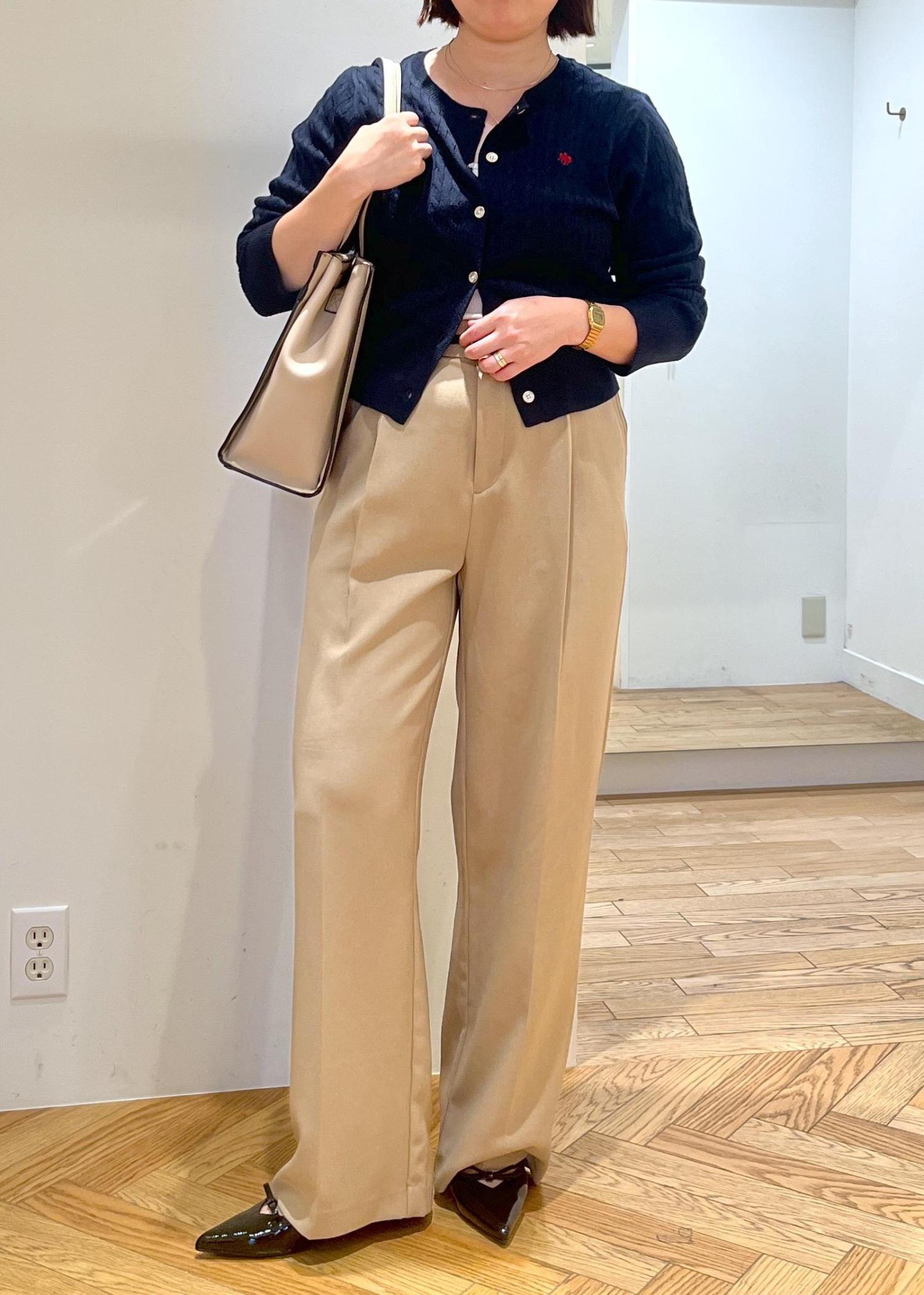 秋っぽさを楽しめるベージュ系のパンツと合わせて、
