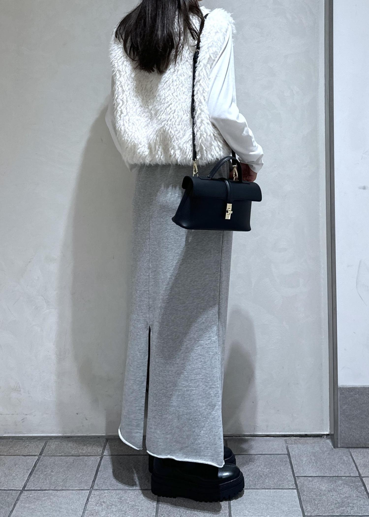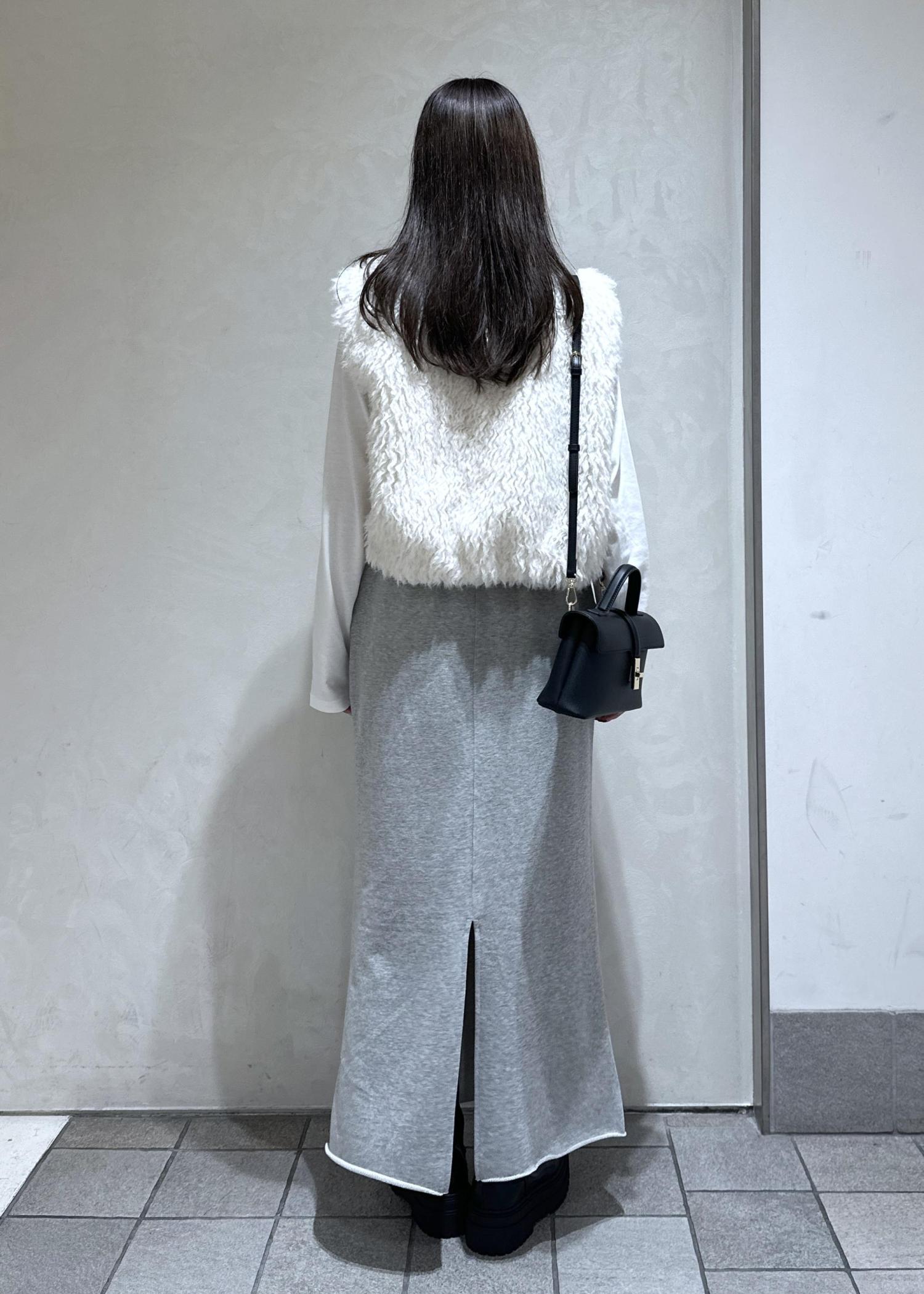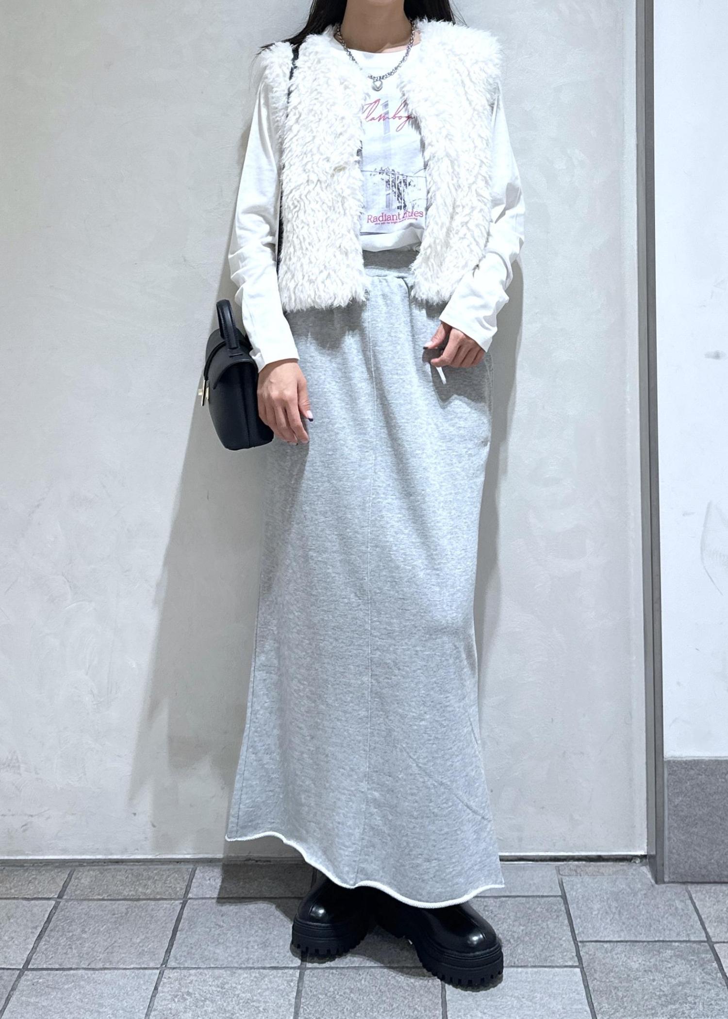 VISミニ裏毛ナロースカートライトグレー / F¥5,489レビュー165cmの私が着用してしっかりロング丈になりました!シルエットがすごく綺麗です!合わせ方次第でキレイめや甘めにもコーディネートできます◎スリットも入っていて歩きやすいです!