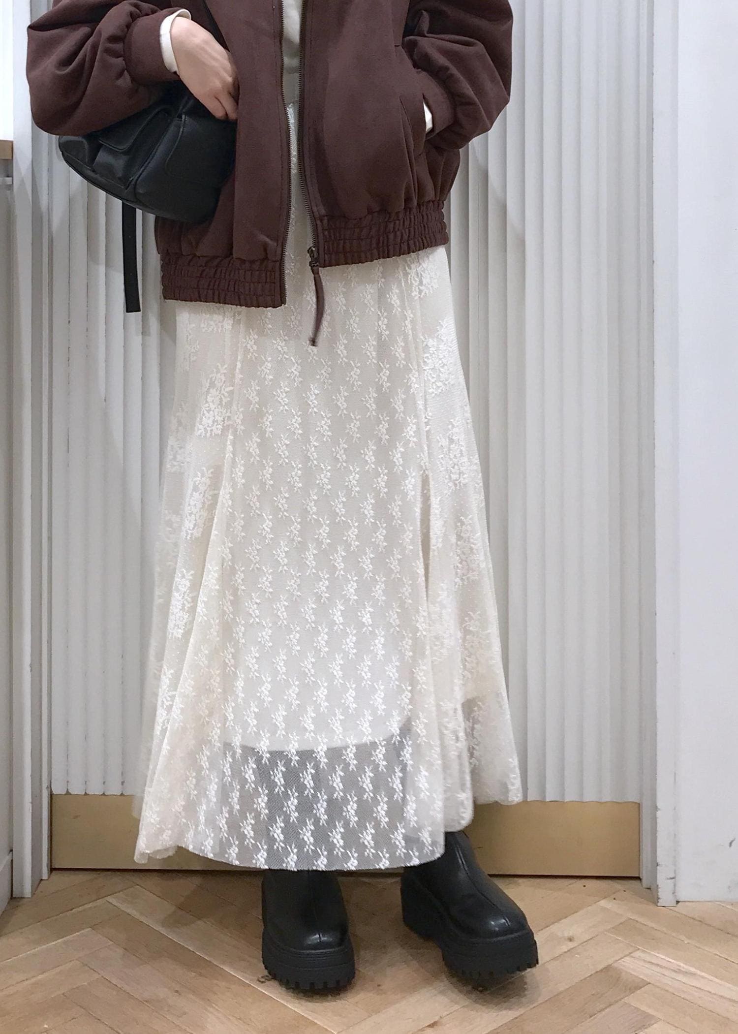 スエードブルゾンとスカート合わせたカジュアルフェミニンコーデです。