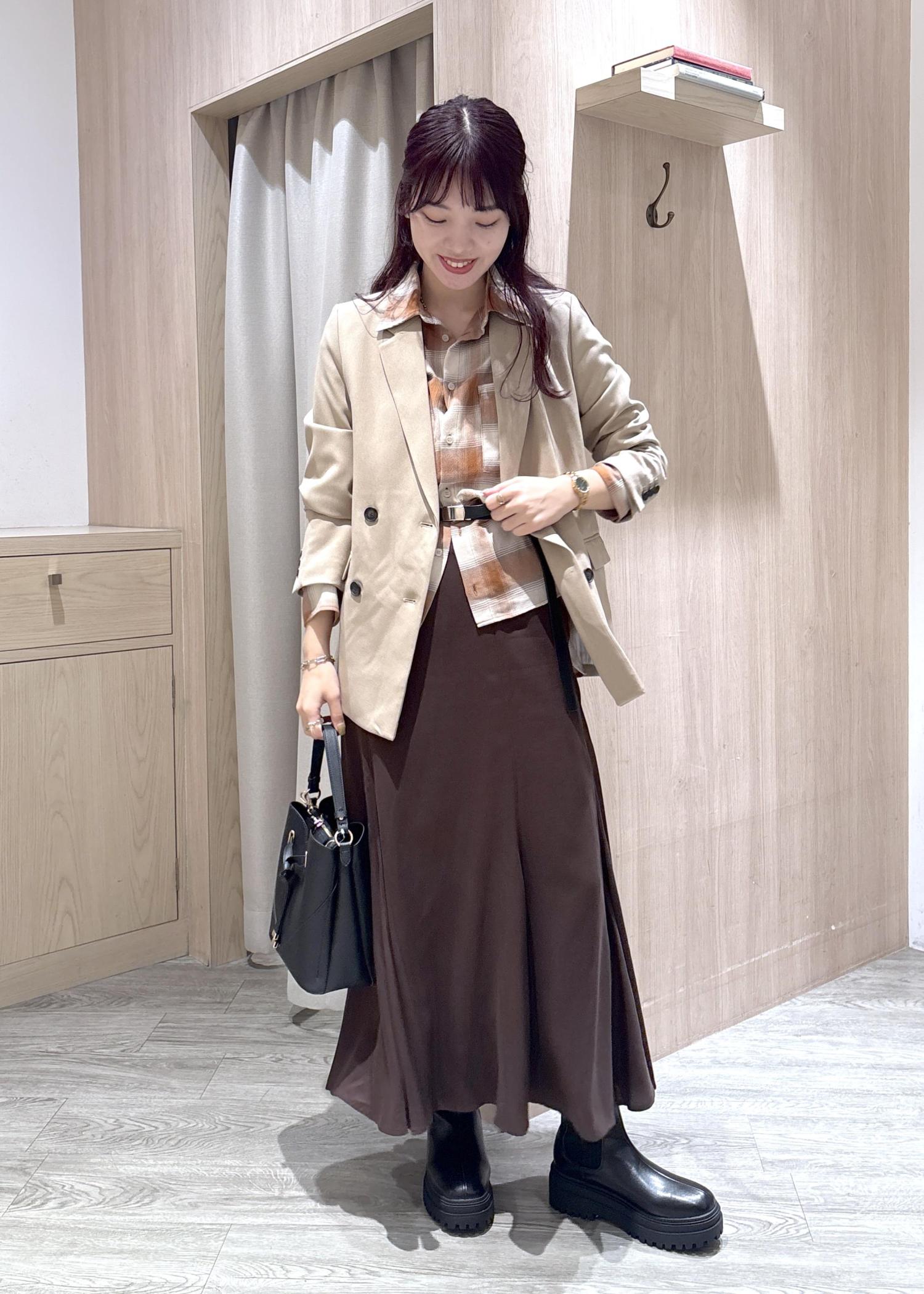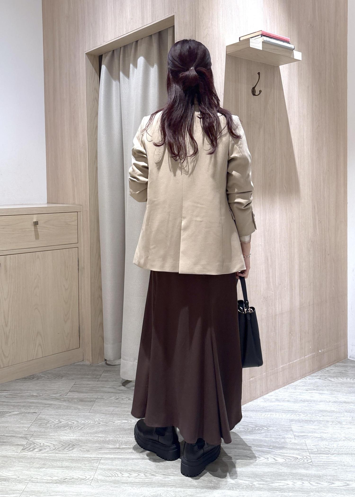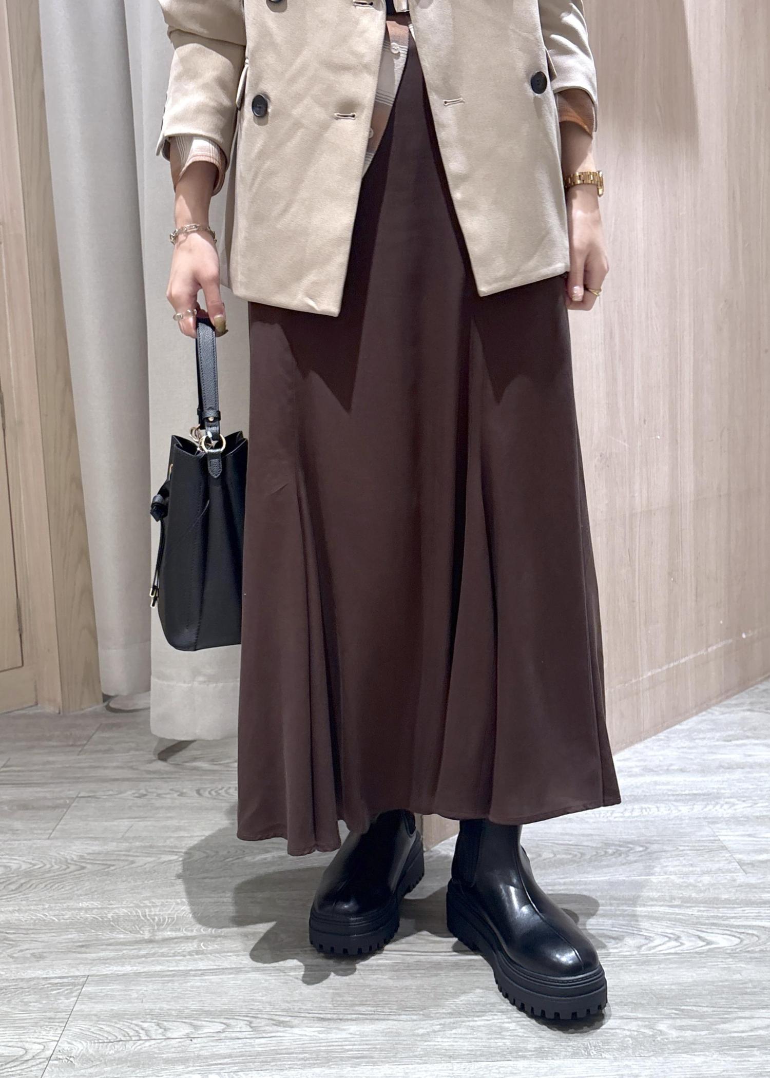 スカートはダークブラウンを合わせることで、足元に向けてカラーが濃ゆくしてグラデーションに◎