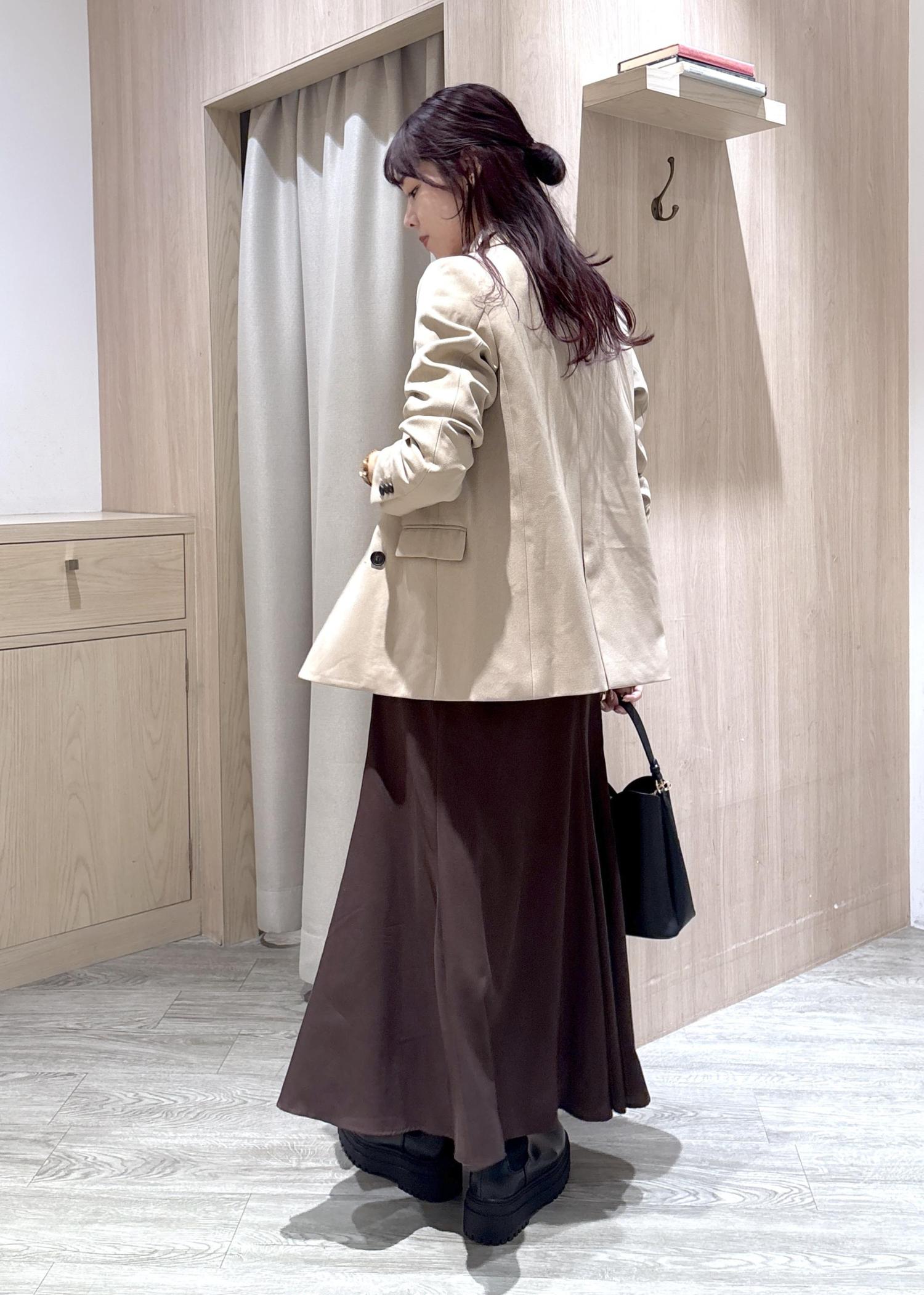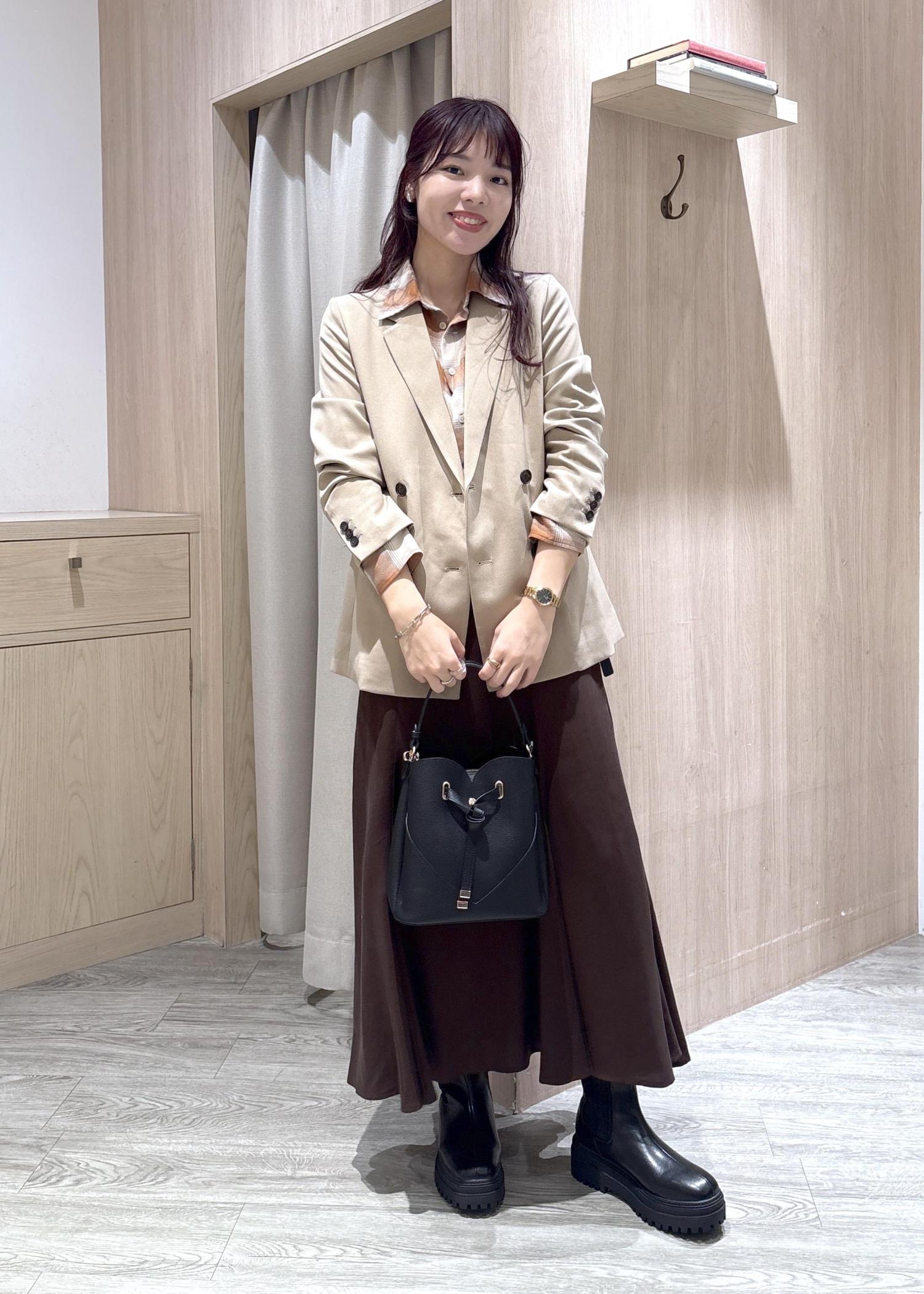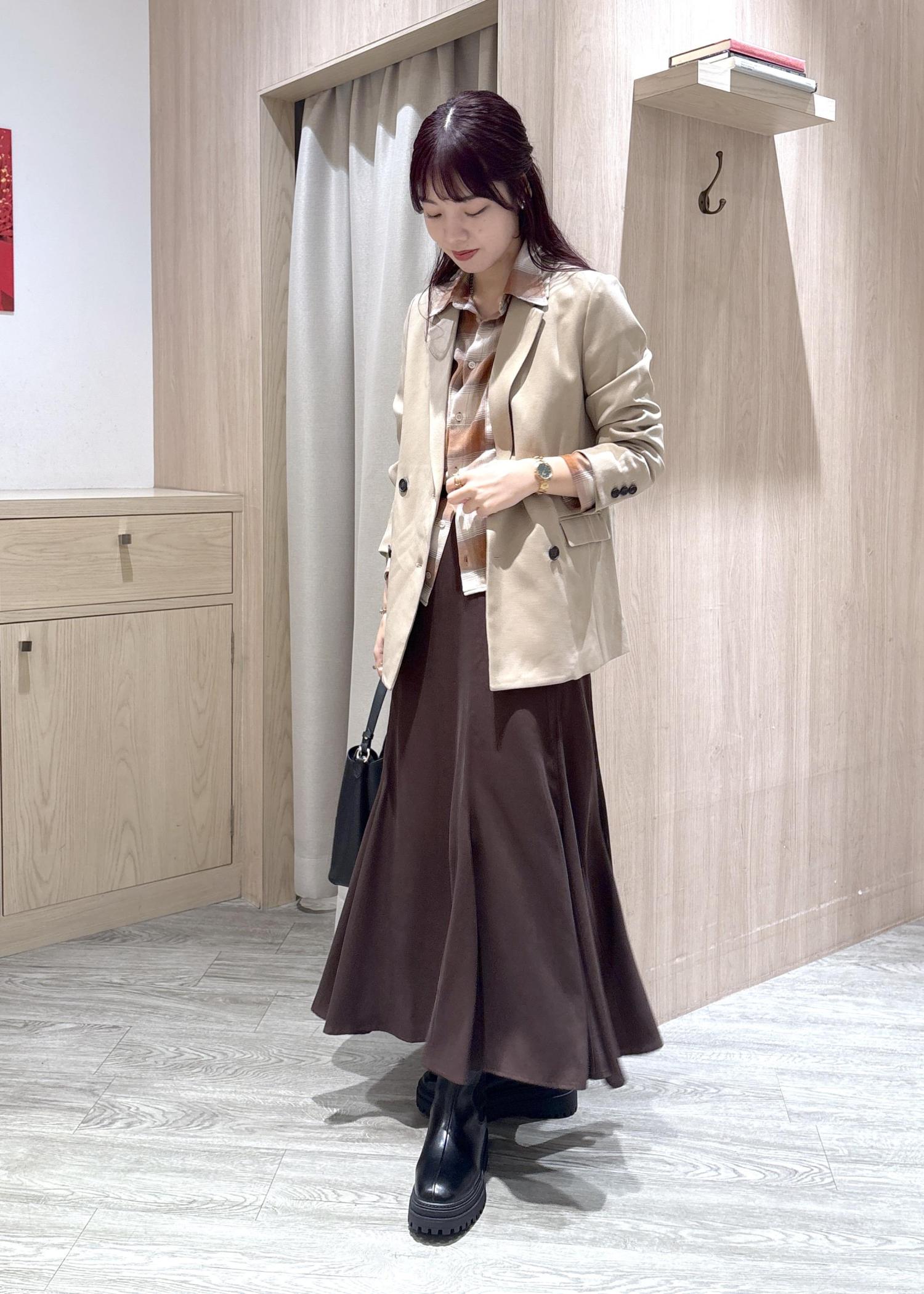 スカートはダークブラウンを合わせることで、足元に向けてカラーが濃ゆくしてグラデーションに◎