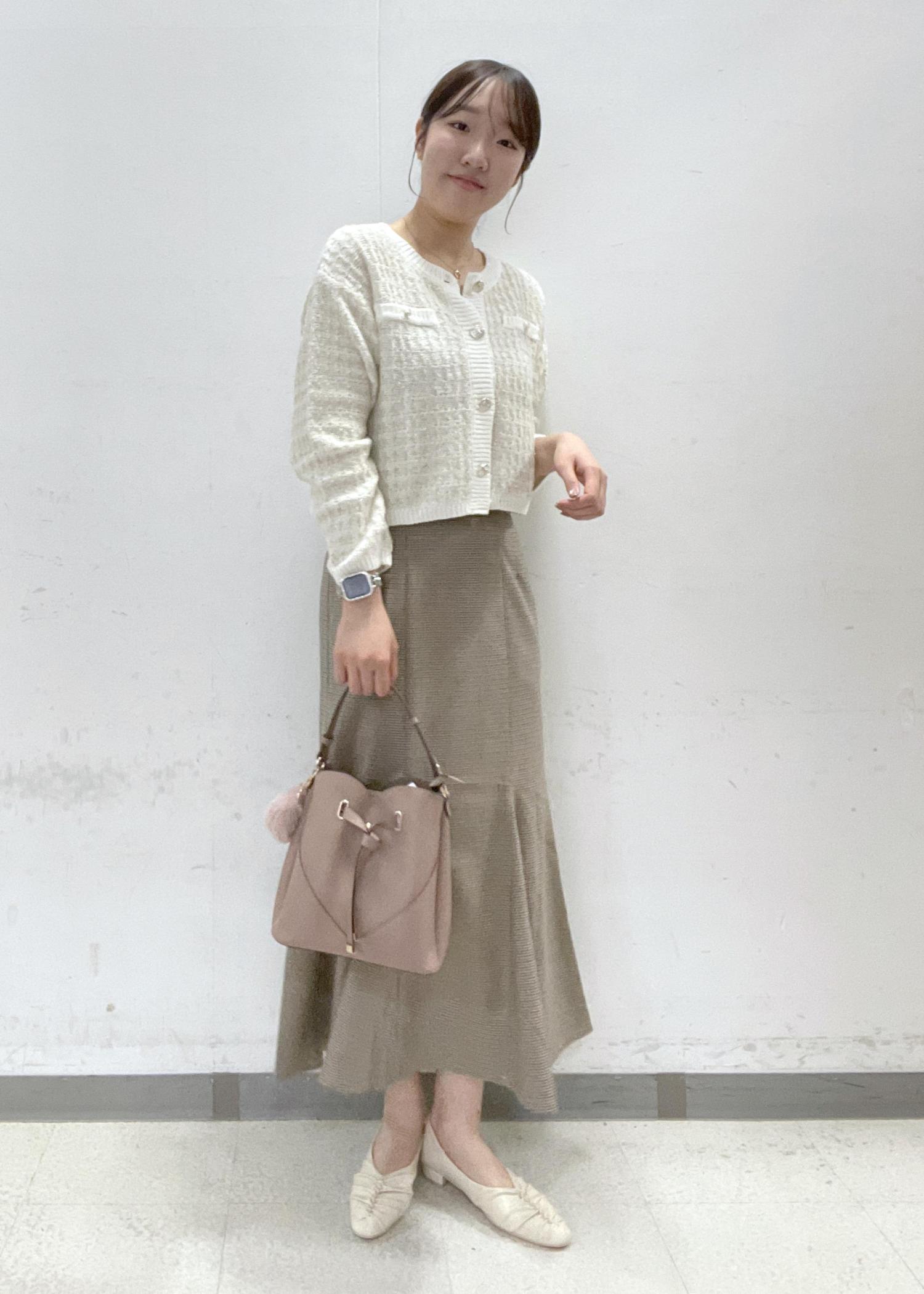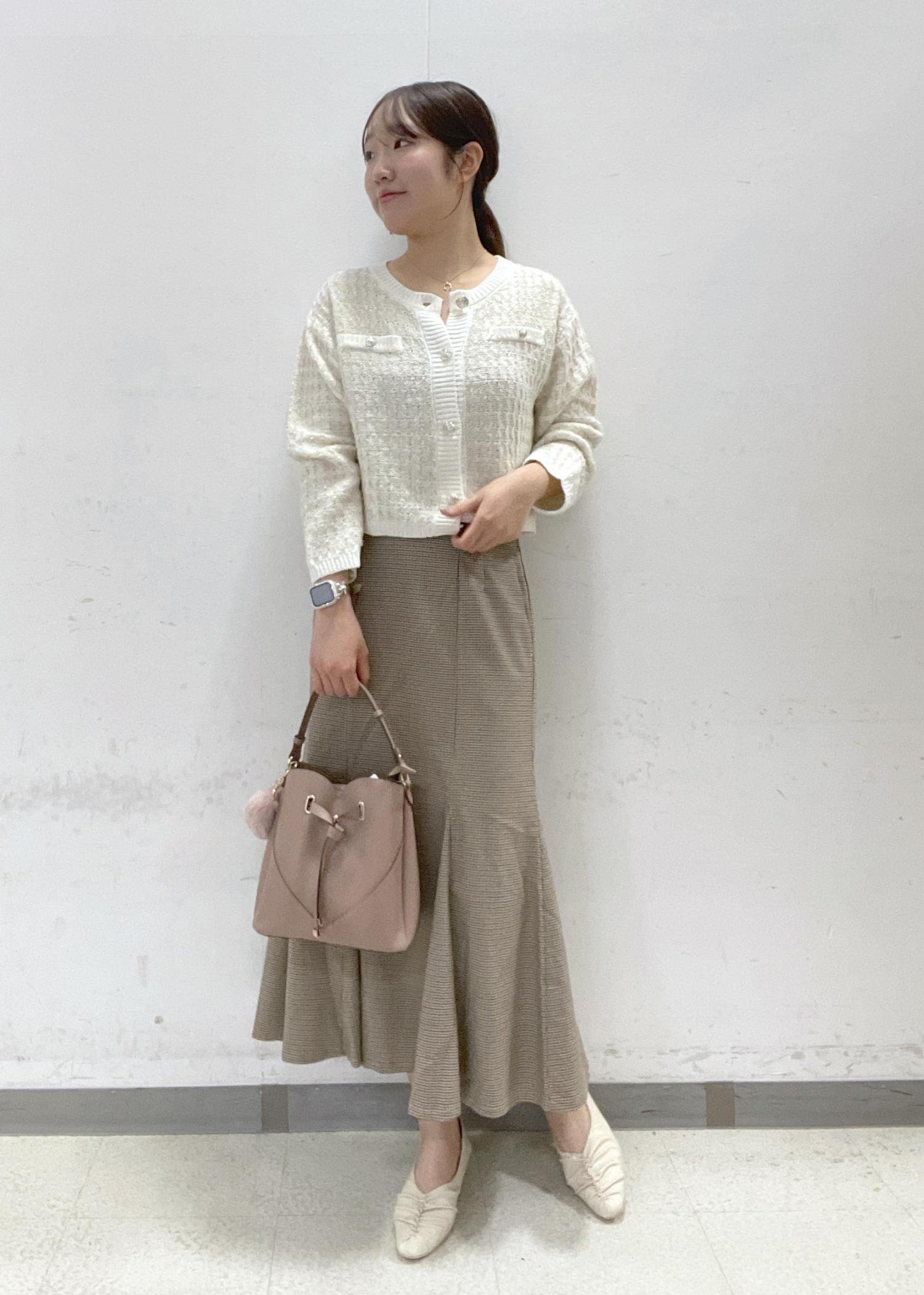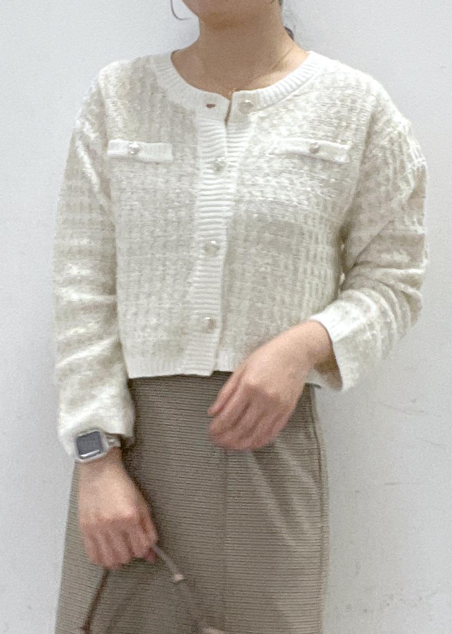 VISファンシーツイードメタルボタンカーディガンオフホワイト / F¥6,589レビュー袖丈は、少し長めのデザインになっていて全体的にゆったりとしたサイズ感でした!!