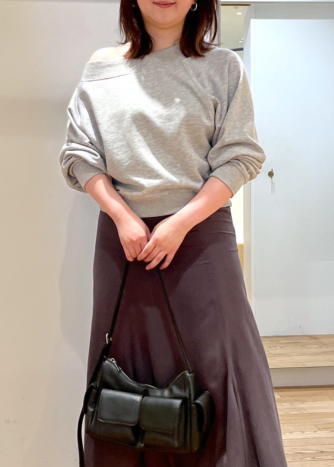 スウェットはワンショルにもなるので肩を少し見せて軽さが出るようにしました。