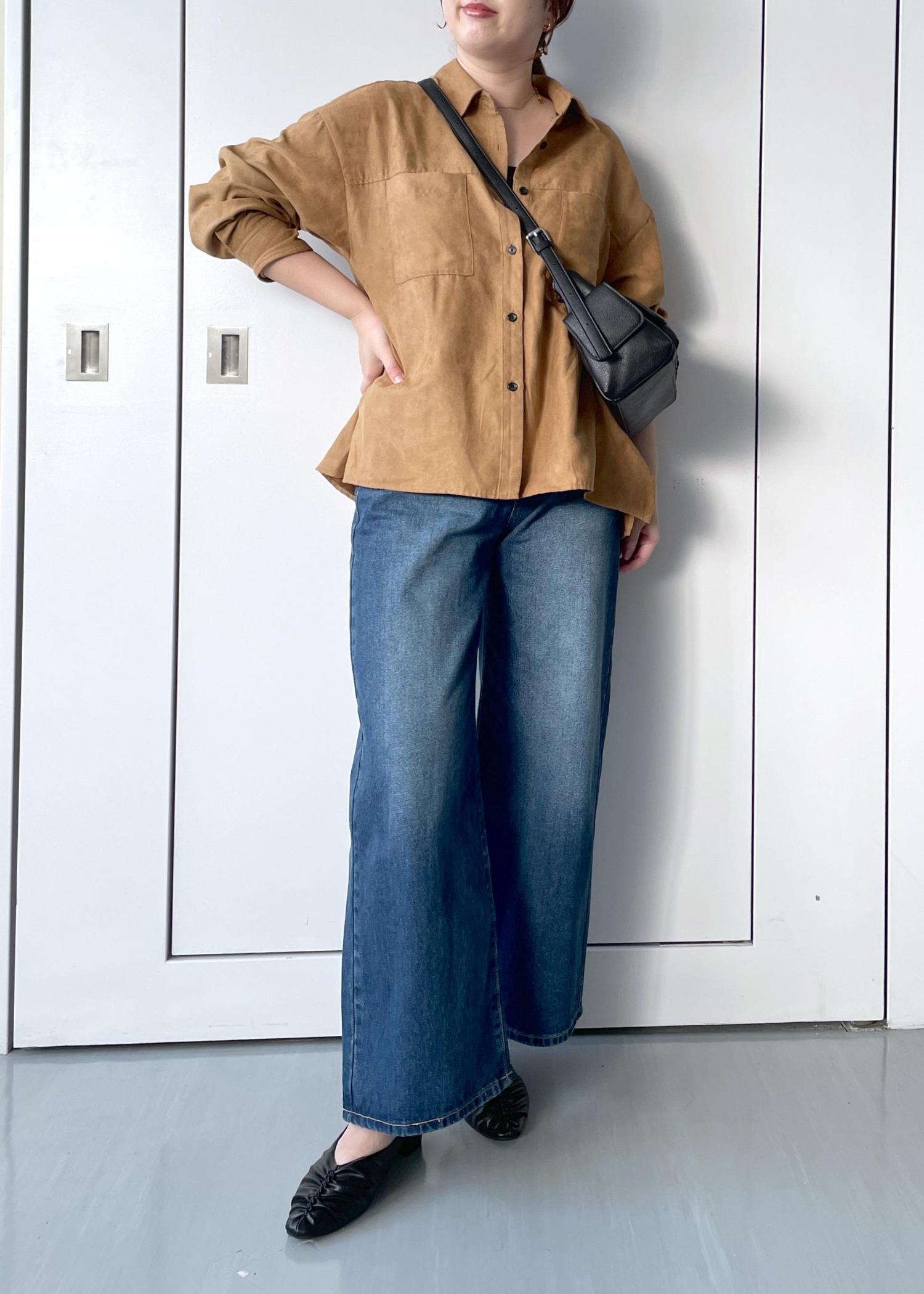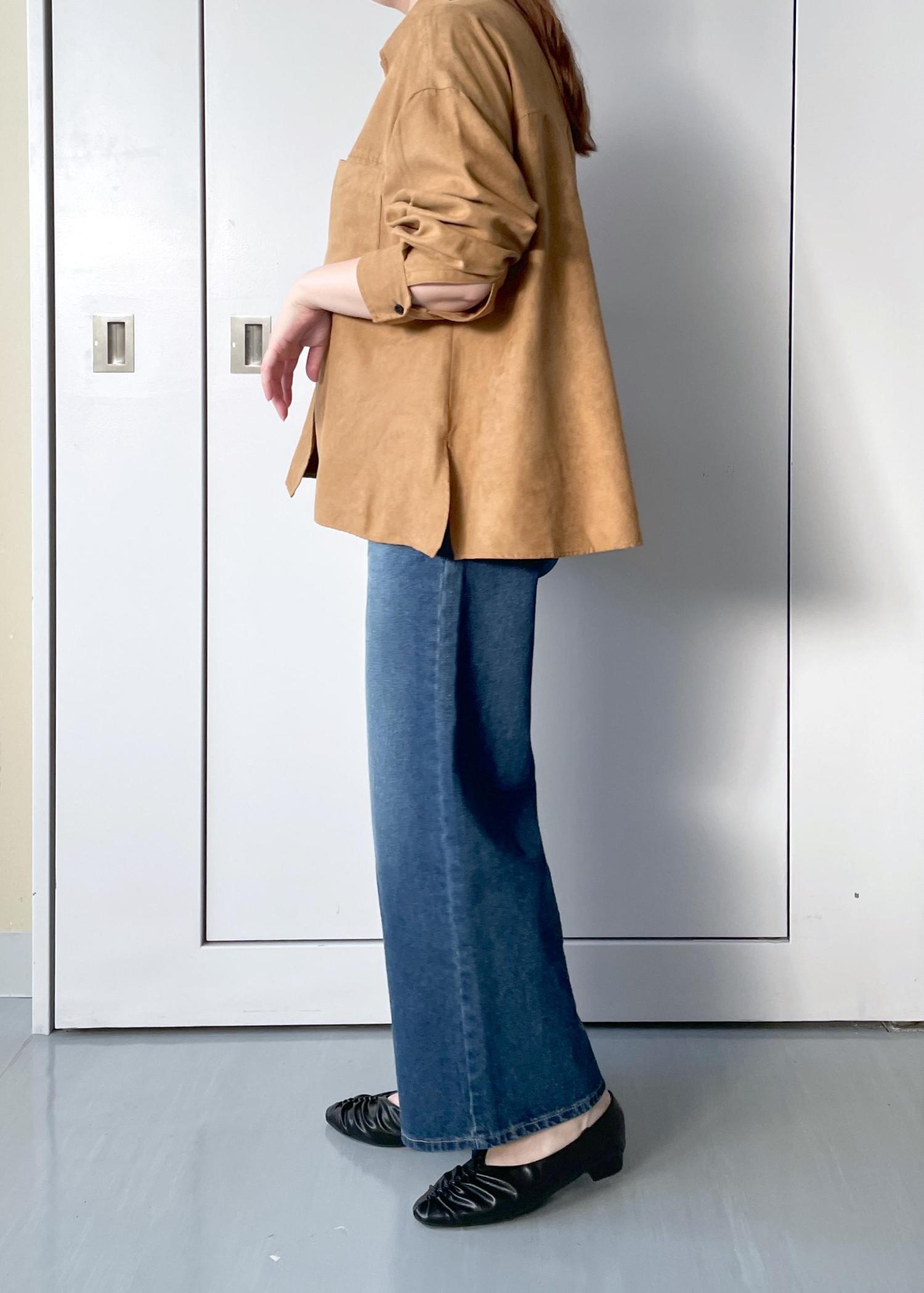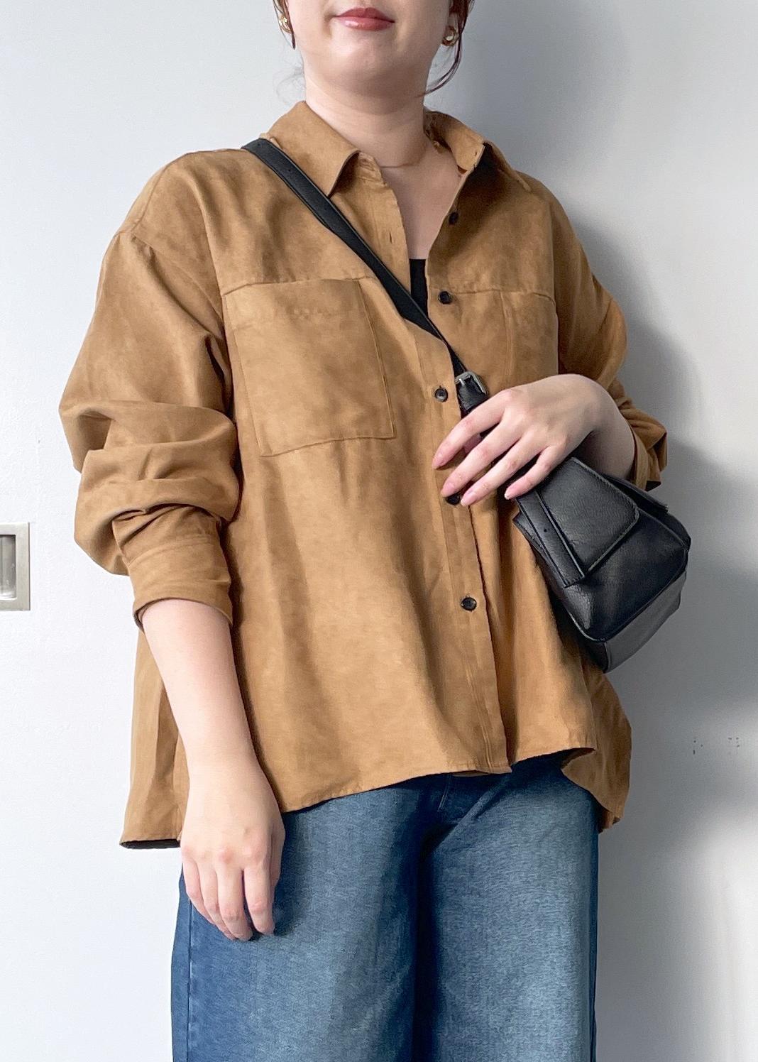 オーバーシルエットですが、程よい厚みのある生地なのでボリュームもですぎずきちんと感があるスエードシャツです。 -