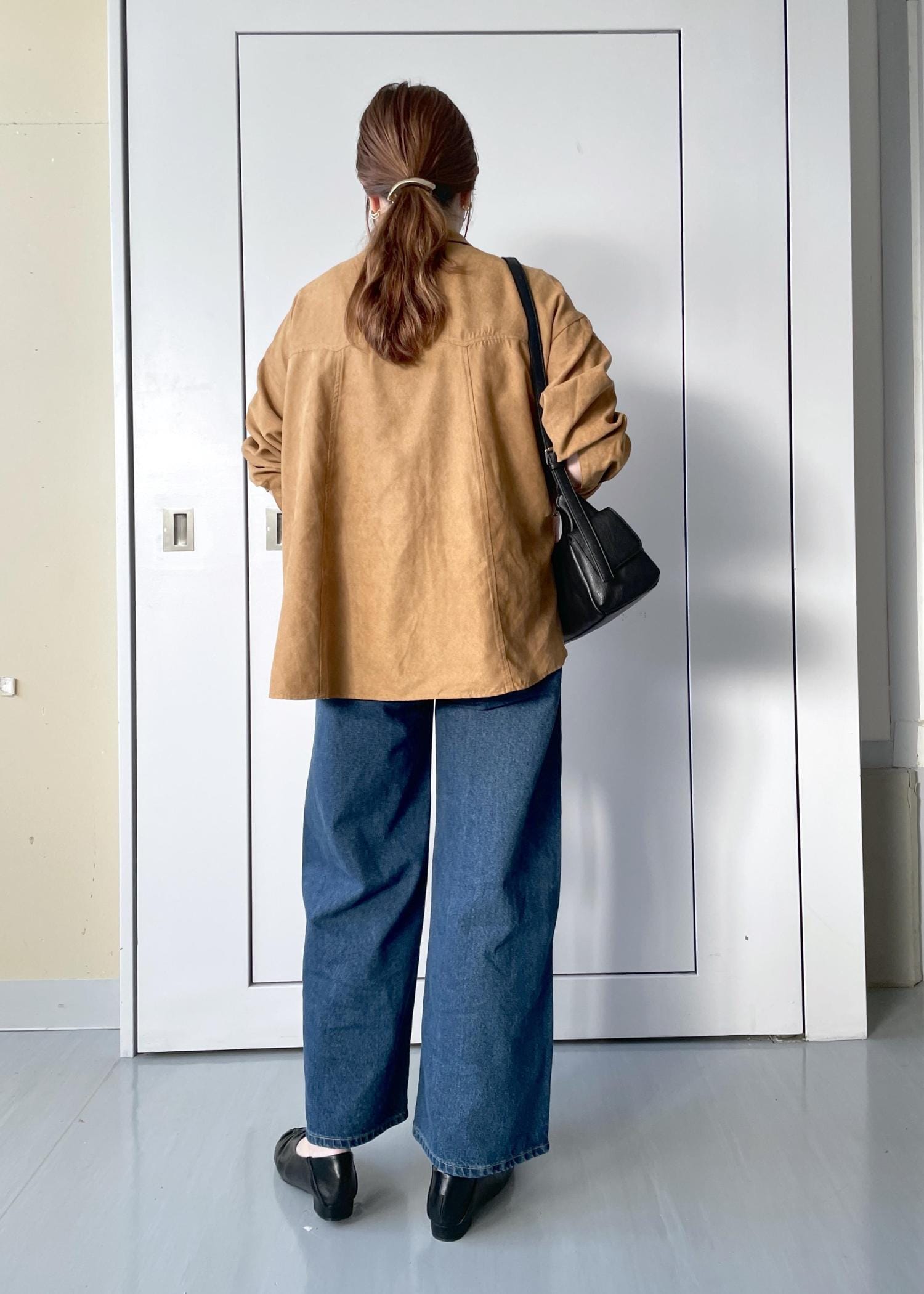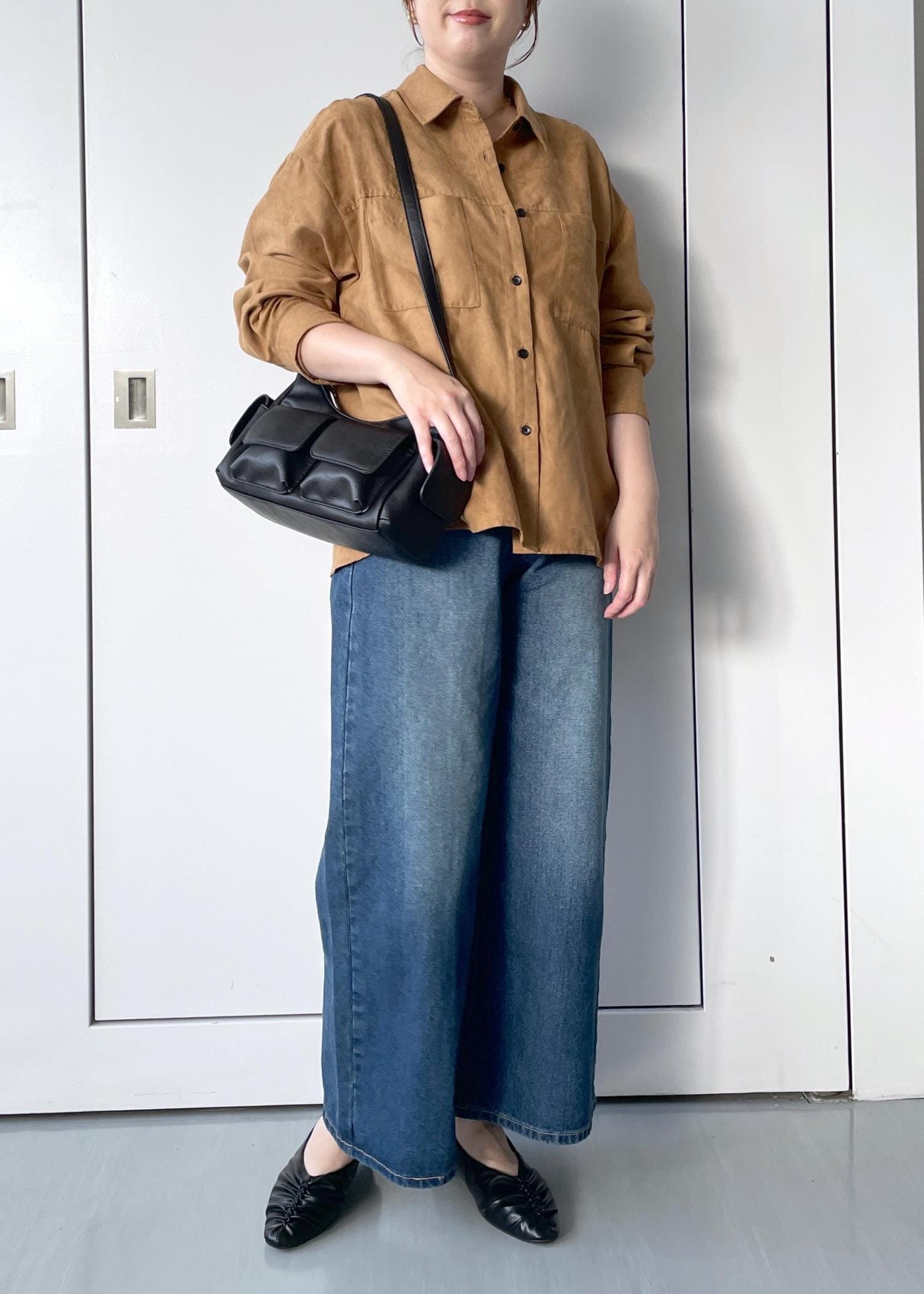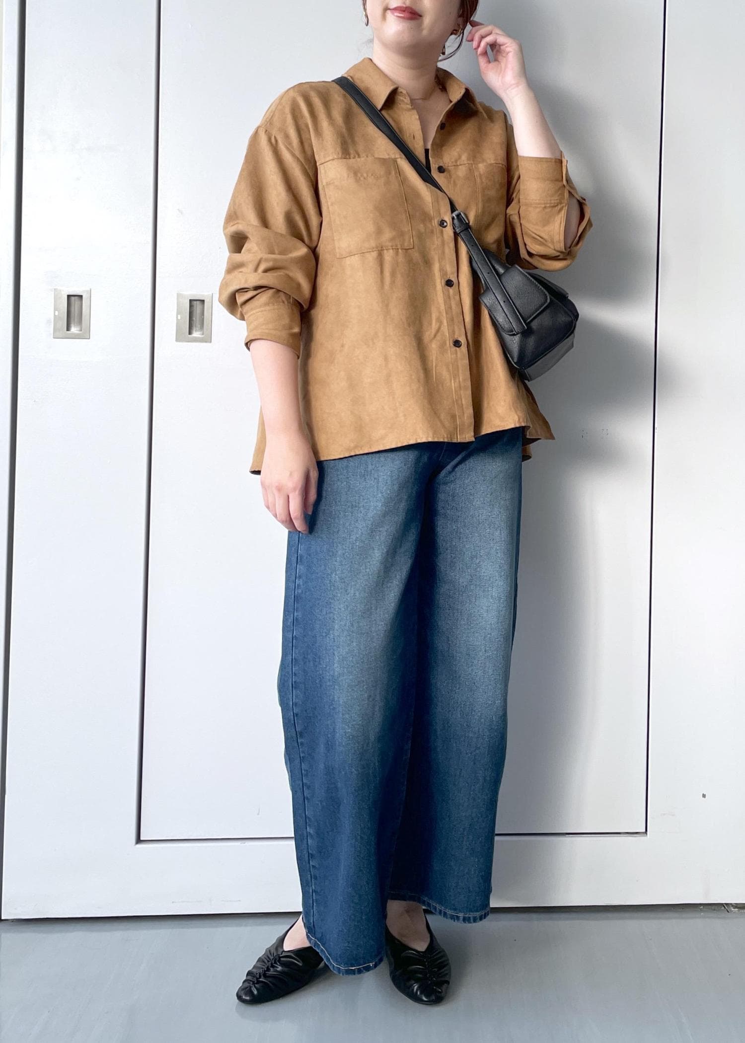 オーバーシルエットですが、程よい厚みのある生地なのでボリュームもですぎずきちんと感があるスエードシャツです。 -