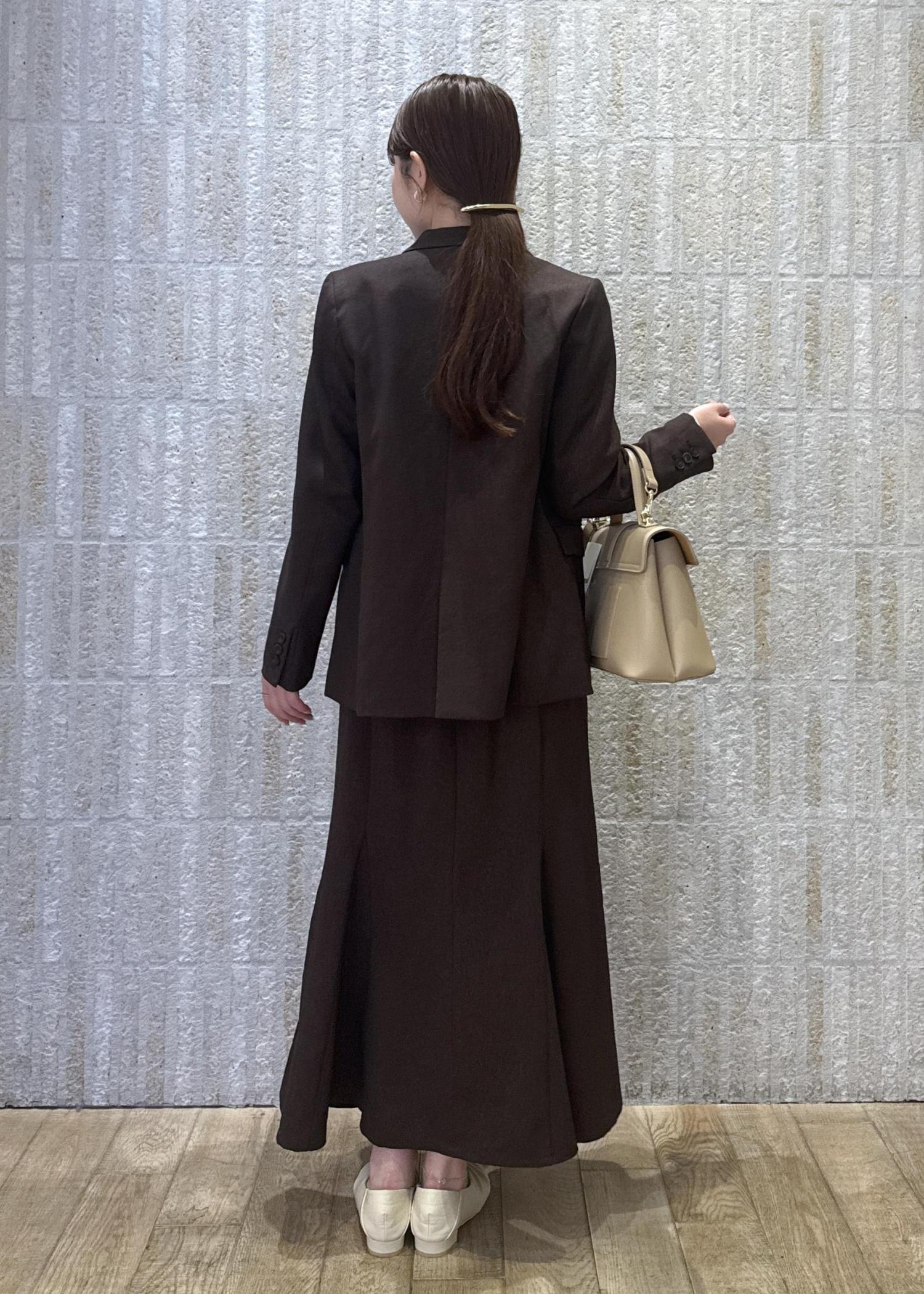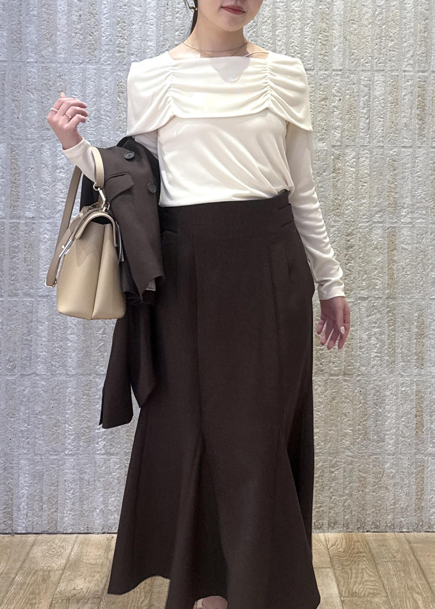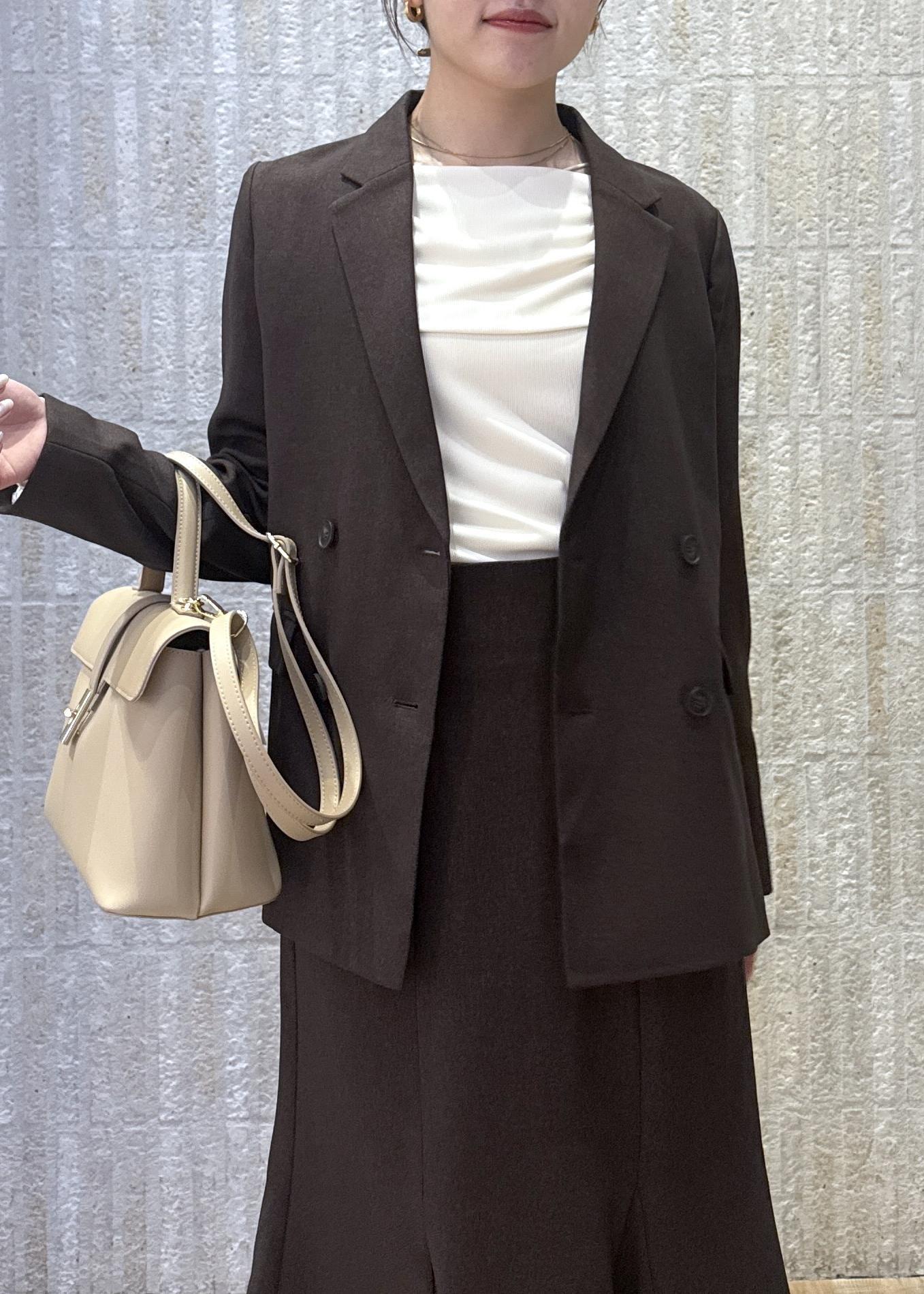 オフショル風ニットトップスに、大人ブラウンのジャケット×スカートスタイルで大人きれいめなスタイリングに!