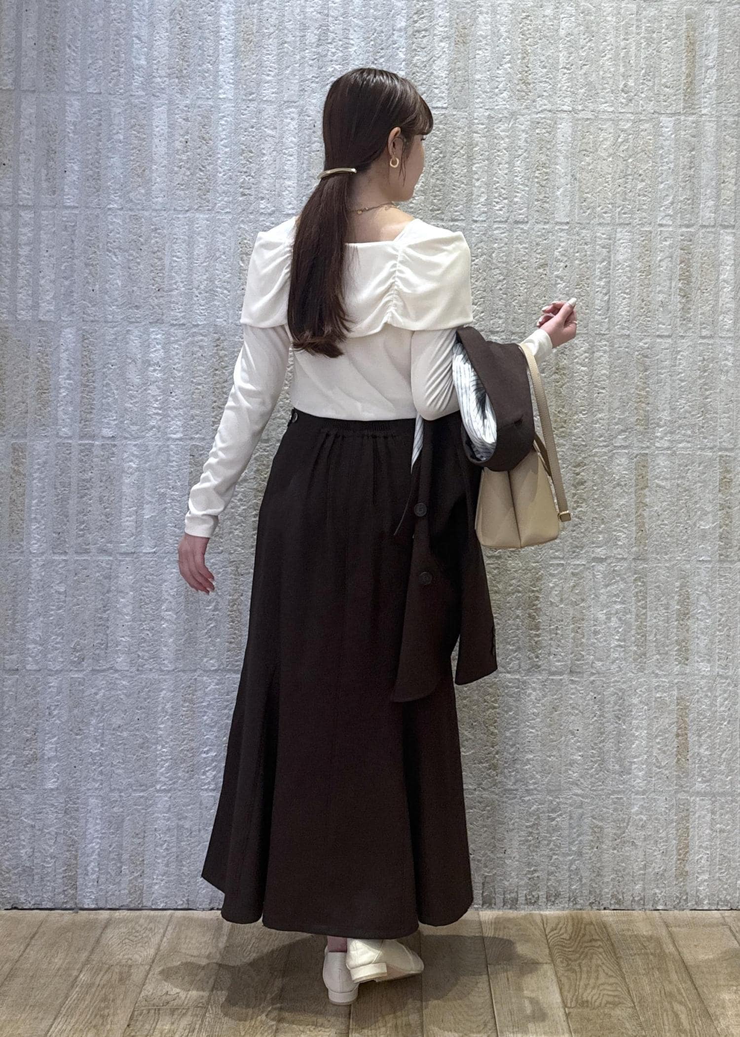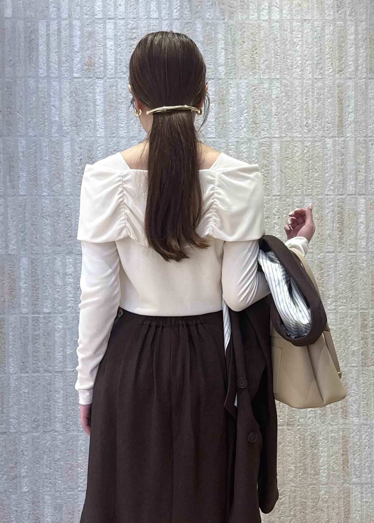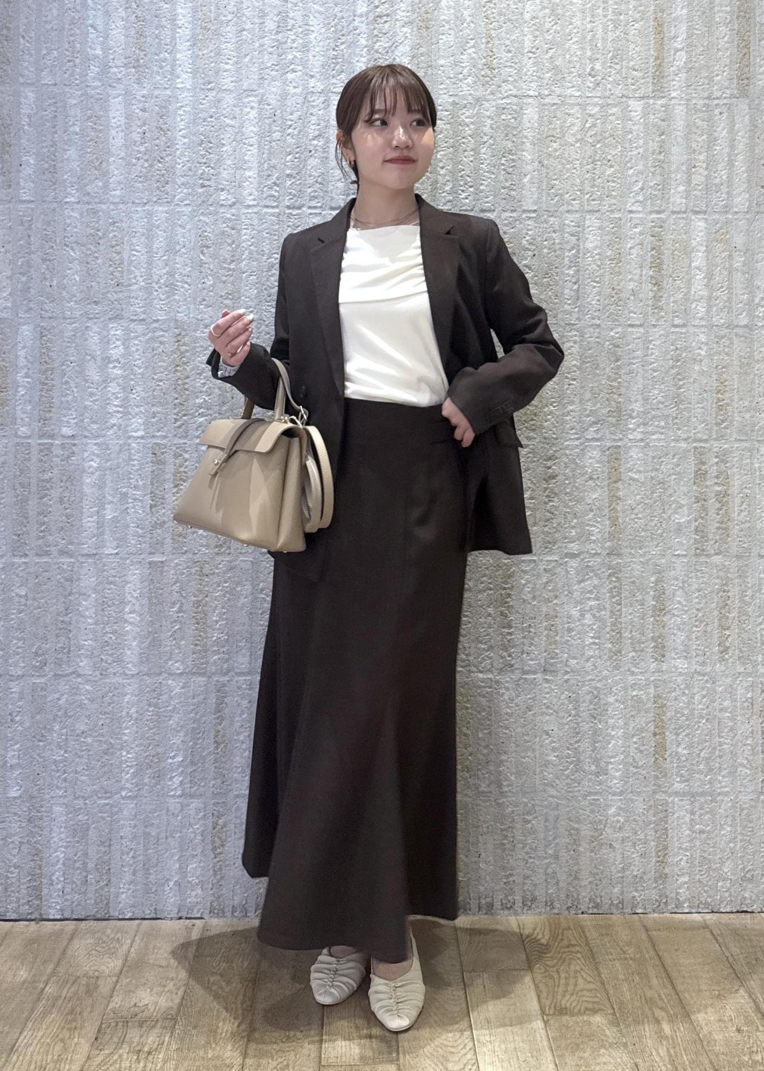 オフショル風ニットトップスに、大人ブラウンのジャケット×スカートスタイルで大人きれいめなスタイリングに!