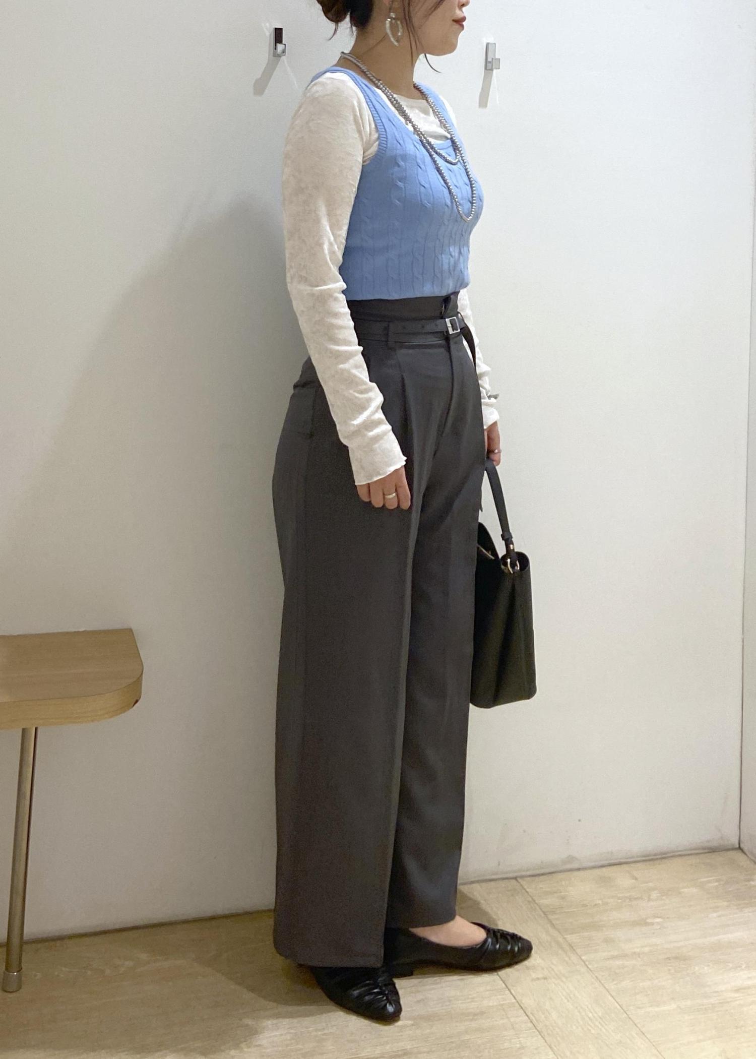 脚のラインを拾いにくいワイドシルエットですが、タックが入っていることでスッキリと見えやすいです。 -