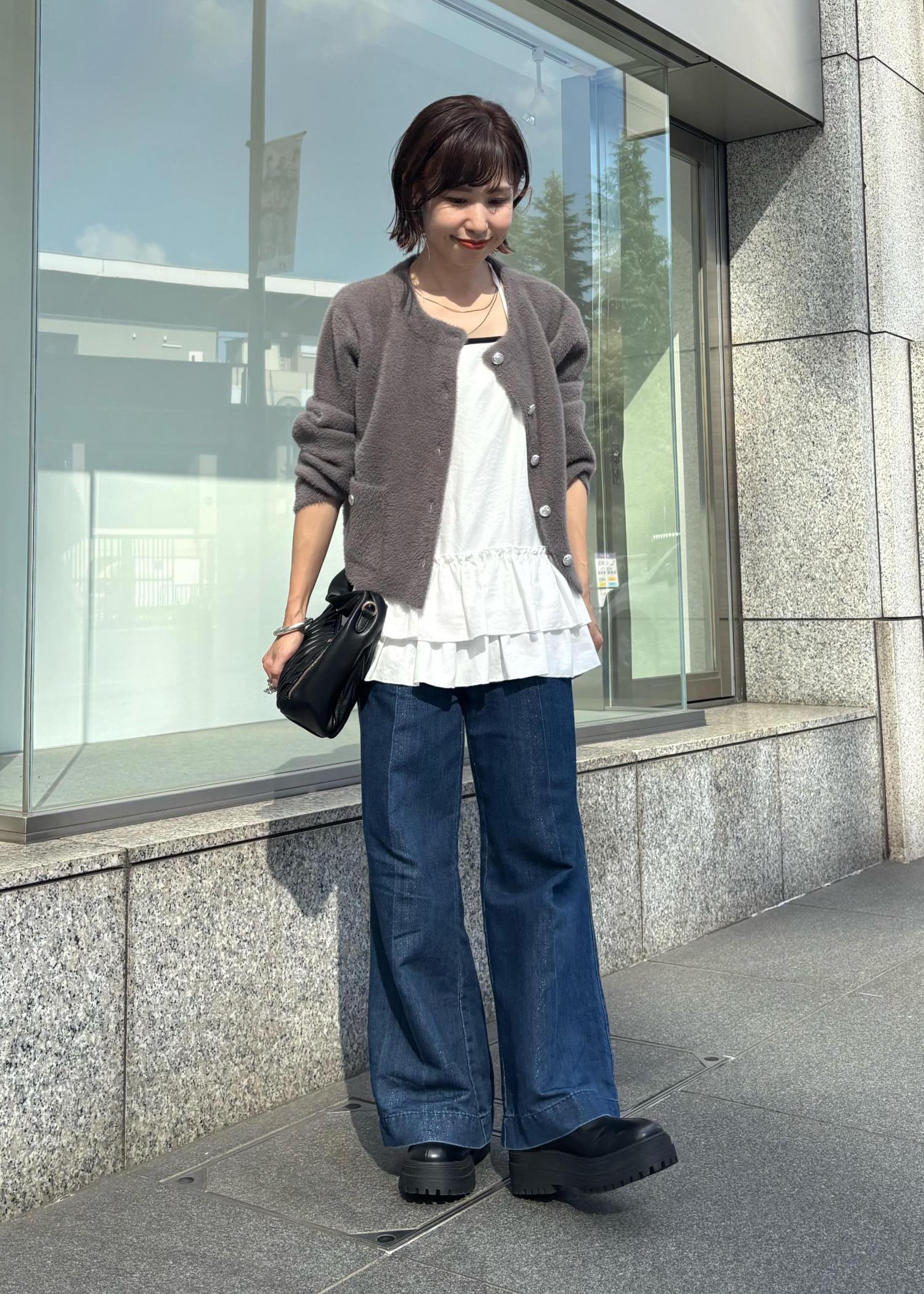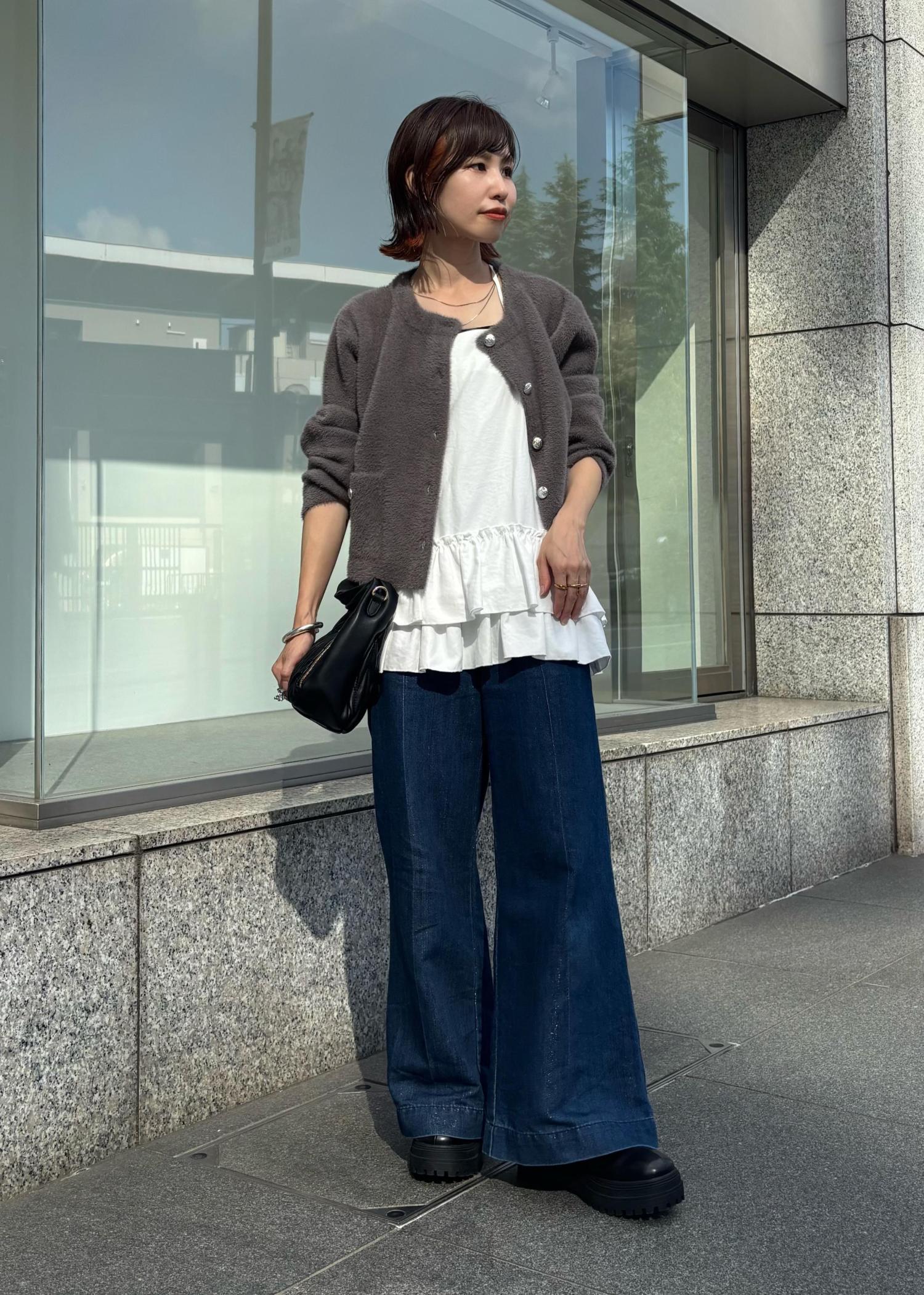 ふわふわ柔らかなミニフェザーカーディガンをポイントに、ティアードキャミをレイヤード、デニムでまとめた大人カジュアルコーデ。足元はブーツでちらっと見せ。秋始めにオススメです。