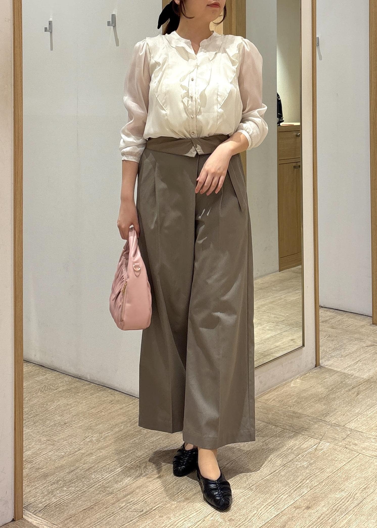 シアー素材+Vに開いたデザインで抜け感があるので、甘さを抑えつつすっきり見せられます。 -