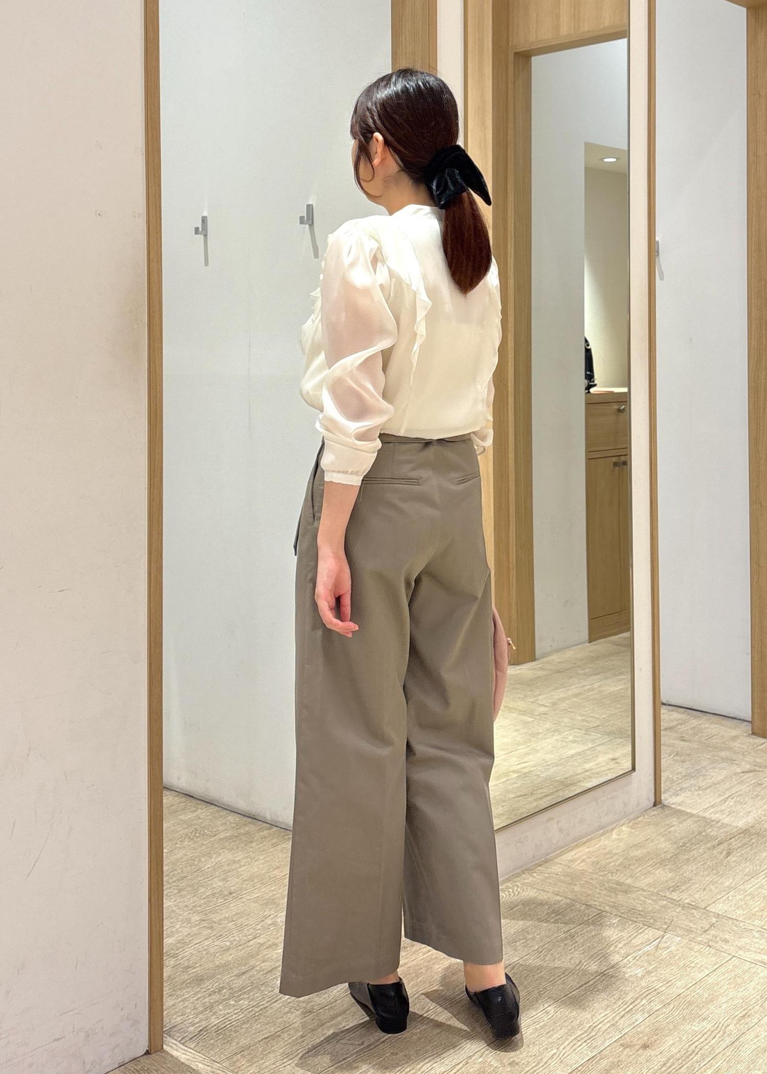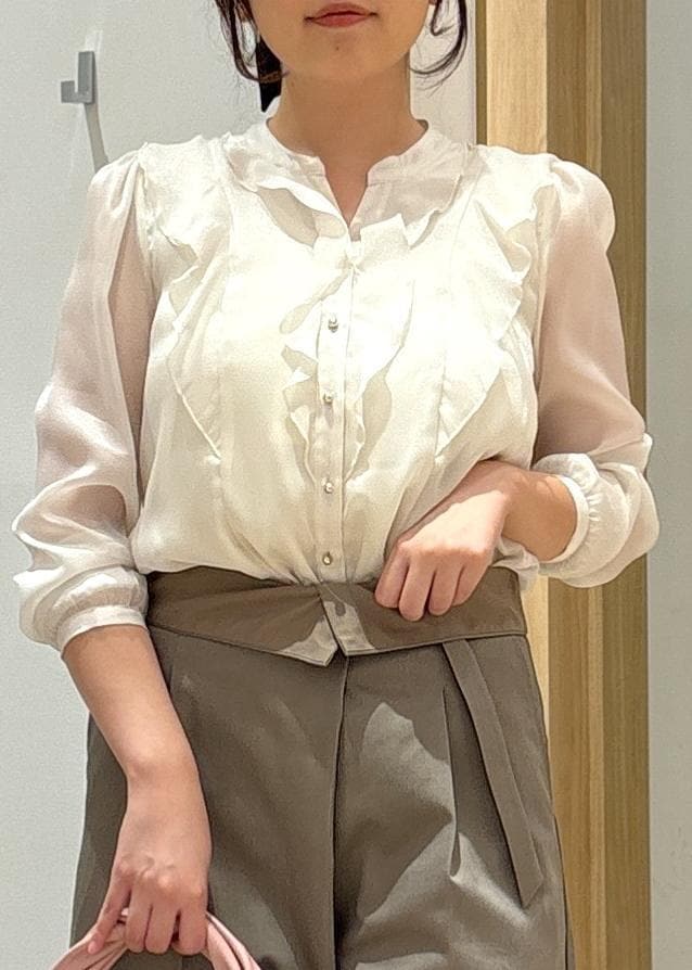 VISシアーラッフルブラウス/イージーケアキナリ / F¥3,842レビューシアー感のあるホワイトブラウス。胸元のフリルとくるみボタンが女性らしく、程よい甘さをプラス。透け感のある袖が軽やかさを演出しています。