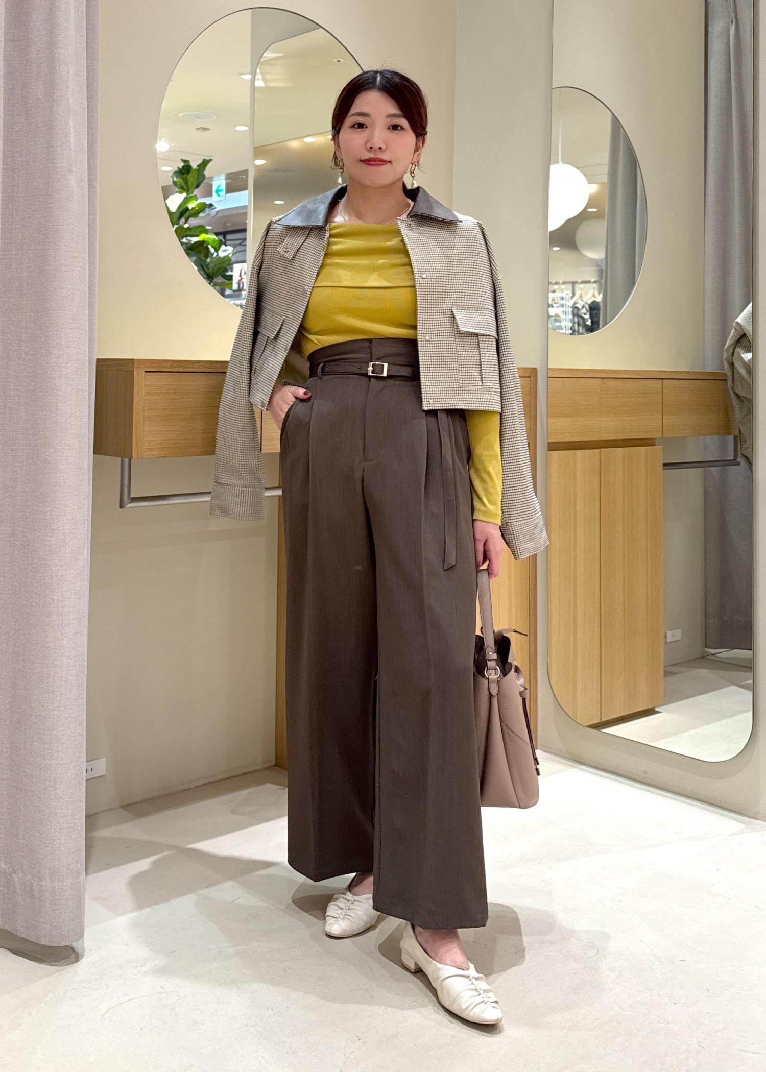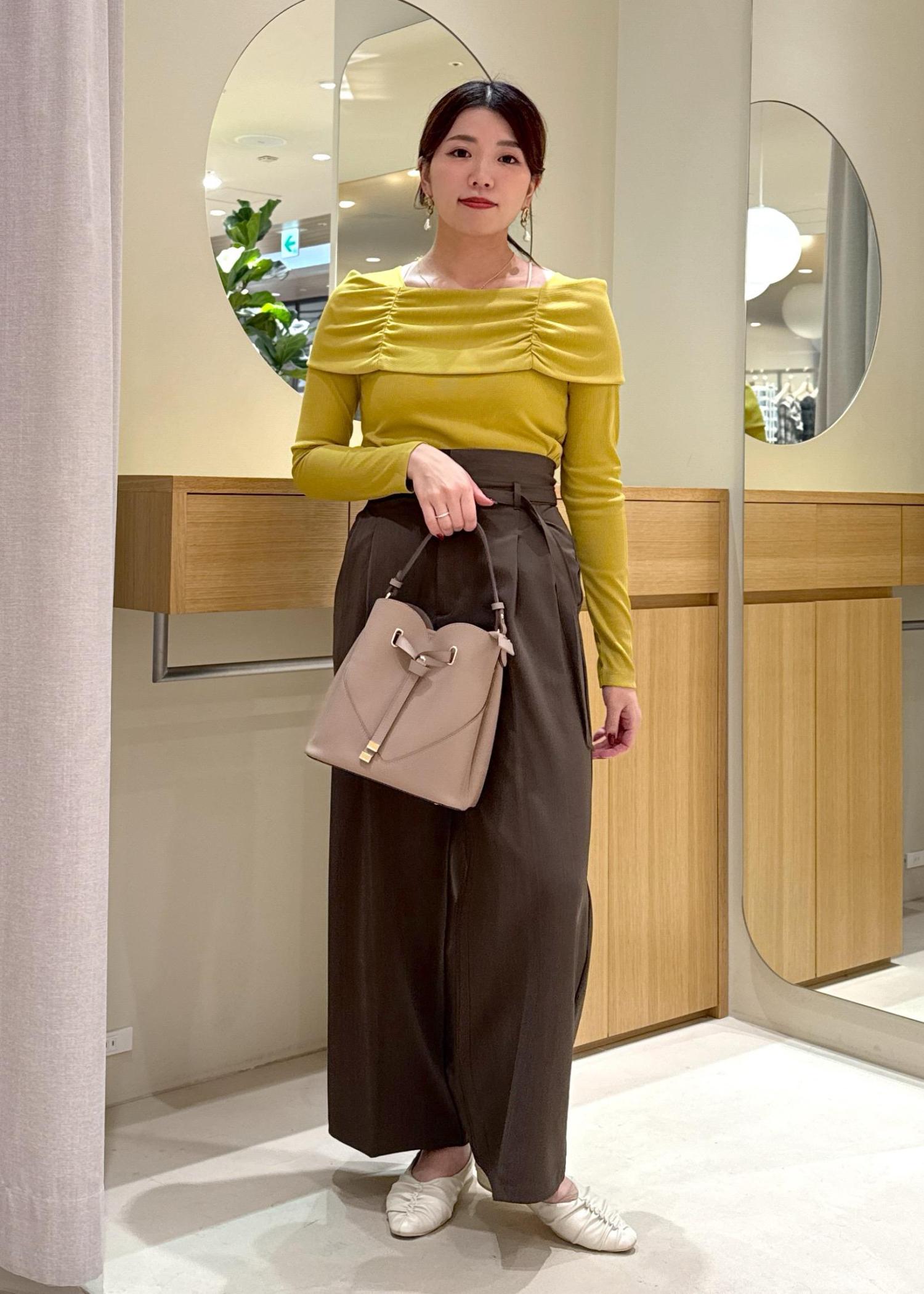 秋らしいマスタードカラーのデザイントップスを差し色に