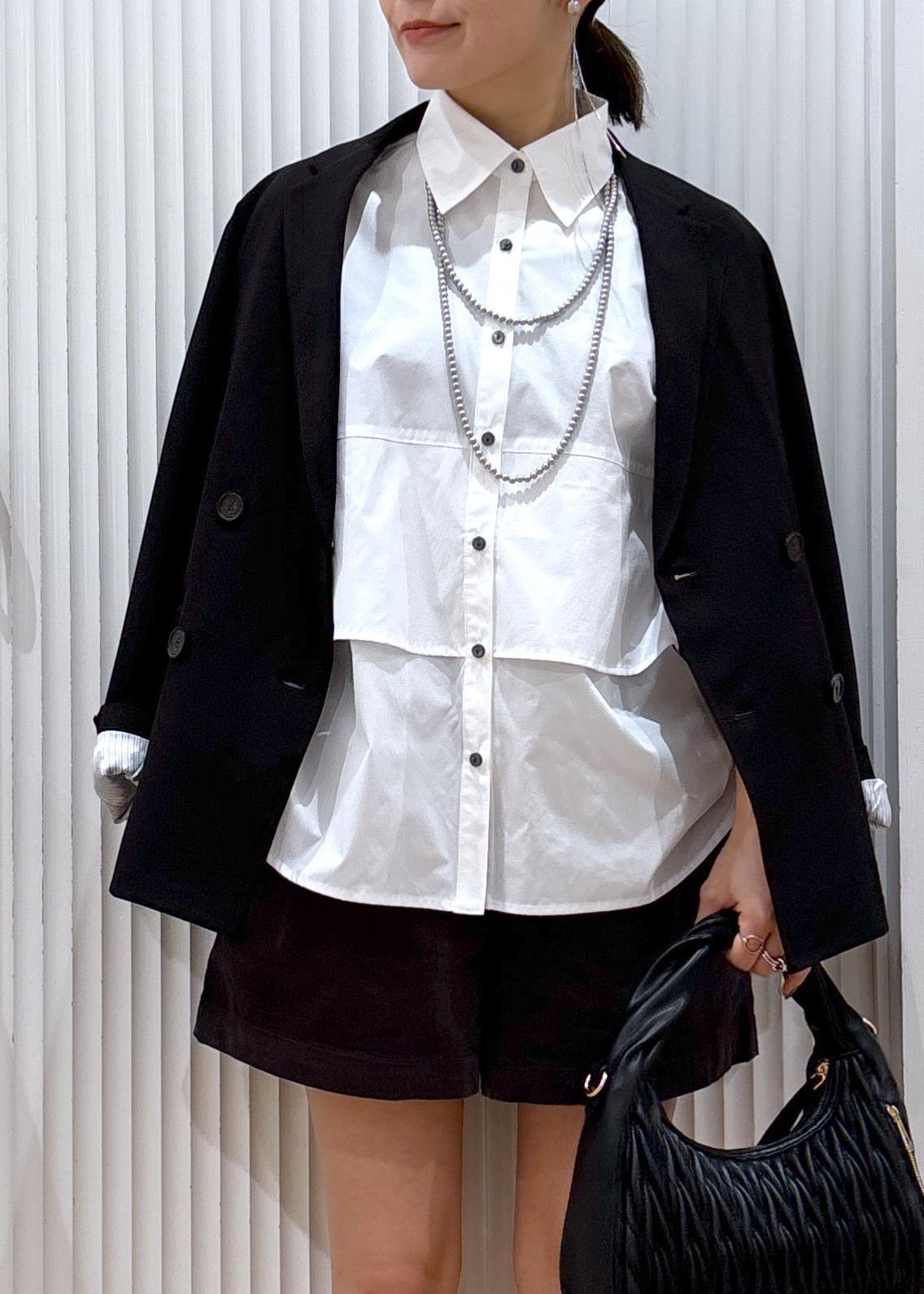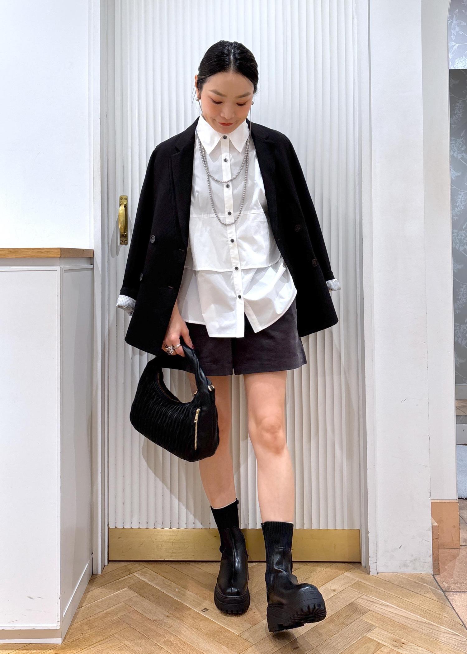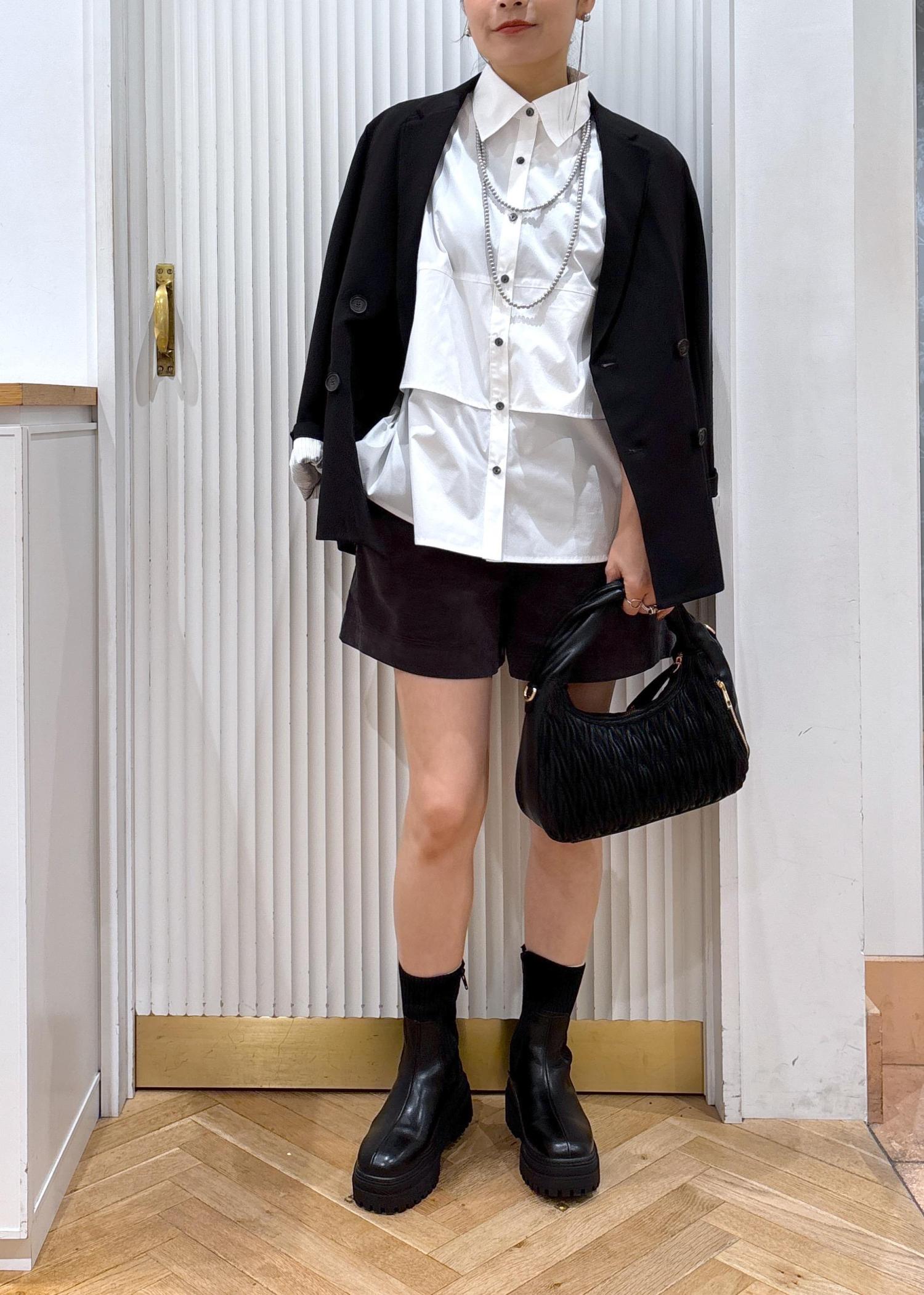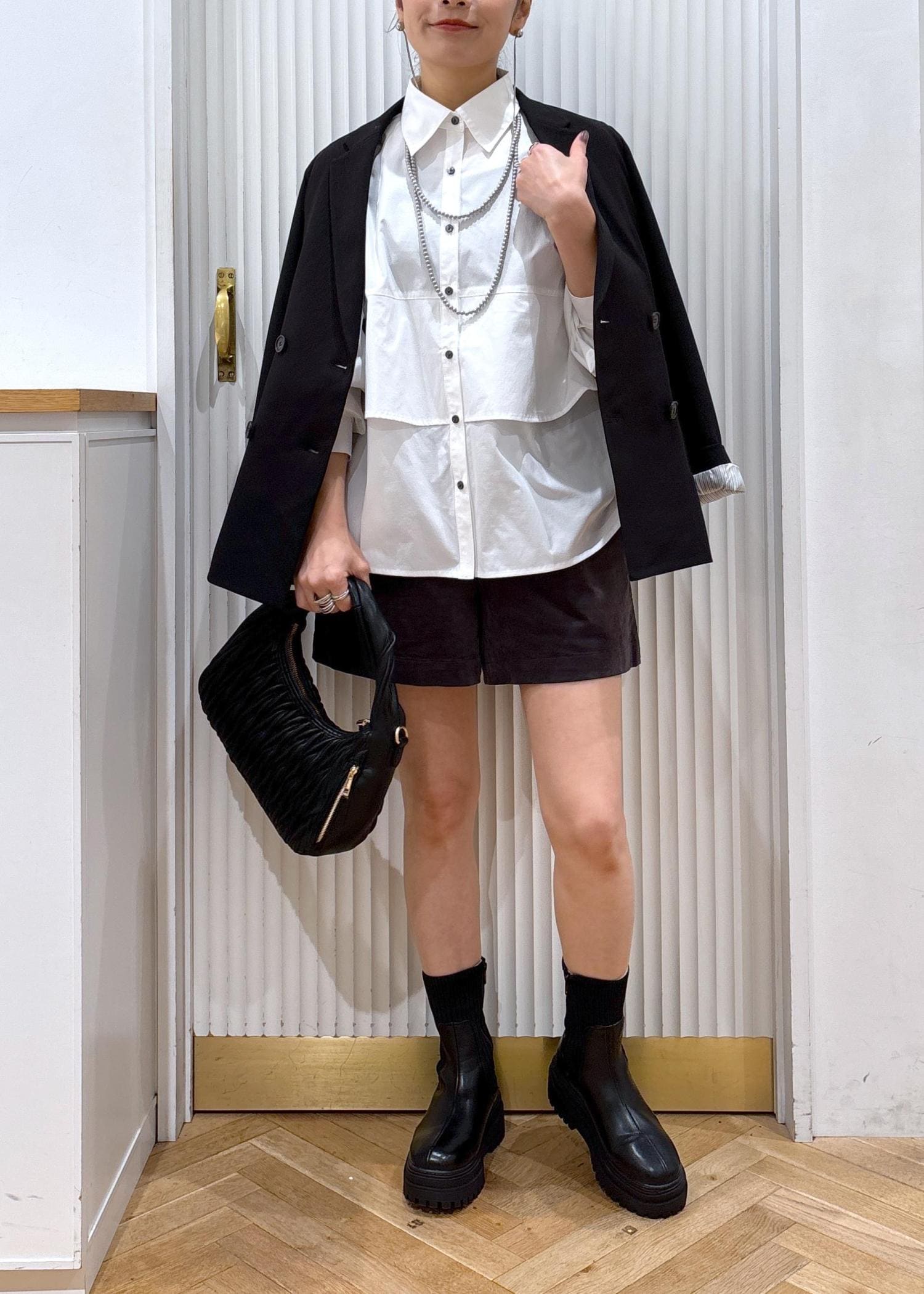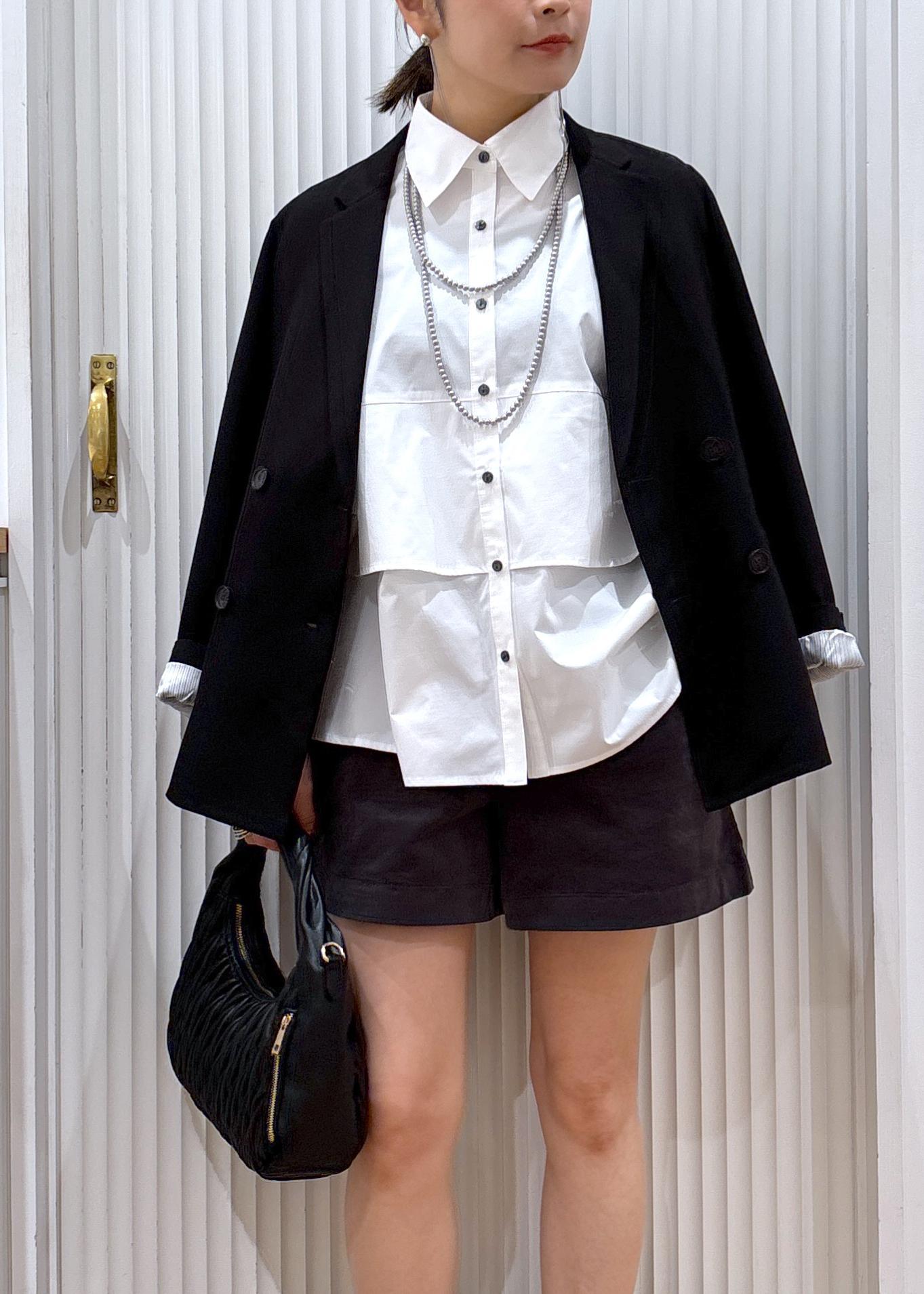 ショートパンツとジャケットの肩掛けで程よく肩の力が抜けたきちんとスタイルに。